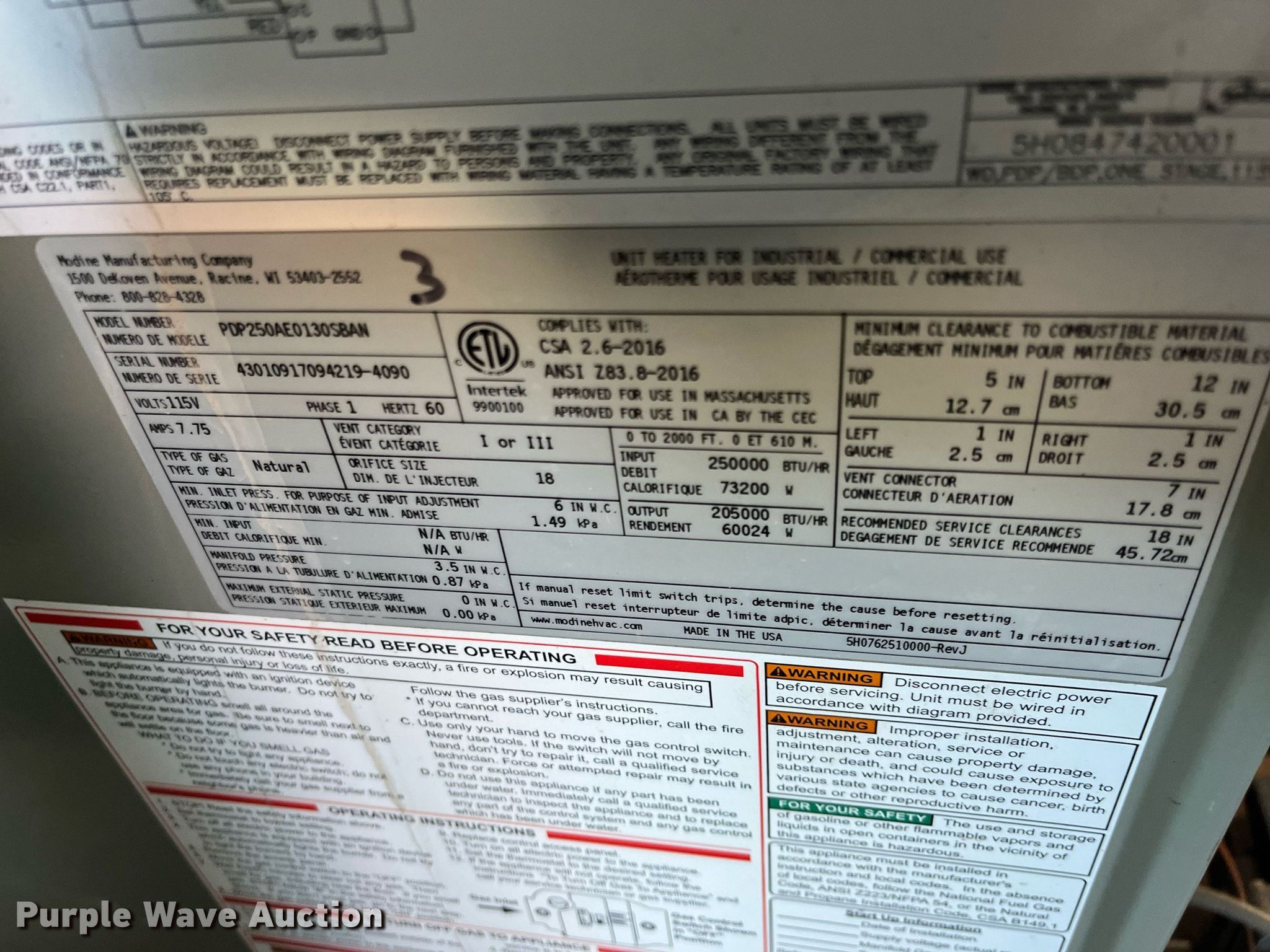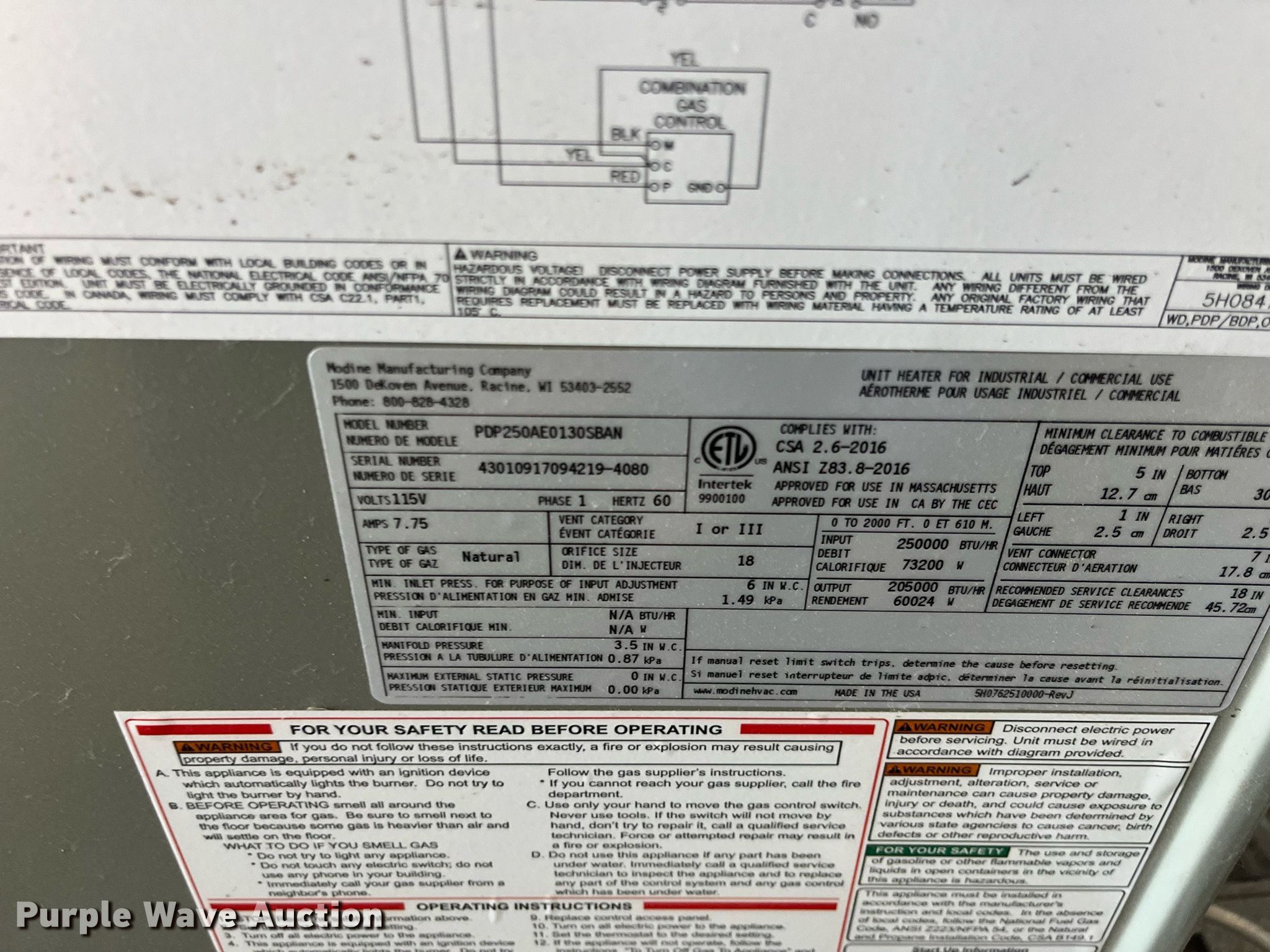 Purple Wave is selling a used Appliances in Kansas. This item is a (3) Modine PDP250AE0130SBAN furnaces with the following: 250,000 BTU input, 205,000 BTU output, 110V, Natural gas fired, KDOT ID: 50592, 50593, 50594