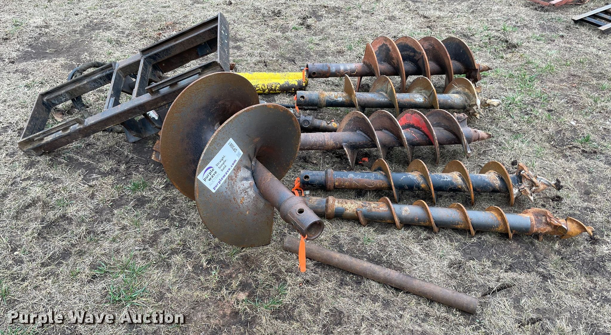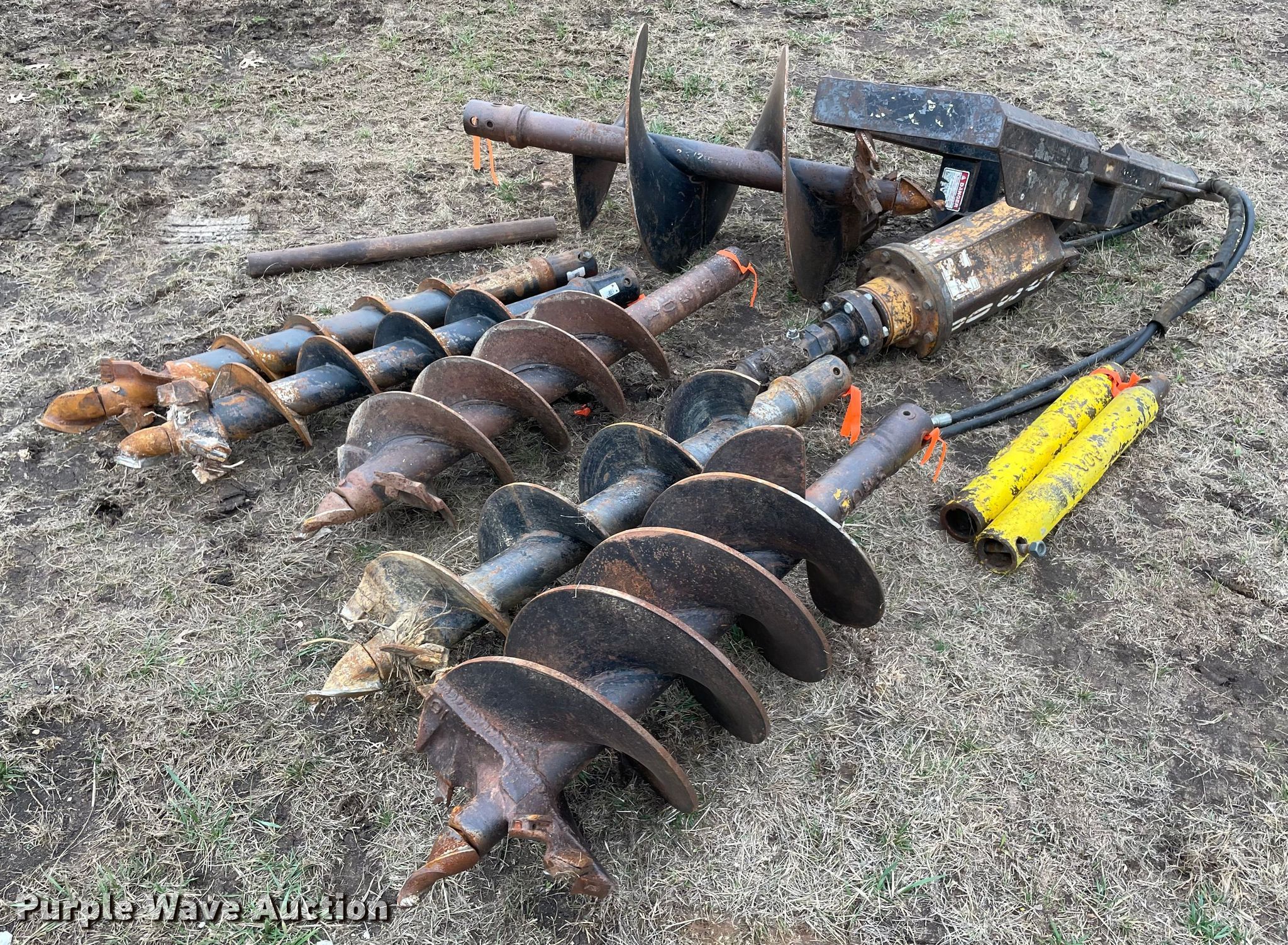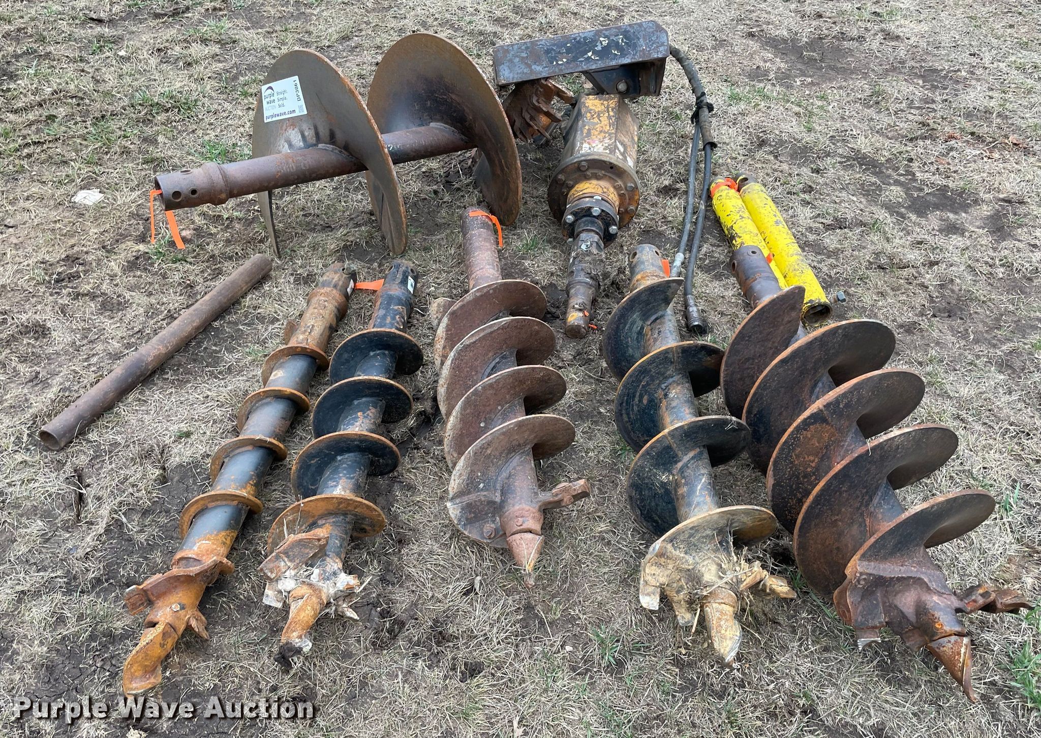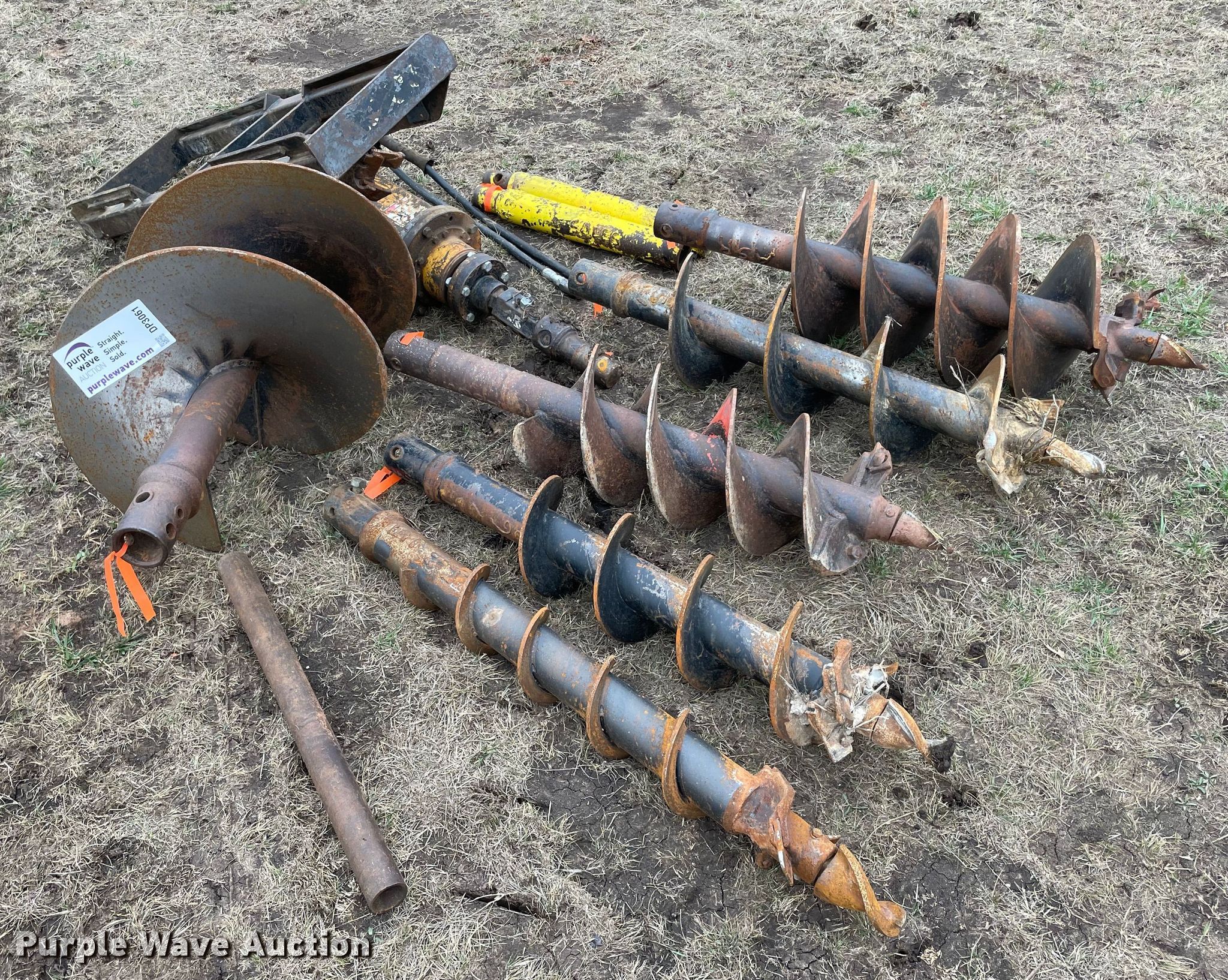 Purple Wave is selling a used Skid Steer Attach. in Oklahoma. This item is a Skid steer auger with the following: (6) auger bits, 6" diameter, 8" diameter, (2) 11" diameter, 15" diameter, 24" diameter, (2) extensions