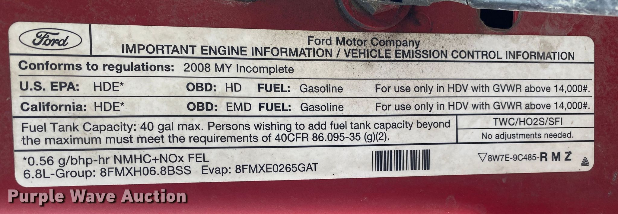 2008 Ford F550 Super Duty flatbed truck. Miles: 204,806 on odometer, VIN: 1FDAF56Y98EC99222, Unit #: 10-197. Engine Displacement: 6.8L, Cylinders: 10, Fuel type: Gas. Transmission Automatic. Chassis Axles: Single, Suspension: Spring, Brakes: Hydraulic, GVWR: 19,000 lbs, Wheelbase: 165". Interior AC, Heat, Heated mirrors, Power windows, Power locks, Cruise control, Auxiliary controls, Brake controller. Features Flatbed CM, 11' 4" L x 94" W. Tires Size: 225/70R19.5. Notes Windshield chipped or cracked, Possible electrical issues, Possible engine issue, runs rough. Oklahoma title. Title distribution may be delayed up to 30 days from verification of funds. Manhattan Road & Bridge. 5100 East Hancock Street. Muskogee, OK 74403