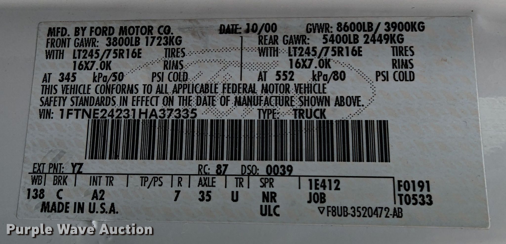 Purple Wave is selling a used 3/4 or 1 Ton Pickup or Van in Oklahoma. This item is a 2001 Ford E250 van with the following: Miles: 49,387 on odometer, VIN: 1FTNE24231HA37335