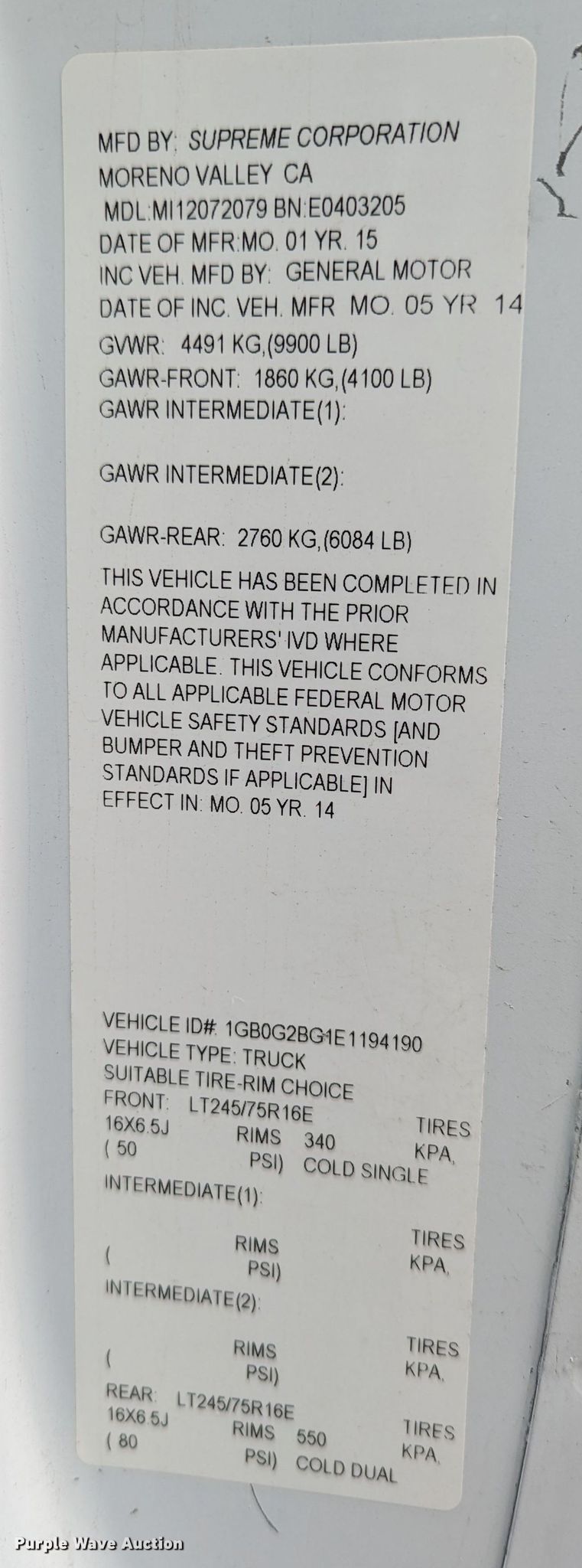 2014 Chevrolet Express G3500 box truck. Miles: 317,898 on odometer, VIN: 1GB0G2BG1E1194190. Engine Displacement: 6.0L, Cylinders: 8, Fuel type: Gas. Transmission Automatic. Chassis Axles: Single, Suspension: Spring, Brakes: Hydraulic, GVWR: 9,900 lbs, Wheelbase: 138". Interior AC, Heat, Cruise control. Features Box bed Supreme MI12072079, Serial: E0403205, 12' L x 79" W x 72" H, Floor: Wood. Tires Size: LT245/75R16. California title. Title distribution may be delayed up to 30 days from verification of funds. L&R Auto Brokers, LLC. 14555 W Frisco Dr. Yukon, OK 73099