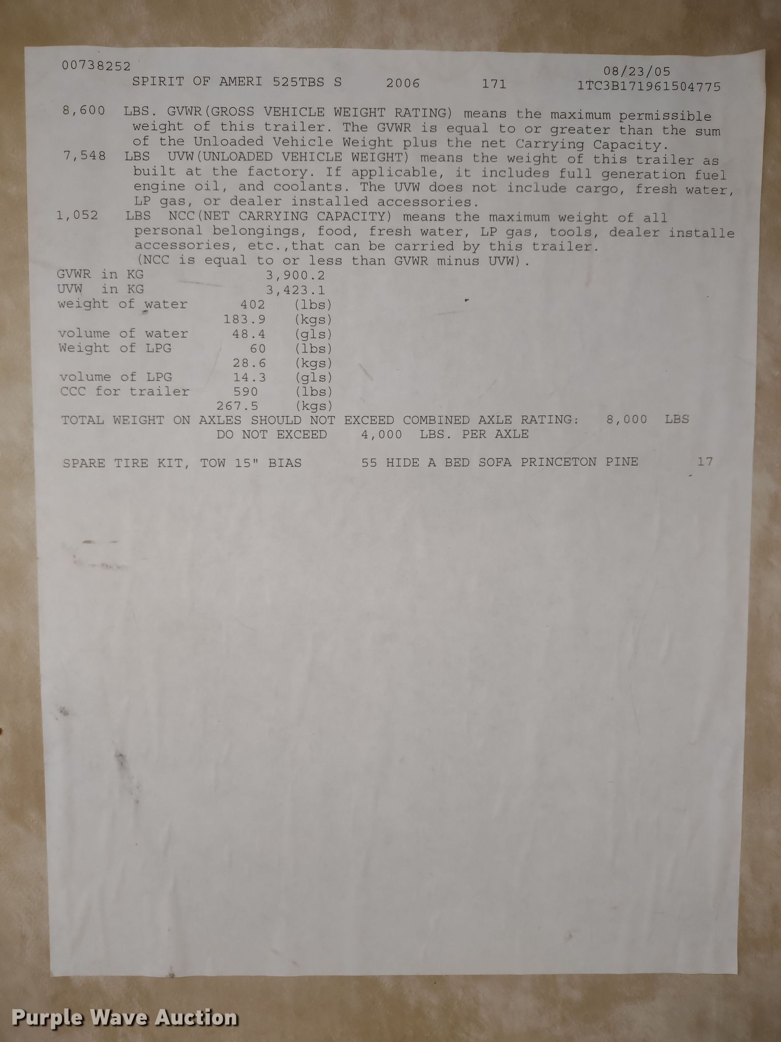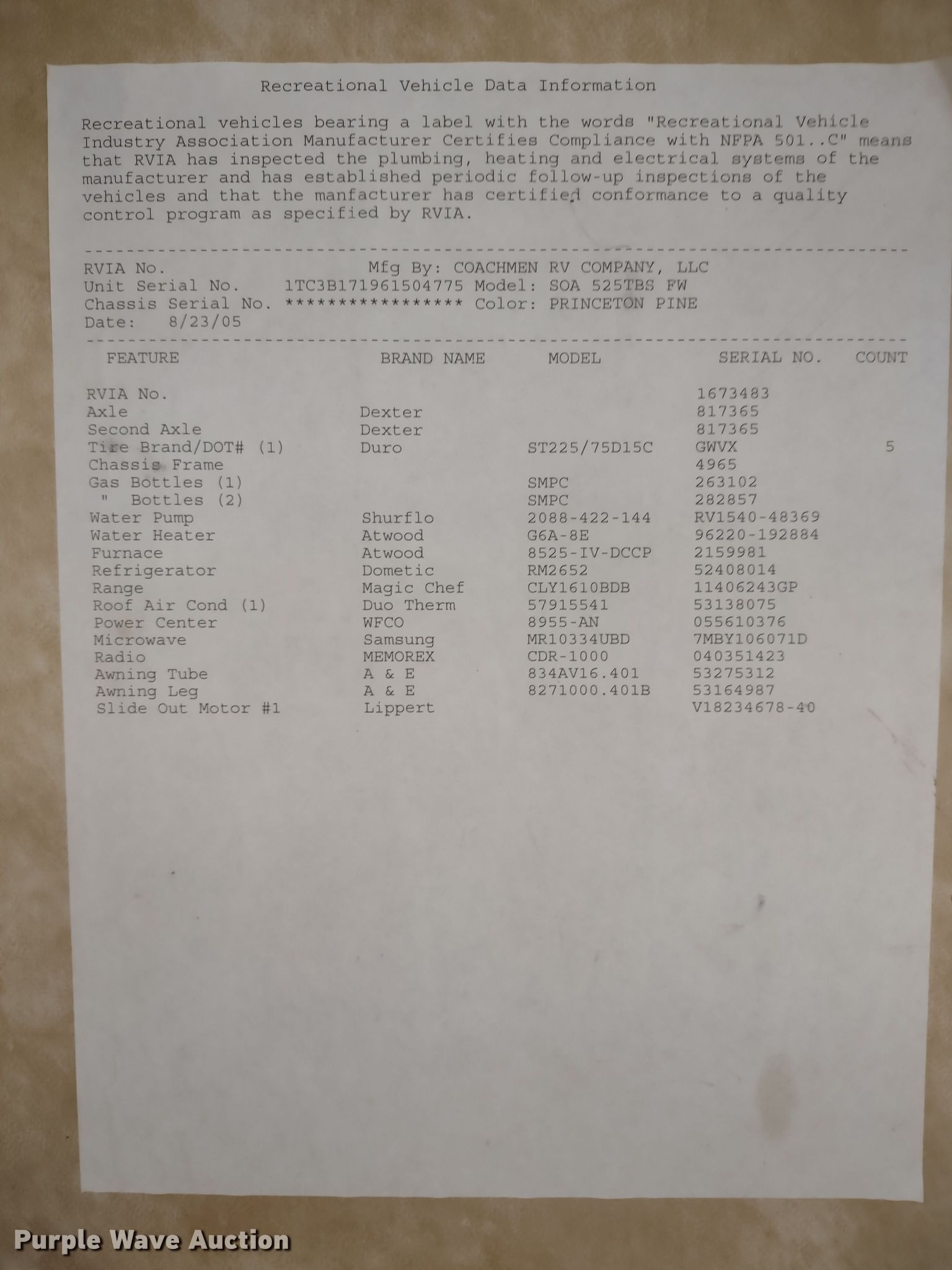 Purple Wave is selling a used RV or Camper in Missouri. This item is a 2006 Coachmen 525TBS RV with the following: Camper length: 27' 8", VIN: 1TC3B171961504775
