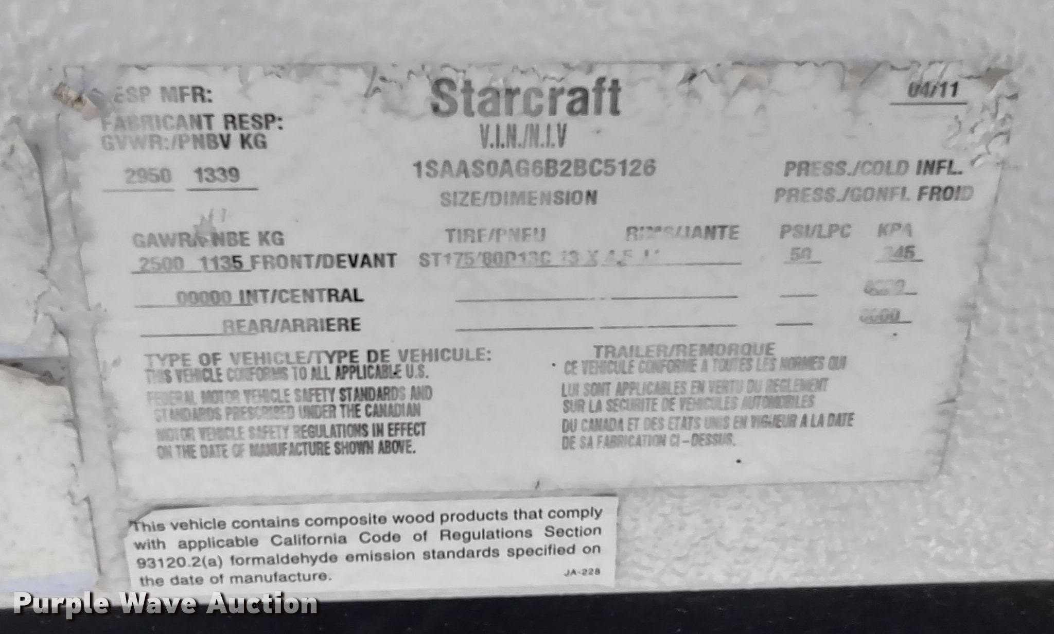 2011 Starcraft pop-up camper. Camper length: 16', VIN: 1SAAS0AG6B2BC5126. Chassis Axles: Single, Suspension: Spring, GVWR: 2,950 lbs, GAWR: 2,500 lbs. Interior Kitchen: Sink, Refrigerator, Living room: Table, Pull out couch, Beds: 3 Bed type: Queen, Twin, Sound system, Heater, AC units: 1. Features Ball hitch: 2". Tires Size: 175/80D13. Notes Possible rodent damage. Assets purchased in a wholesale transaction. Past history unknown. Accessories included may not be functional.. Missouri prior salvage title. Seller is a Missouri licensed motor vehicle dealer. Title will be assigned and distributed by the dealer. Please contact the seller for distribution questions. Motors Inc. LLC. 148 MO-7. Clinton, MO 64735