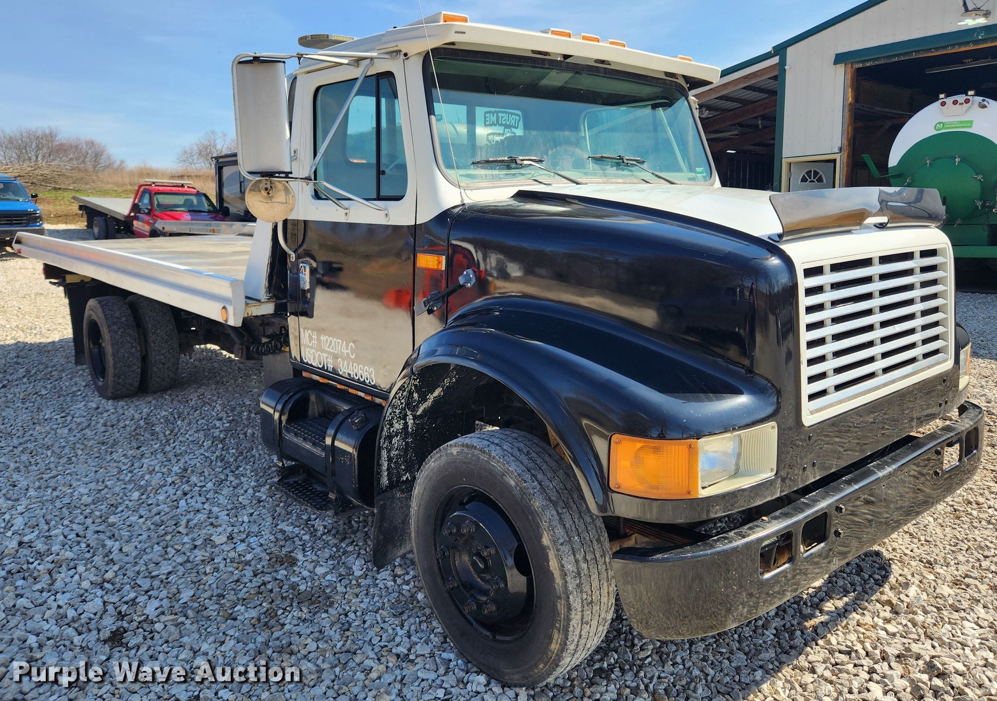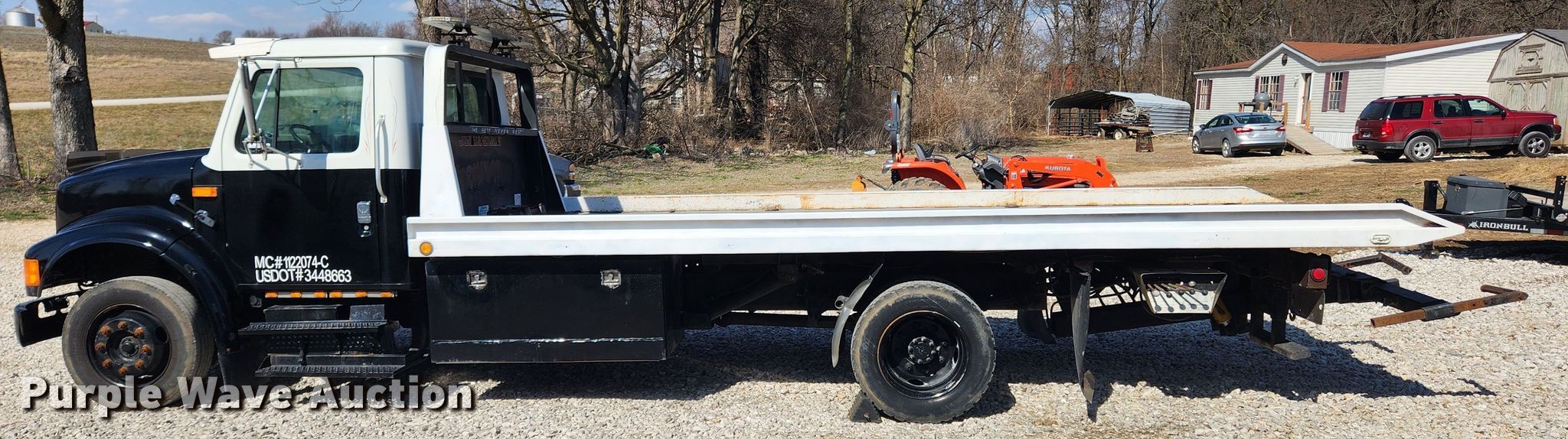 This 1996 International 4700 rollback truck will sell to the highest bidder regardless of price.