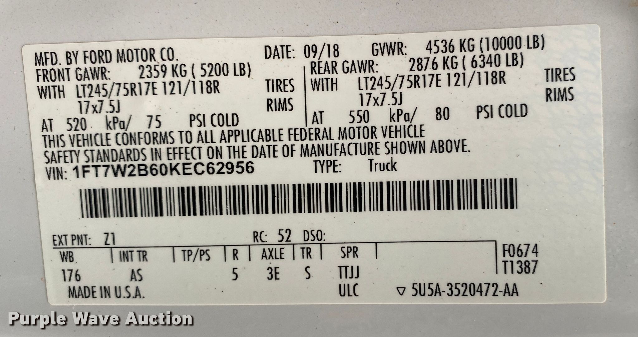 - VIN: 1FT7W2B60KEC62956