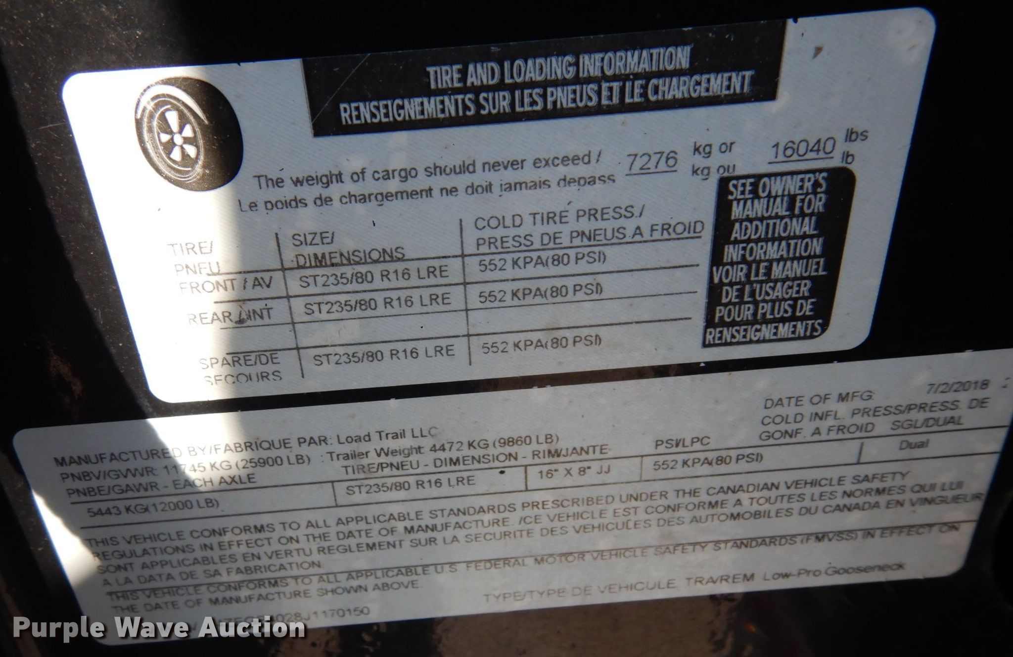 2018 Load Trail equipment trailer. VIN: 4ZEGP4028J1170150. Dimensions Overall: 49' 3" L x 102" W, Deck: 34' L x 102" W, Deck height: 2' 9", Tail length: 5' 4", Ramps: Manual Length: 5' 2". Features Deck type: Wood. Chassis Hitch: Gooseneck, Landing gear: Dual, Suspension: Spring, Brakes: Electric, Axles: Tandem, GVWR: 25,900 lbs, GAWR: 12,000 lbs. Tires Steel wheels, Size: 235/80R16. Wisconsin title. Title distribution may be delayed up to 14 days from verification of funds. Push Incorporated. 1100 Lindy Street. Rice Lake, WI 54868