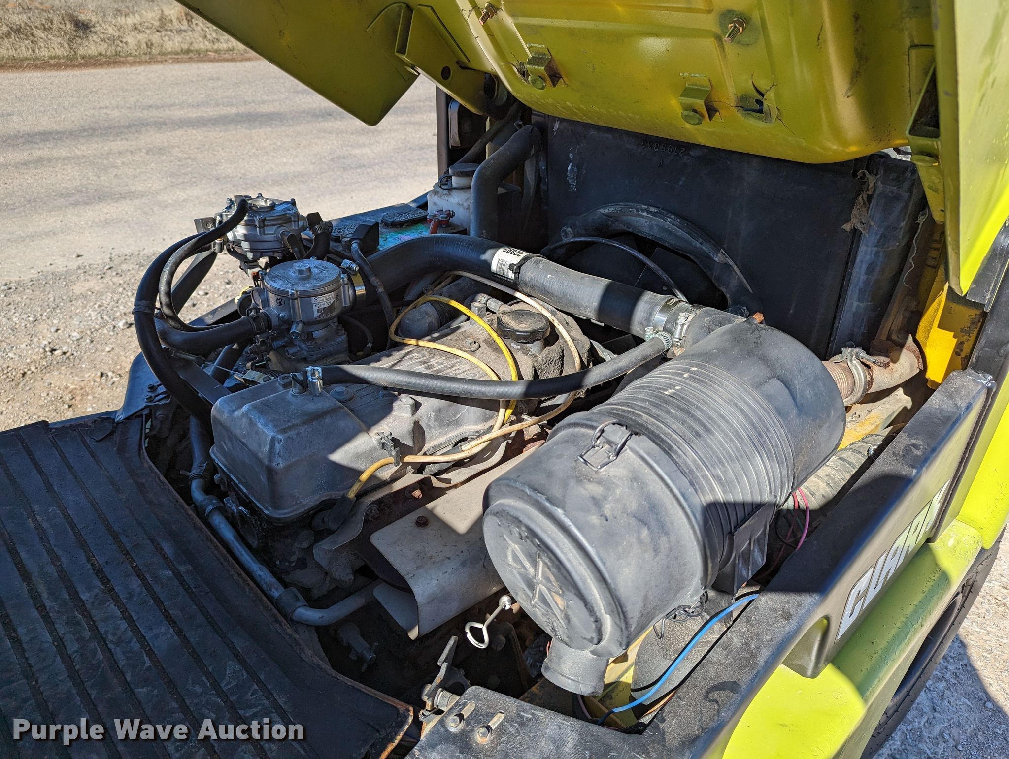 Purple Wave is selling a used Cushion Tire or Pneumatic Forklift in Oklahoma. This item is a Clark CGP30 forklift with the following: Hours: 4,898 on meter, Serial: P365L-1196-9396FB