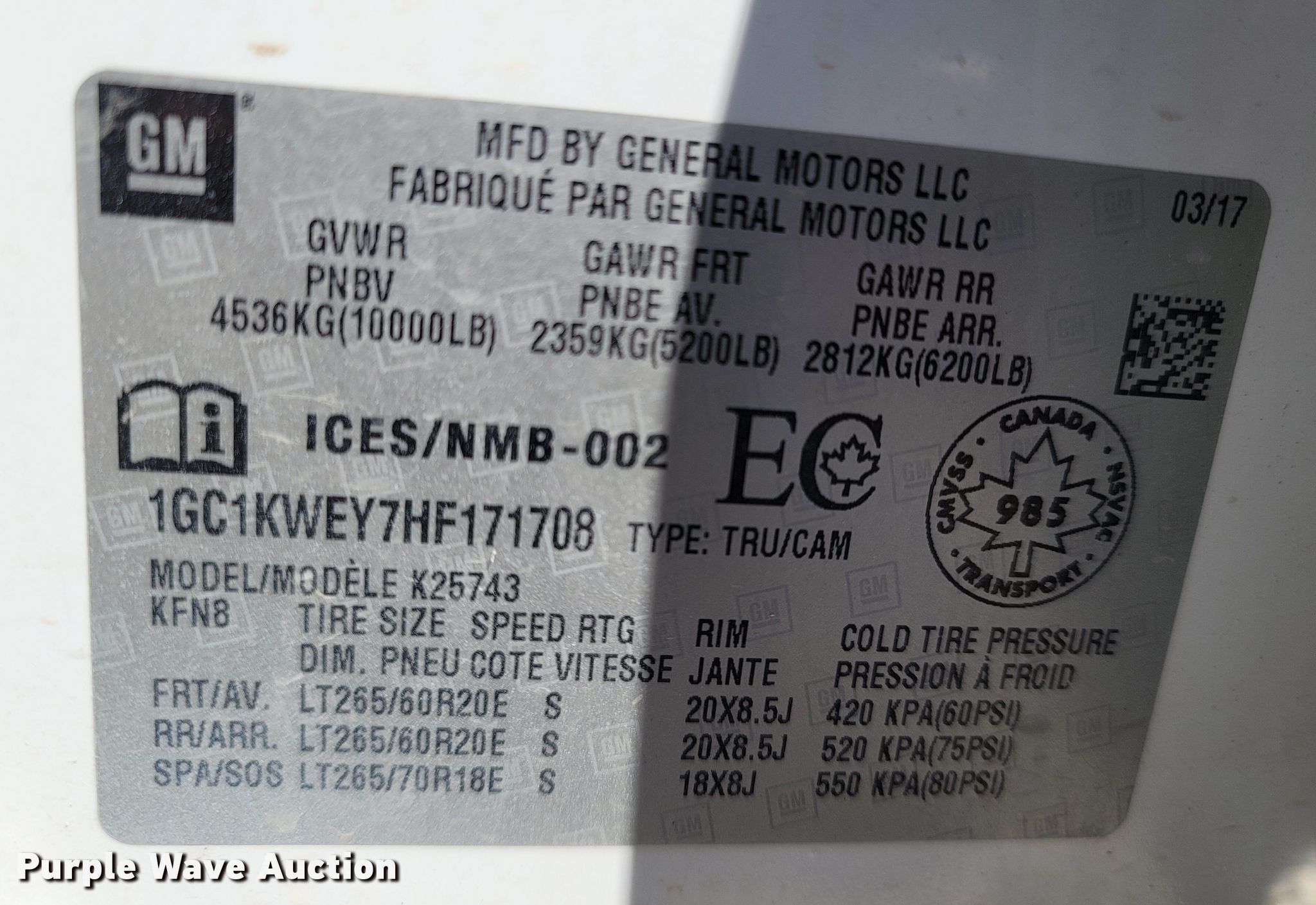Purple Wave is selling a used 3/4 or 1 Ton Pickup or Van in Missouri. This item is a 2017 Chevrolet Silverado 2500HD Crew Cab pickup truck with the following: Miles: 99,851 on odometer, VIN: 1GC1KWEY7HF171708