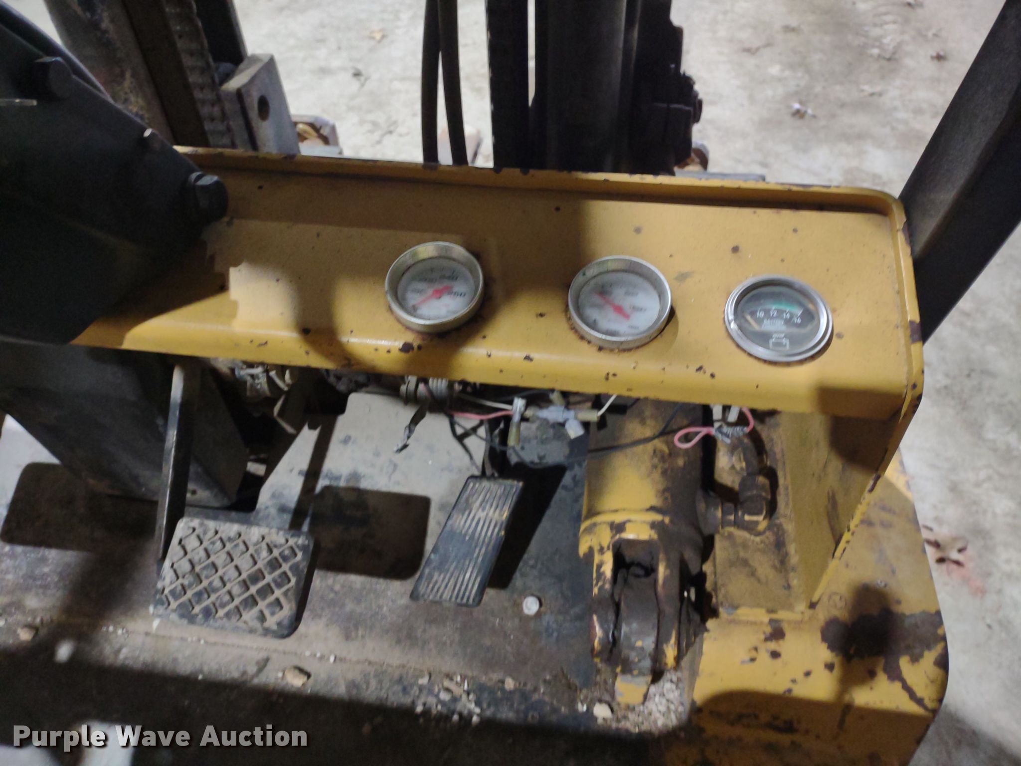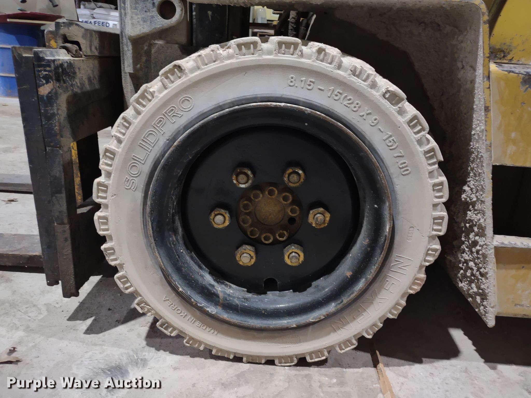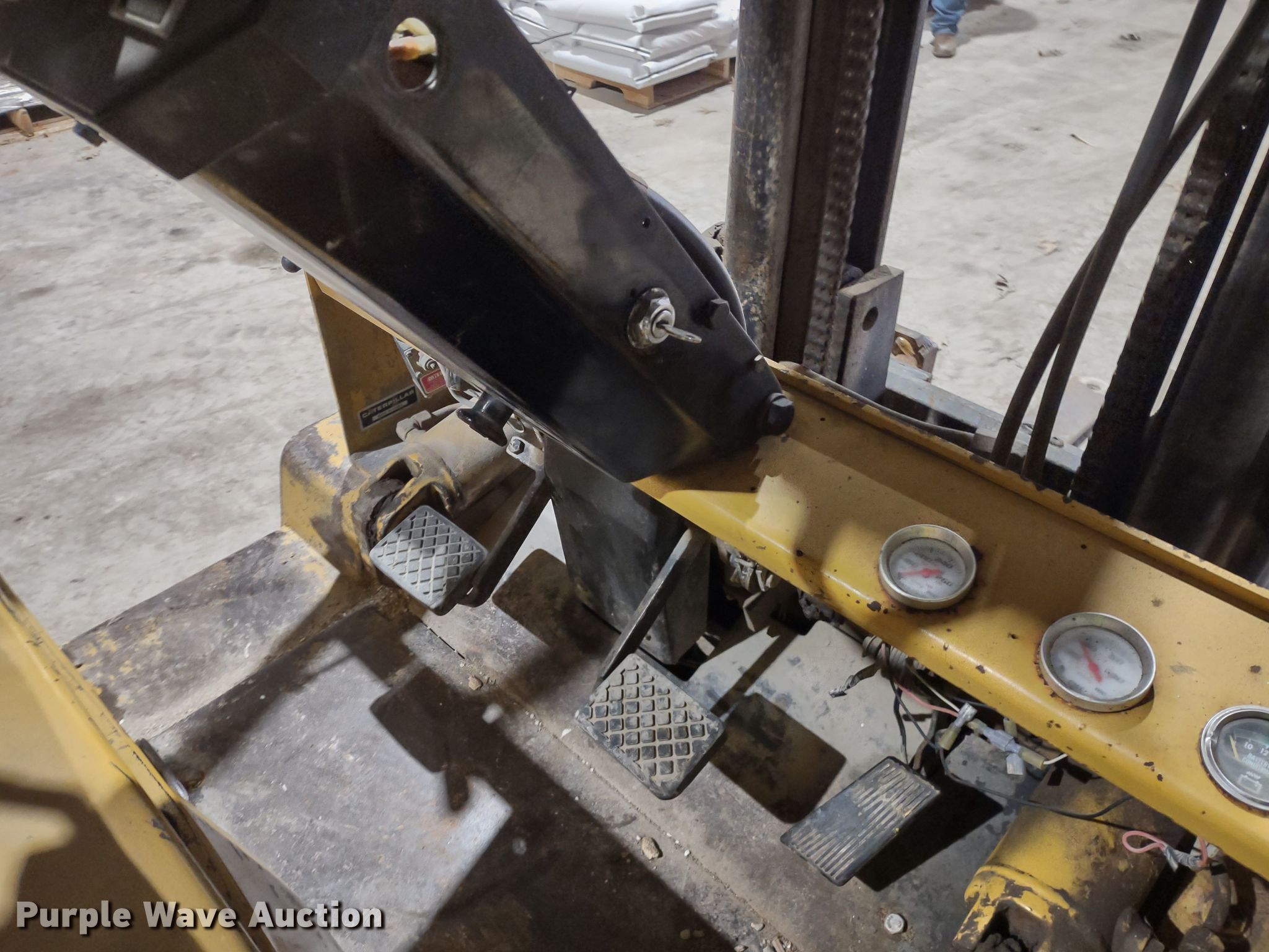 Caterpillar VC60D forklift. Hours: 757 on meter. Engine Caterpillar, Cylinders: 4, Fuel type: LPG LP bottle: Included. Transmission Powershift. Operators station Canopy. Features Mast stages: 2, Side shift, Mast tilt, Fork length: 48". Tires Front: 8.15-15, Rear: 6.00-9, Solid. AG Choice Hepler. Moran, KS 66755
