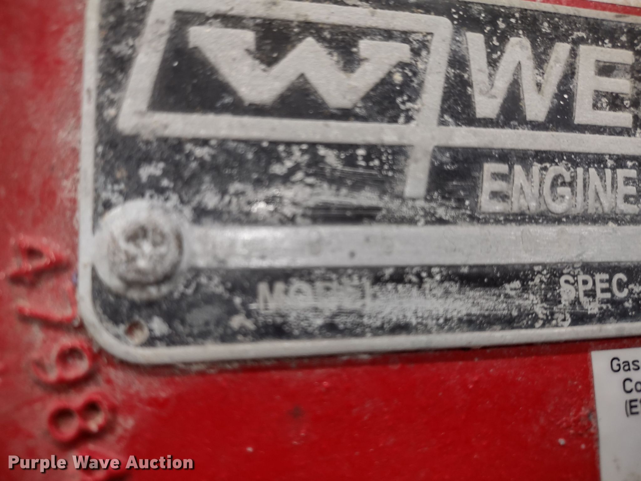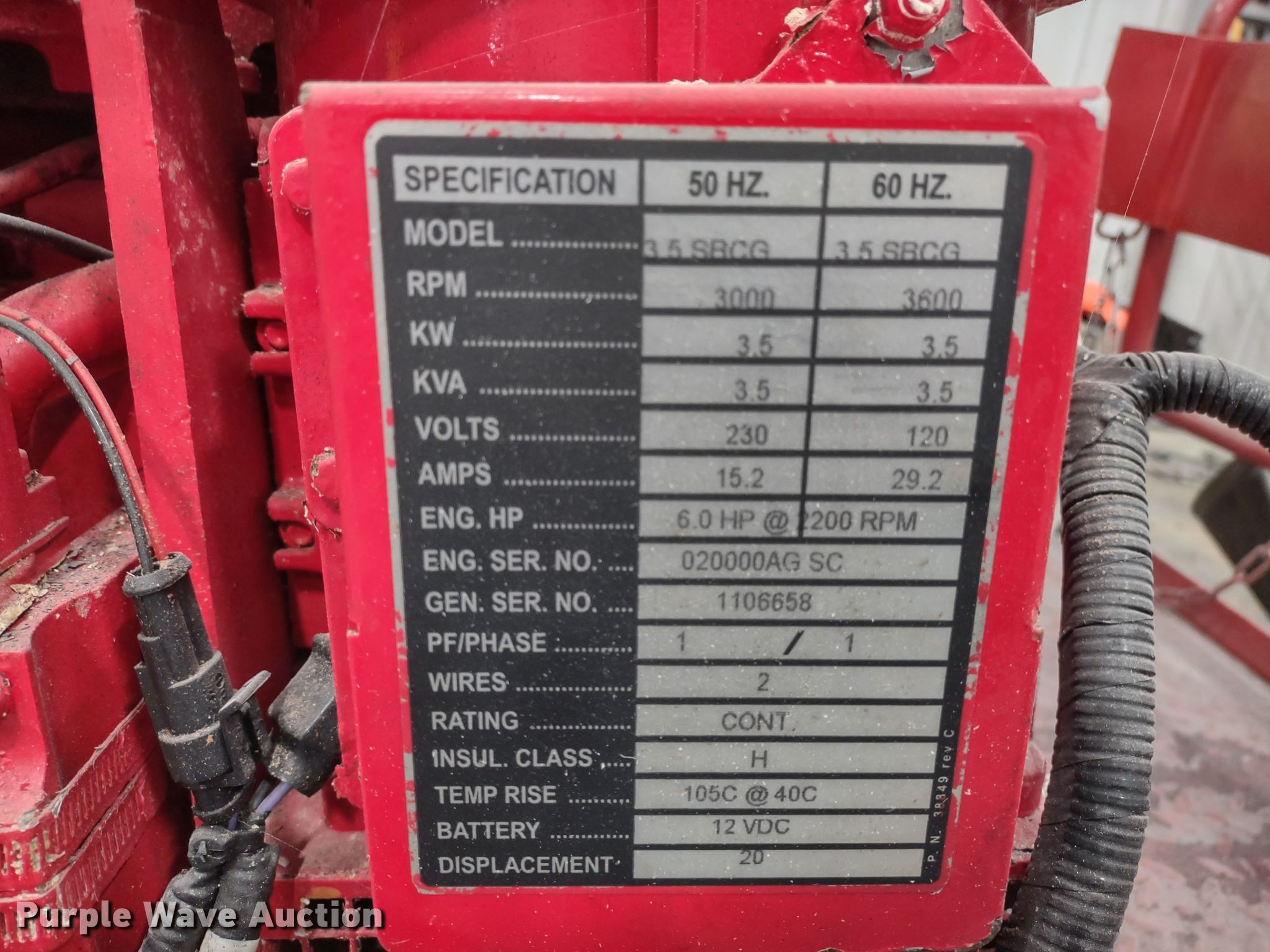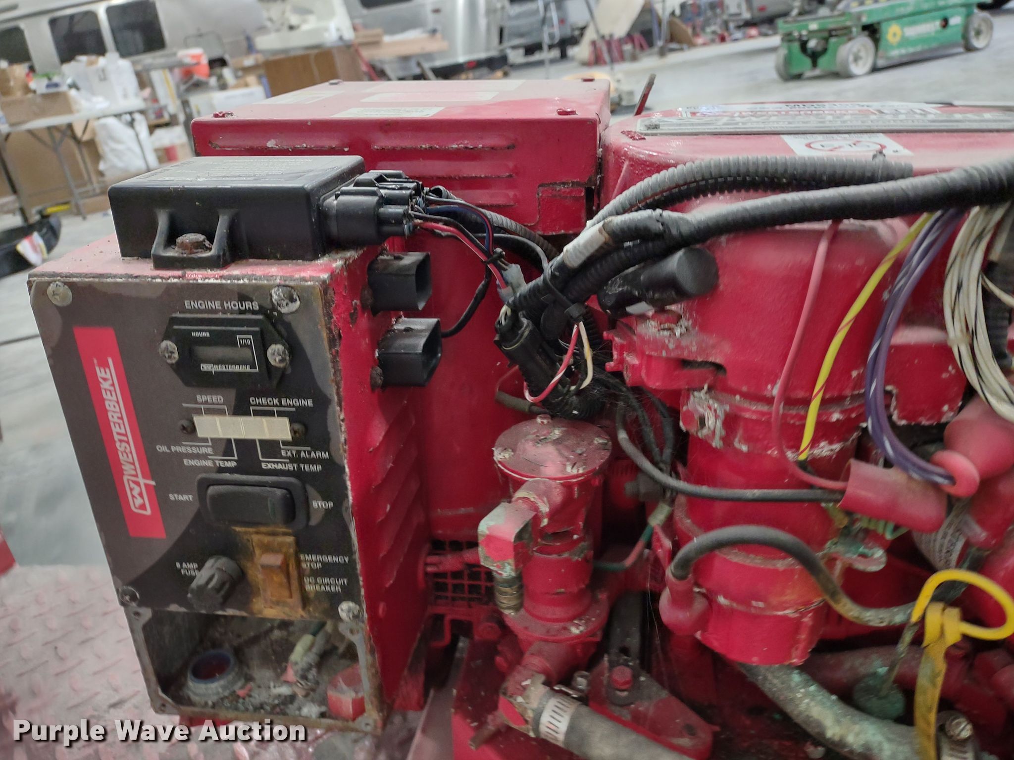 Westerbeke 3.5 SBCG generator. Hours: Unknown, Serial: 020000A330. Engine Westerbeke, Serial: 020000AG SC, Displacement: 351 cc, Cylinders: 2, Fuel type: Gas, HP: 6, kW: 3.5. Features Generator Westerbeke 3.5SBCG, kVA: 3.5, kW: 3.5, Phase: Single, Electric start. Notes Possible water damage, No battery, Non-operational unit. Motors Inc. LLC. 148 MO-7. Clinton, MO 64735