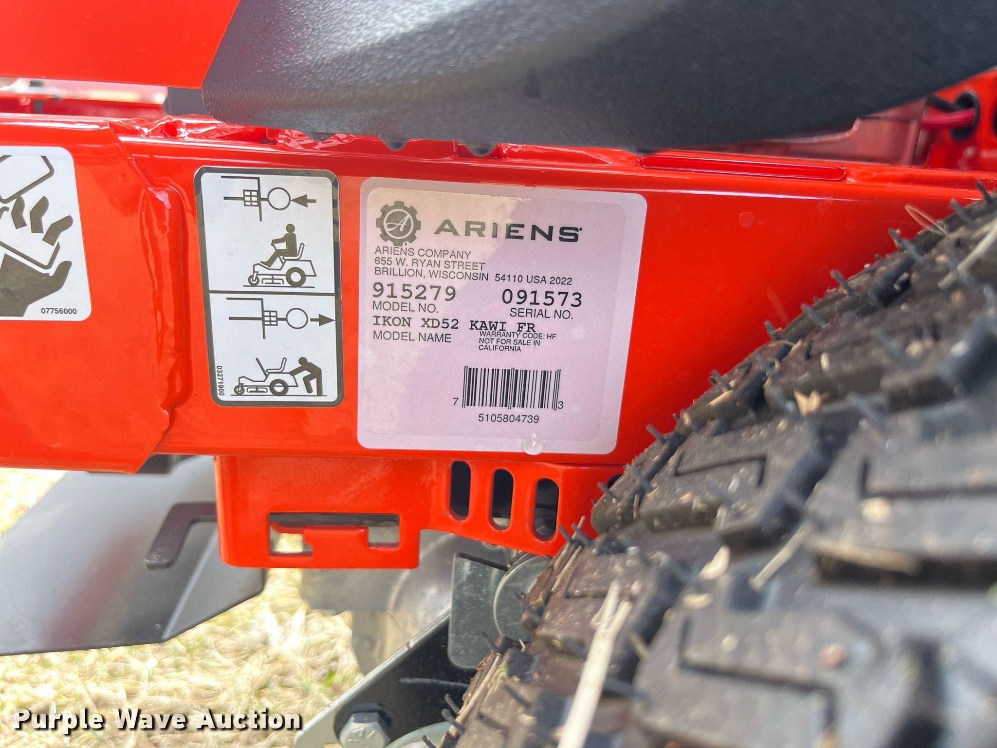 Purple Wave is selling a used Lawn Mower in Kansas. This item is a Ariens Ikon XD52 ZTR lawn mower with the following: Cutting width: 52", Serial: 091573