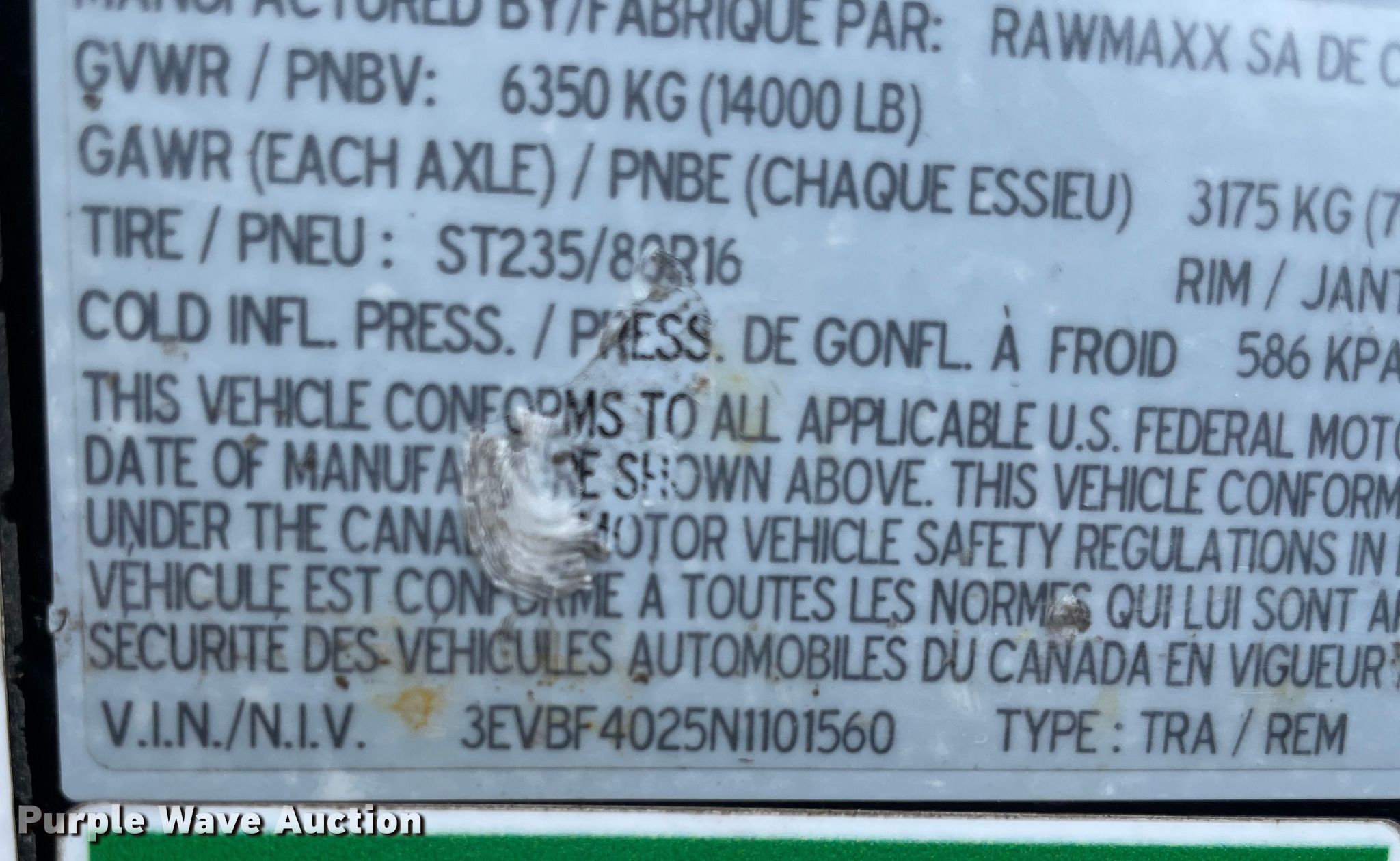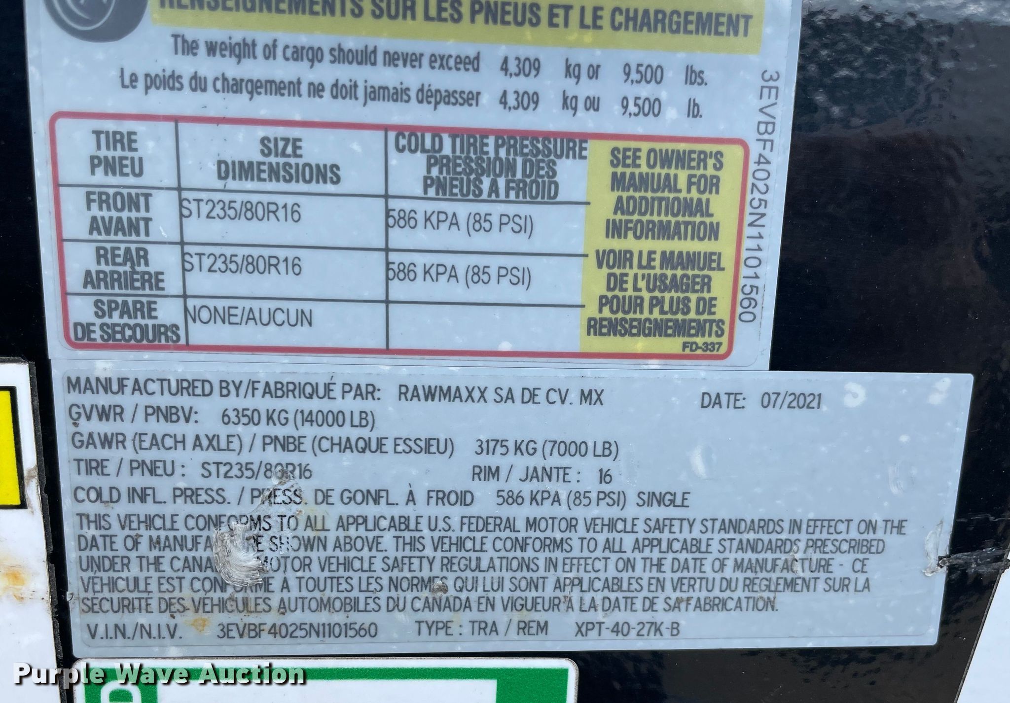 Purple Wave is selling a used Oilfield Trailer in Oklahoma. This item is a 2022 RawMaxx XPT-40-27K-B pipe trailer with the following: VIN: 3EVBF4025N1101560