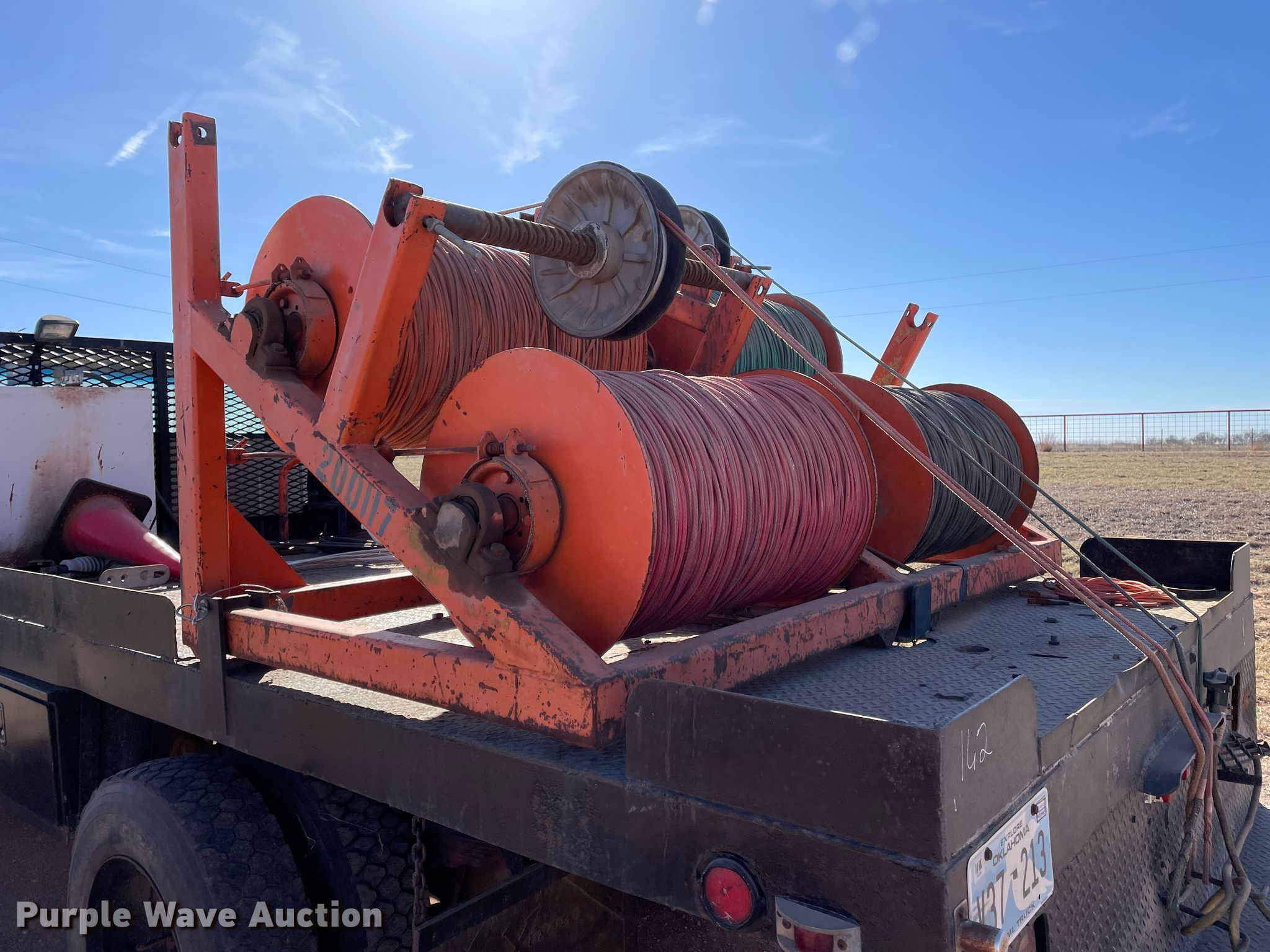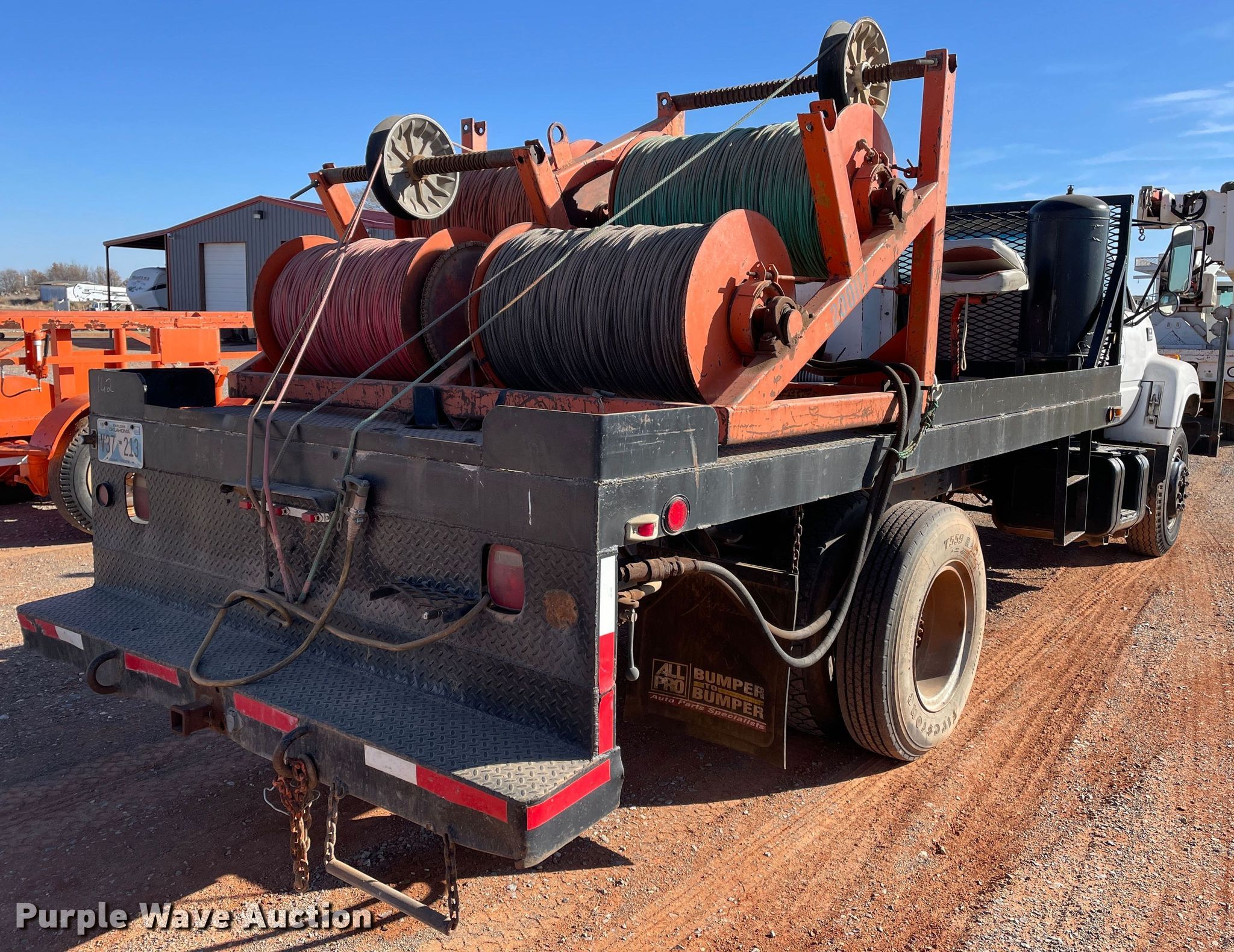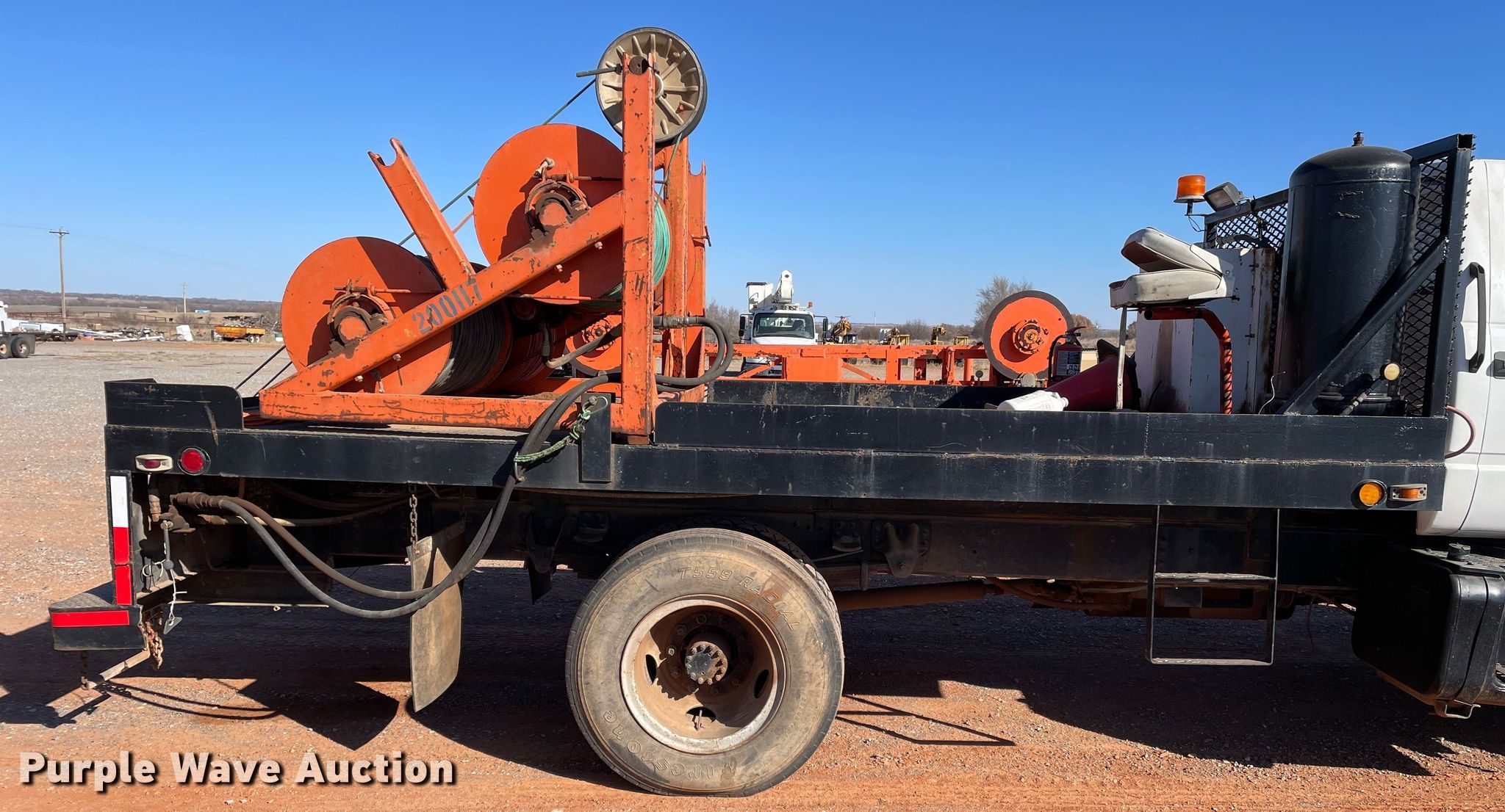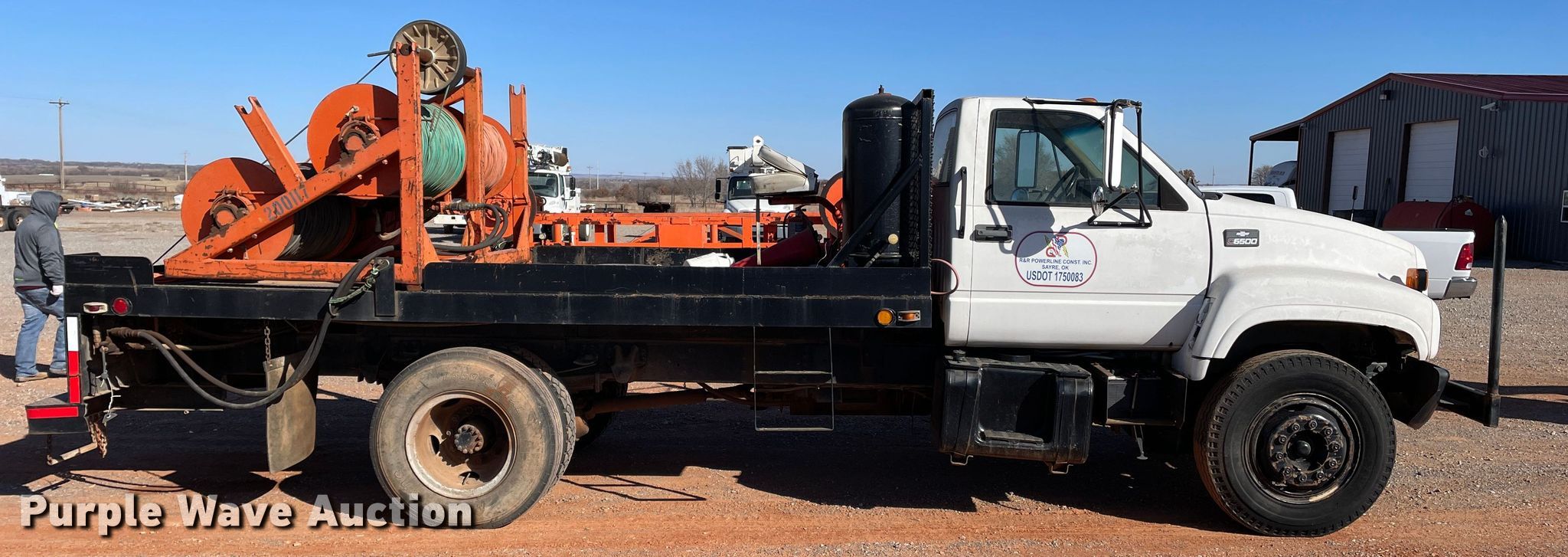 1998 Chevrolet C6500 line tensioner truck. Miles: 61,276 on odometer, Hours: 7,377 on meter, VIN: 1GBK7H1J6WJ103456. Engine Caterpillar, Displacement: 6.6L, Cylinders: 6, Fuel type: Diesel. Transmission Manual, Speed: 6. Chassis Axles: Single, Suspension: Spring, Brakes: Air, PTO, GVWR: 25,300 lbs. Interior Heat. Features Flatbed 15' L x 92.5" W, Reel carrier Capacity: 4. Tires Front: 9.00-20, Rear: 9.00R20. Oklahoma title. Title distribution may be delayed up to 14 days from verification of funds. R&R Powerline Company. 18661 East 1220 Road. Sayre, OK 73662