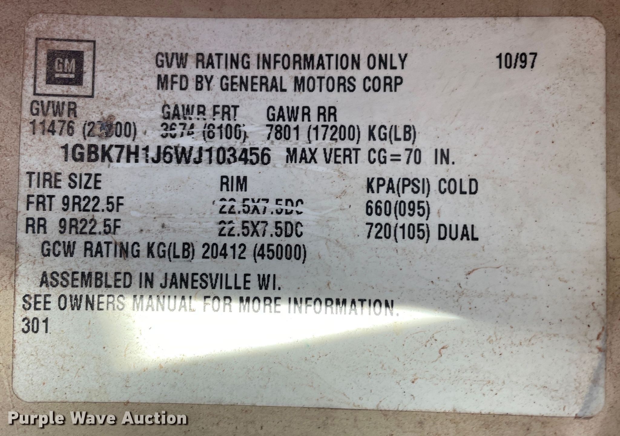 - VIN: 1GBK7H1J6WJ103456