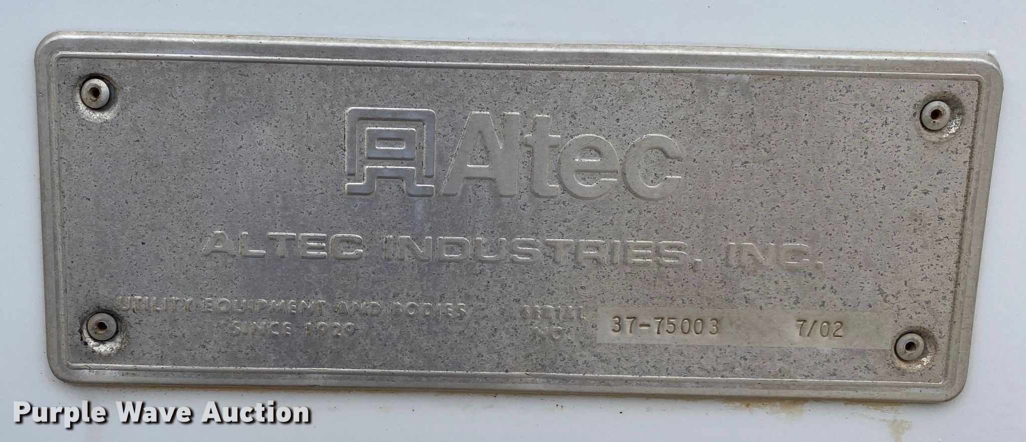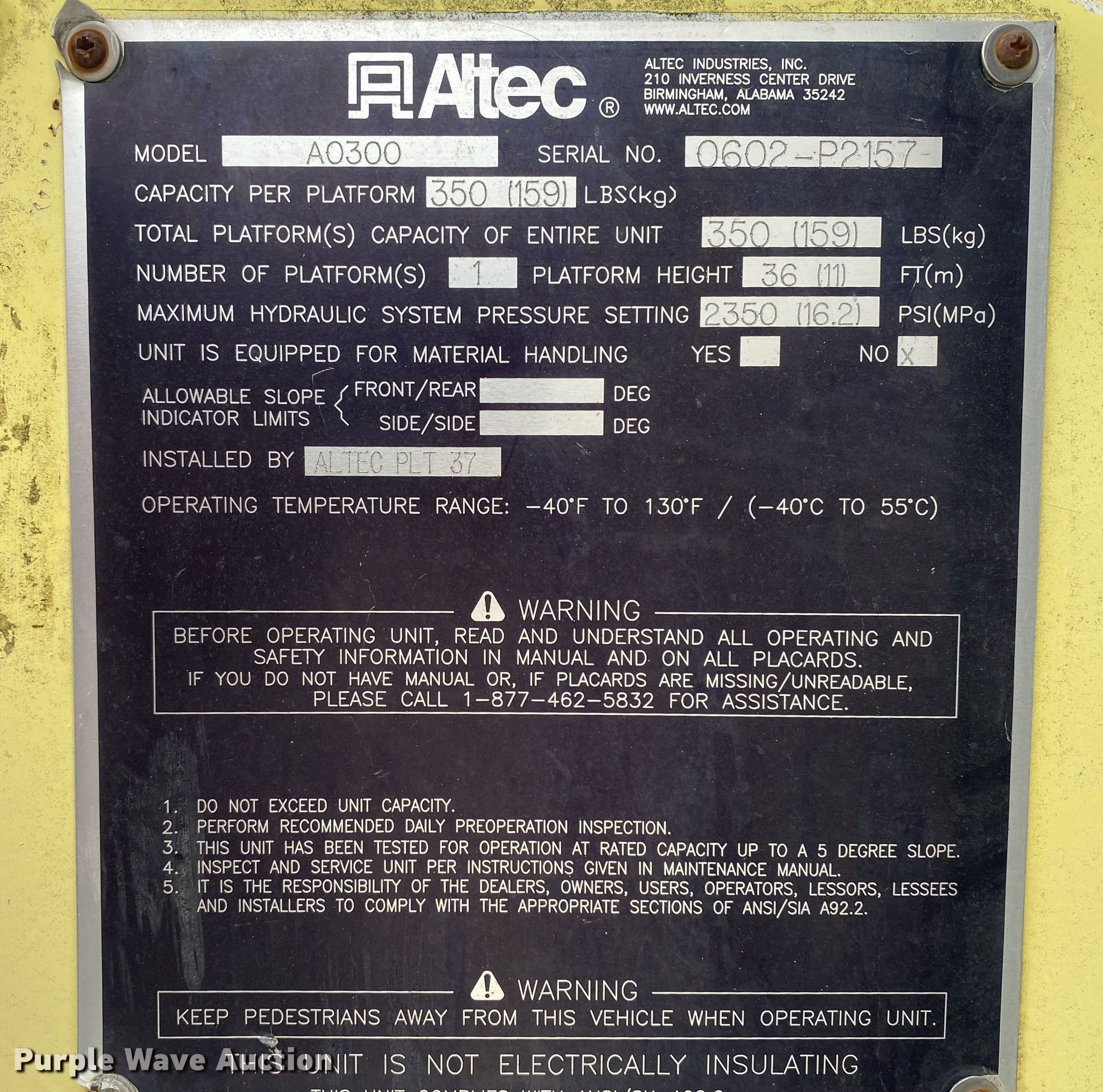 2002 Ford F550 Super Duty bucket truck. Miles: 156,603 on odometer, VIN: 1FDAF57F02ED64608, Unit #: 304017. Engine Displacement: 7.3L, Cylinders: 8, Fuel type: Diesel. Transmission Automatic. Chassis Four wheel drive, Axles: Single, Suspension: Spring, Brakes: Hydraulic, PTO, GVWR: 17,500 lbs, Wheelbase: 141". Interior AC, Heat, Cruise control, Brake controller. Features Bed Altec, Serial: 37-75003, 9' 2" L x 94" W, Boom Altec A0300, Serial: 0602-P2157, Maximum lift capacity: 350 lbs, Maximum lift height: 36', Boom type: Articulating, Man basket, Boom controls Platform/ basket.. Tires Size: 225/70R19.5. Oklahoma title. Title distribution may be delayed up to 14 days from verification of funds. TLS Group, Inc.. 1326 W 37th Pl. Tulsa, OK 74107