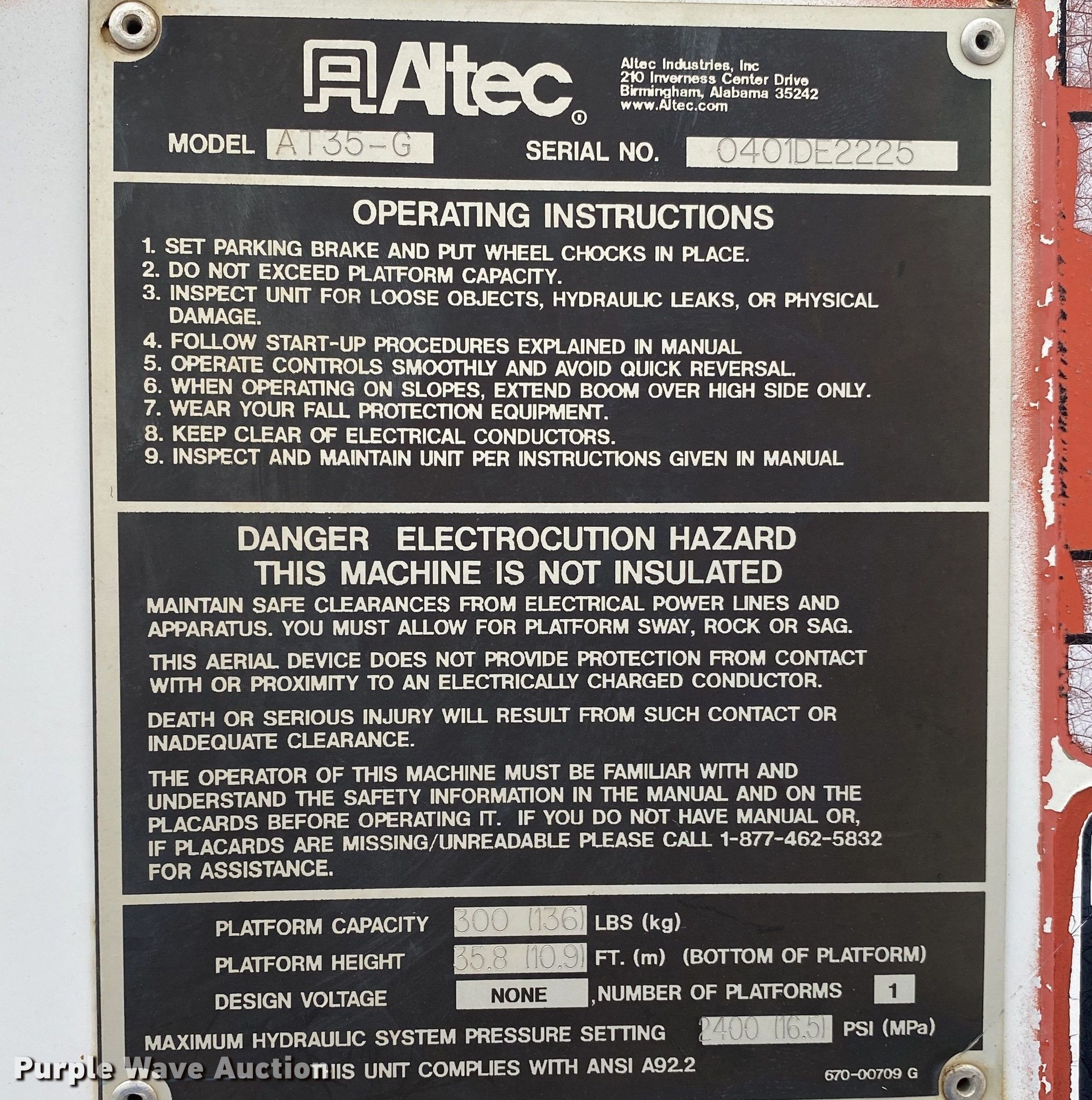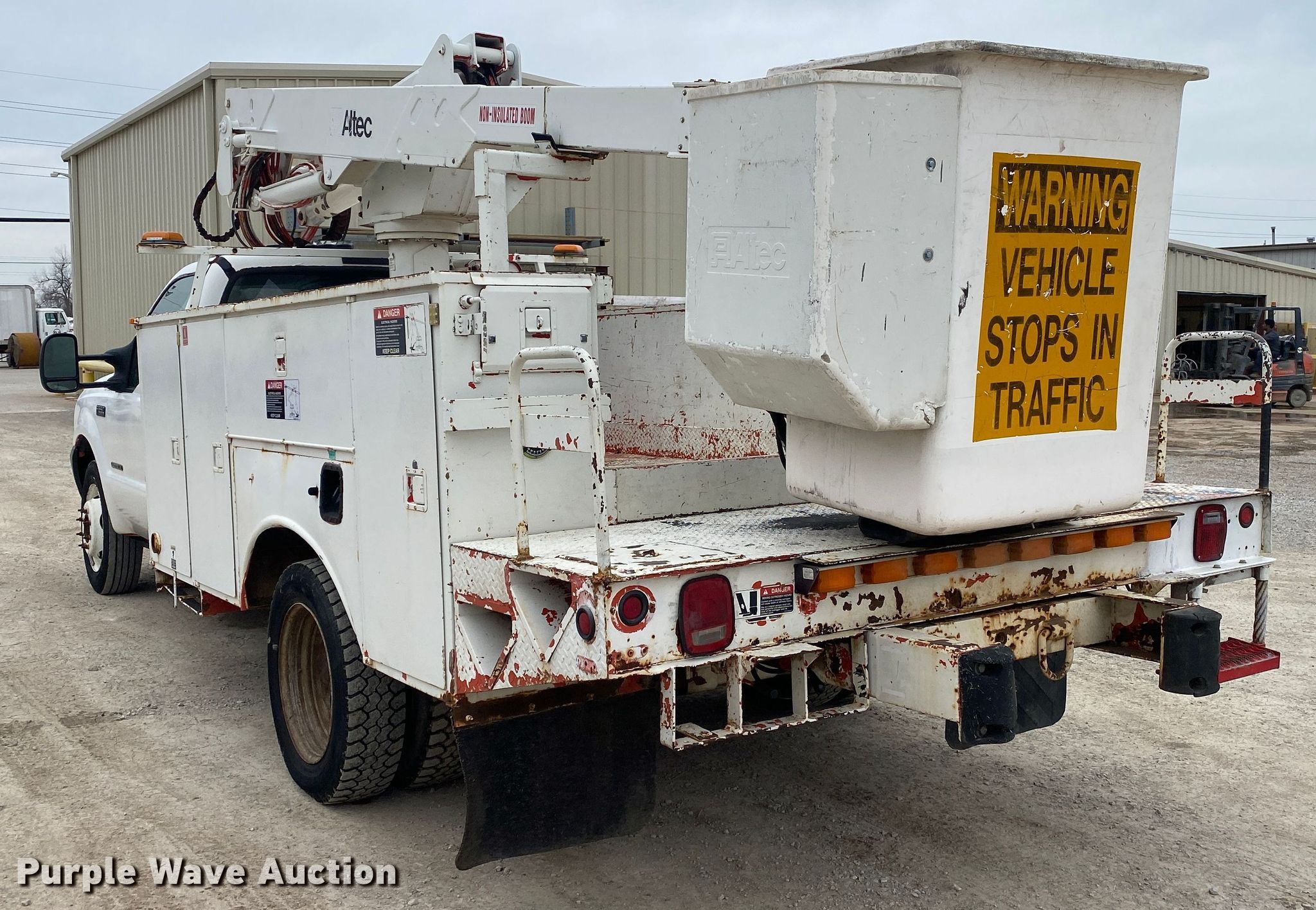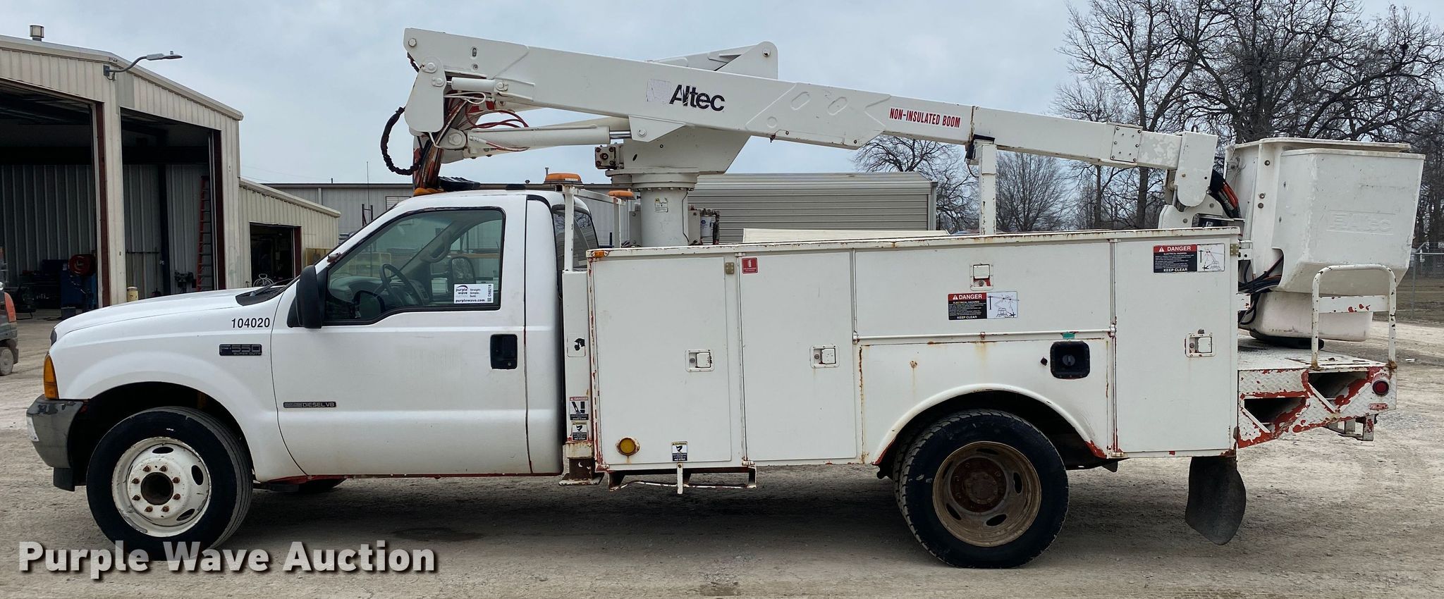 2001 Ford F550 Super Duty bucket truck. Miles: 250,890 on odometer, Hours: 4,366 on meter, VIN: 1FDAF56F81EC07859, Unit #: 104020. Engine Displacement: 7.3L, Cylinders: 8, Fuel type: Diesel. Transmission Automatic. Chassis Axles: Single, Suspension: Spring, Brakes: Hydraulic, PTO, GVWR: 17,500 lbs, Wheelbase: 165". Interior AC, Heat, Cruise control. Features Bed Altec, Serial: 37-72053, 10' L x 93" W, Boom Altec AT35-G, Serial: 0401DE2225, Maximum lift capacity: 300 lbs, Maximum lift height: 35.8', Boom type: Articulating, Telescopic, Man basket, Boom controls Ground, Platform/ basket.. Tires Size: 225.70R19.5. Notes Hail damage. Oklahoma title. Title distribution may be delayed up to 14 days from verification of funds. TLS Group, Inc.. 1326 W 37th Pl. Tulsa, OK 74107