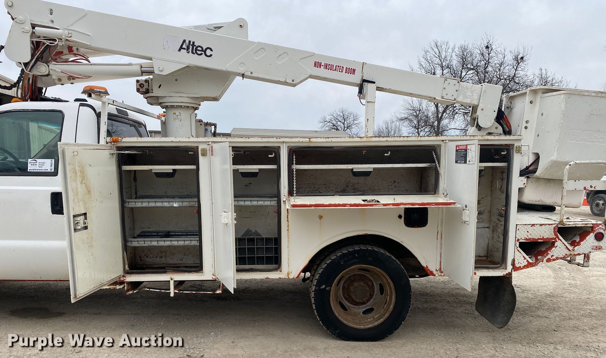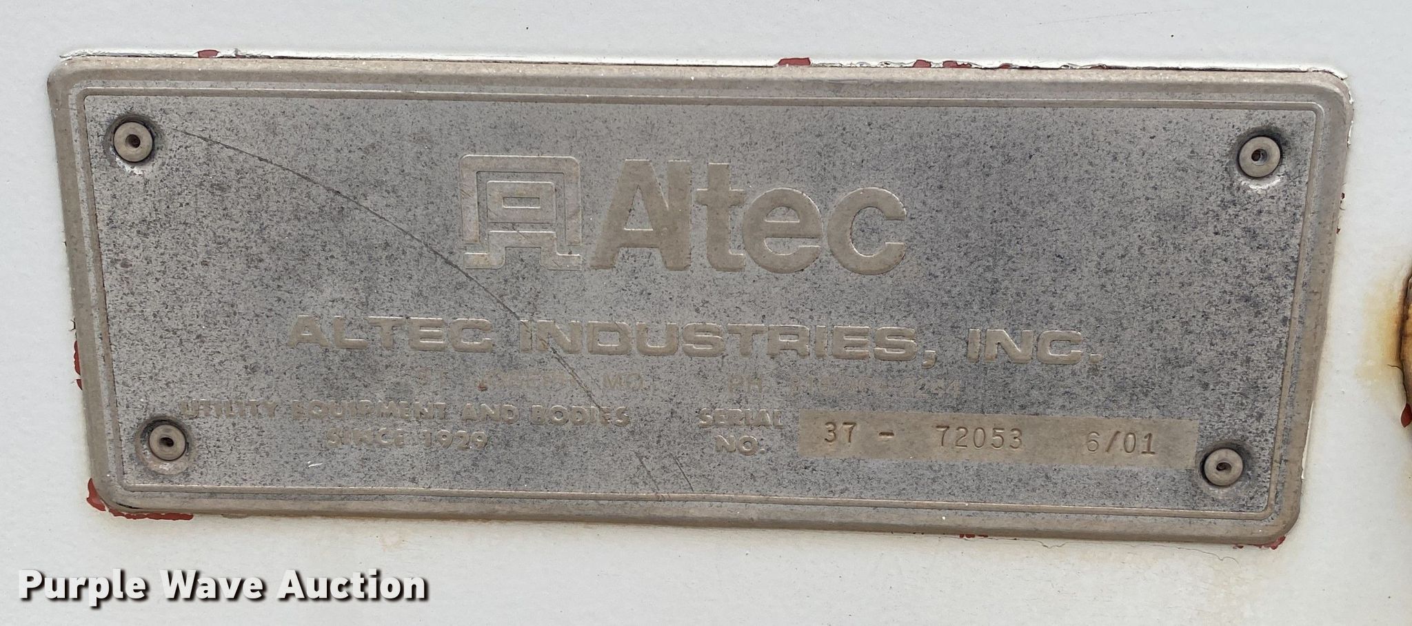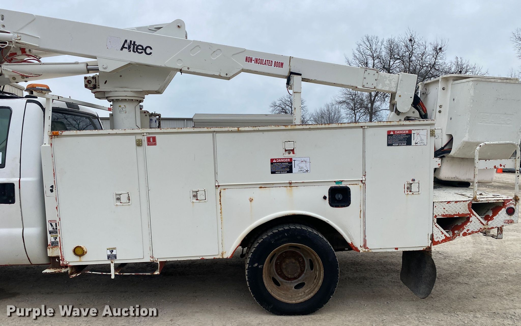 2001 Ford F550 Super Duty bucket truck. Miles: 250,890 on odometer, Hours: 4,366 on meter, VIN: 1FDAF56F81EC07859, Unit #: 104020. Engine Displacement: 7.3L, Cylinders: 8, Fuel type: Diesel. Transmission Automatic. Chassis Axles: Single, Suspension: Spring, Brakes: Hydraulic, PTO, GVWR: 17,500 lbs, Wheelbase: 165". Interior AC, Heat, Cruise control. Features Bed Altec, Serial: 37-72053, 10' L x 93" W, Boom Altec AT35-G, Serial: 0401DE2225, Maximum lift capacity: 300 lbs, Maximum lift height: 35.8', Boom type: Articulating, Telescopic, Man basket, Boom controls Ground, Platform/ basket.. Tires Size: 225.70R19.5. Notes Hail damage. Oklahoma title. Title distribution may be delayed up to 14 days from verification of funds. TLS Group, Inc.. 1326 W 37th Pl. Tulsa, OK 74107