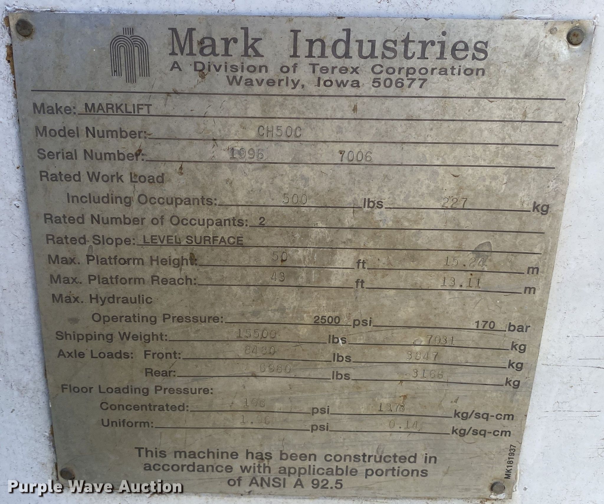 1996 Mark Lift CH50C boom lift. Hours: 5,794 on meter, Serial: 7006. Engine Deutz, Cylinders: 3, Fuel type: Diesel. Chassis Four wheel drive. Features Maximum lift capacity: 500 lbs, Maximum reach length: 43', Maximum lift height: 50', Hydraulic extendable jib, Hydraulic leveling, Platform: 72" L x 36" W, AC power outlet, Controls: Platform, Ground, Platform rotation: Hydraulic. Tires Tire size: 12-16.5, Foam filled. Bristow, OK 74010