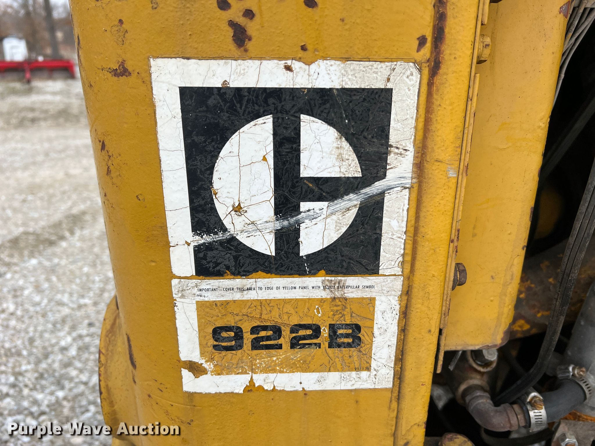 1964 Caterpillar 922B wheel loader. Serial: 59A8483. Engine Caterpillar, Cylinders: 4, Fuel type: Diesel. Transmission Powershift. Operators station Bucket controls: Two-lever. Features Bucket Width: 86", Cutting edge: Bolt-on. Tires Size: 15.5-25. Notes Oil filter housing leak. Vitt Truck and Auto Repair. 24511 US-24. Paris, MO 65275
