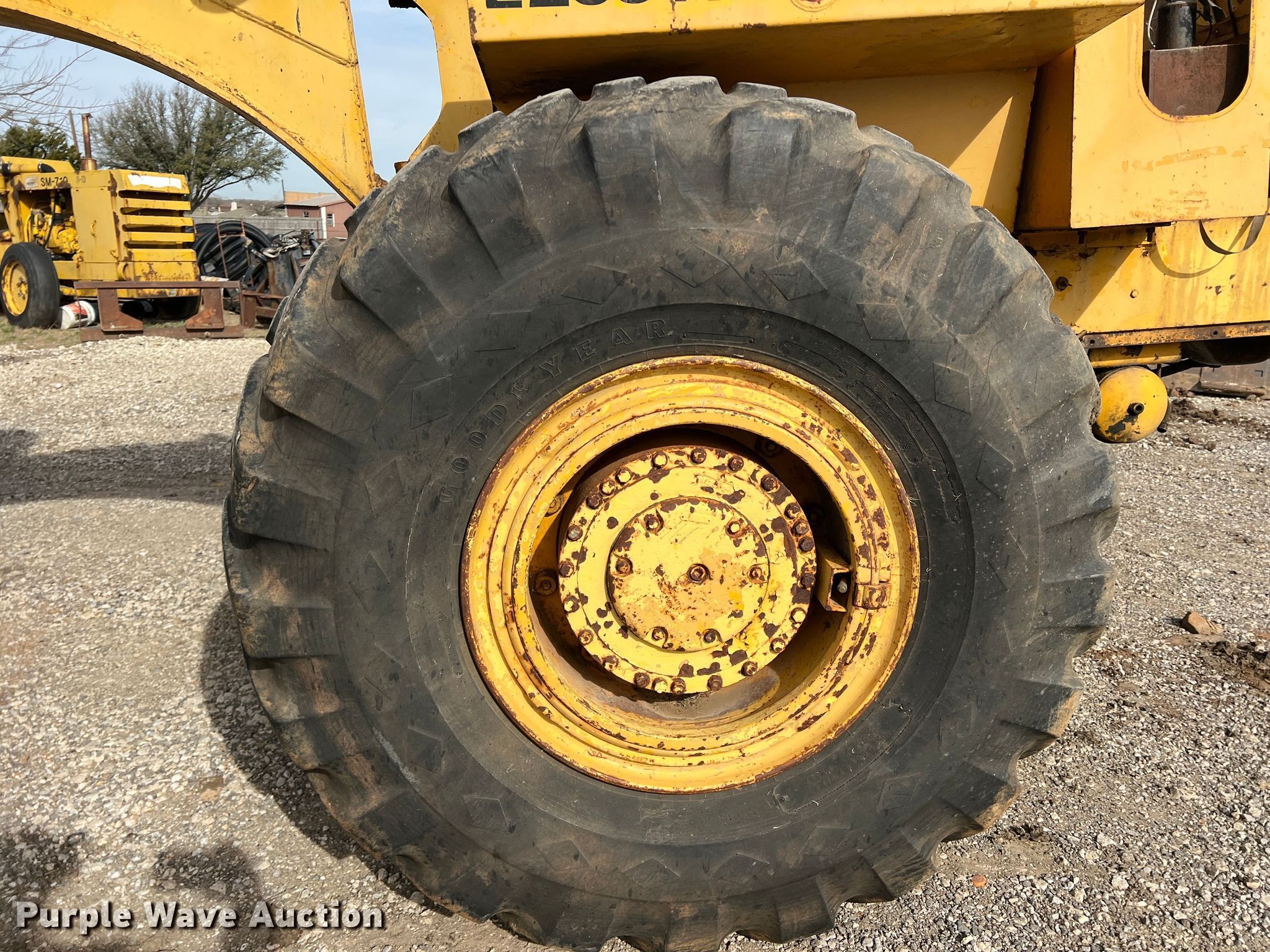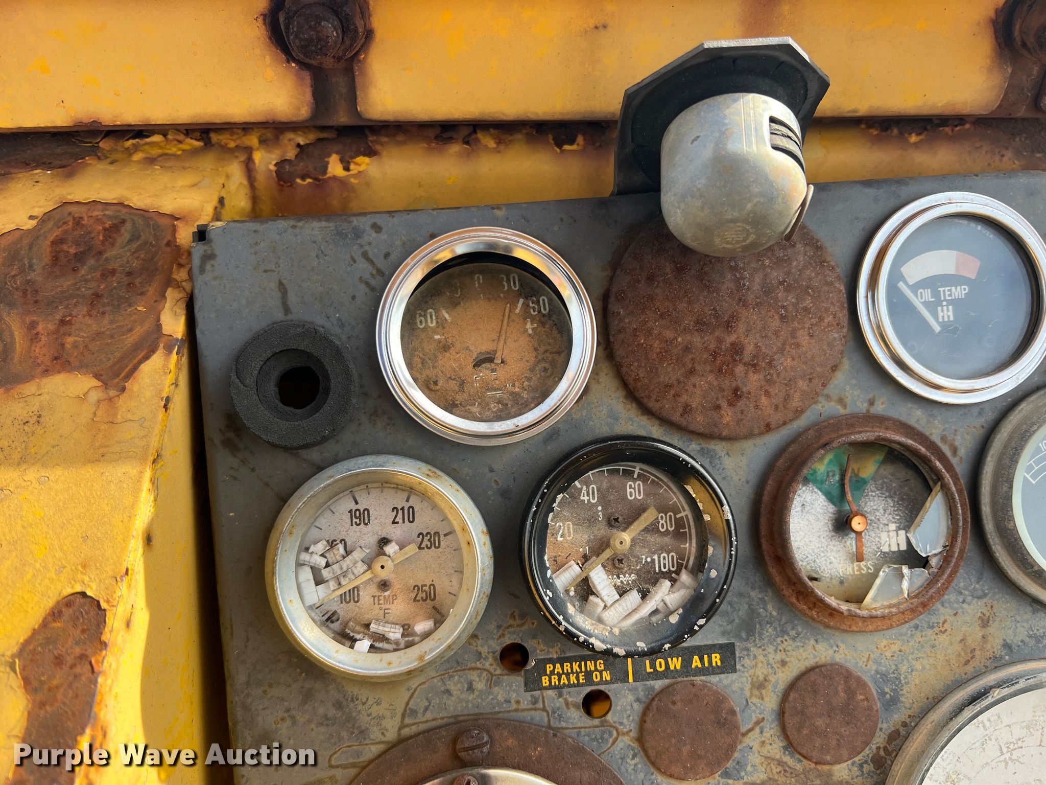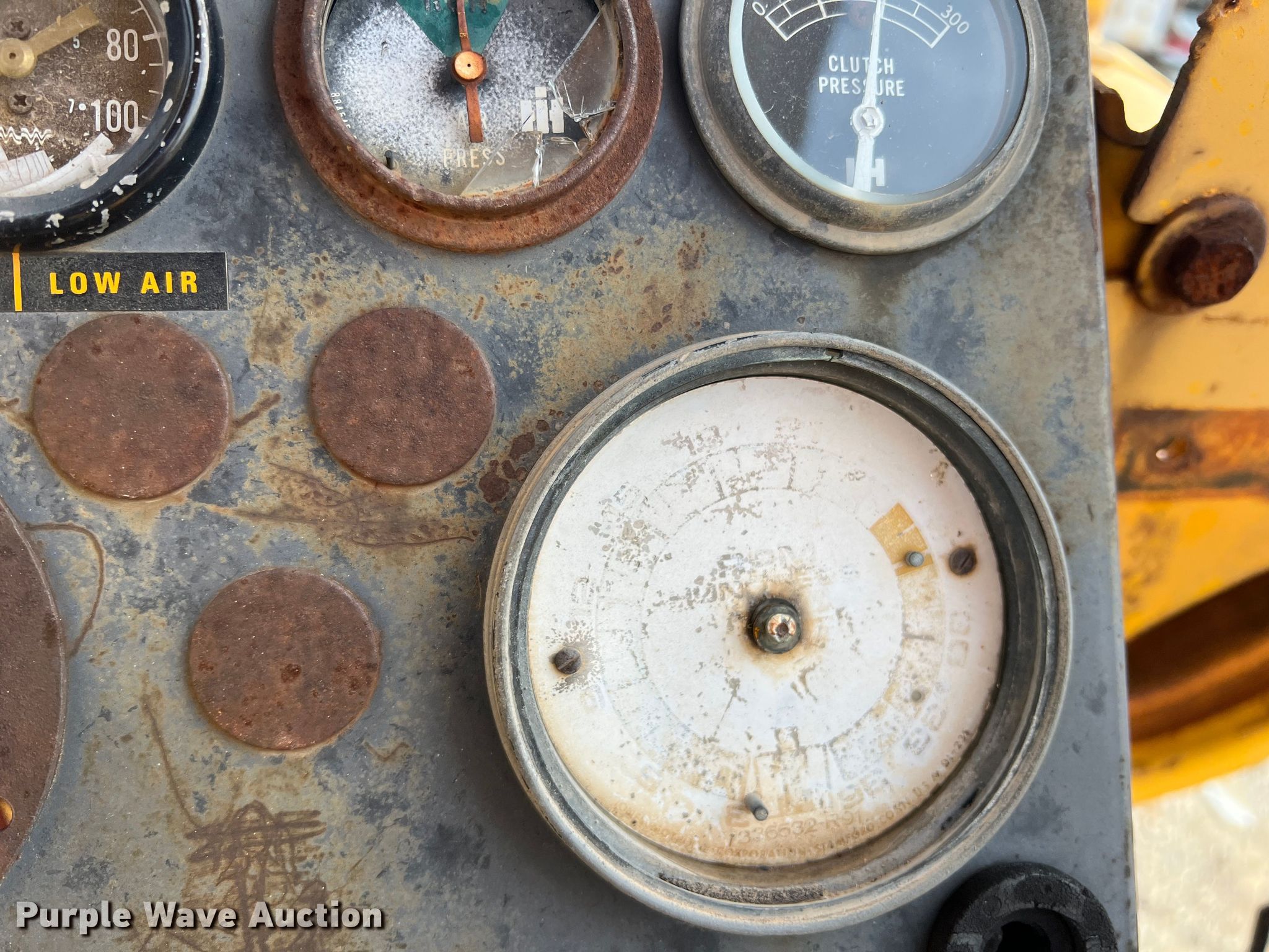 1971 International E200 elevating scraper. Hours: Unknown, Serial: U001974. Engine International, Cylinders: 6, Fuel type: Diesel. Transmission Powershift, 2F - 1R. Chassis Brakes: Air. Operators station EROPS. Features Bowl capacity: 9.5 cu.yd., Elevator reverse, Hydraulic lift, Scraper controls: Lever controls, Rear push block. Tires Size: 23.5-25. Notes Glass cracked, Non-operational brakes , Injection pump issues, leaks. Tisdale Grading & Hauling. 12416 Blakely Lane. Sanger, TX 76266