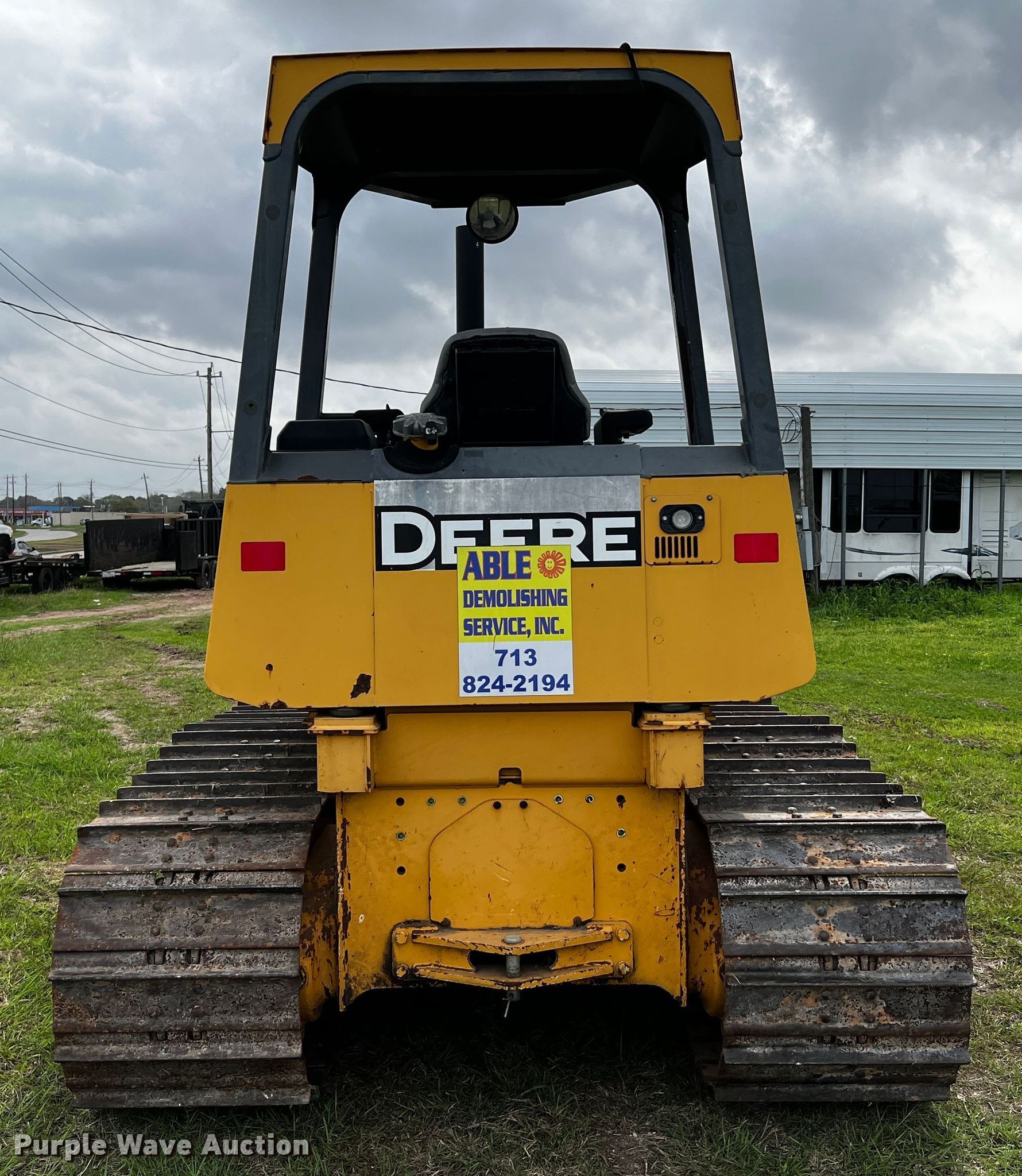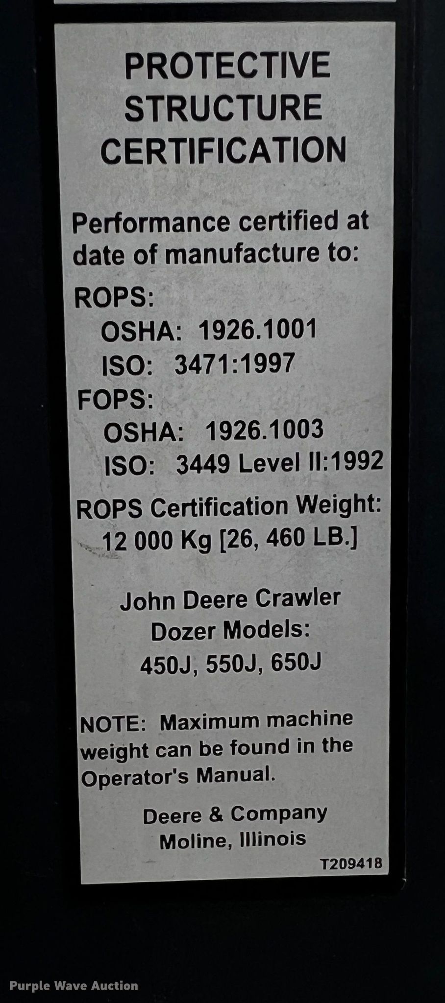 2014 John Deere 450J LGP dozer. Hours: 2,613 on meter, Serial: 1T0450JXLED257437. Engine John Deere, Cylinders: 4, Fuel type: Diesel. Transmission Hydrostatic. Operators station OROPS, Steering: Joystick. Features Dozer blade Type: 6-way, Straight Rake, Width: 9' 7" W. Tracks Width: 24", Grouser pads: Single, Bottom rollers: 12. Able Demolishing Service Inc.. 7550 East Orem Drive. Houston, TX 77075
