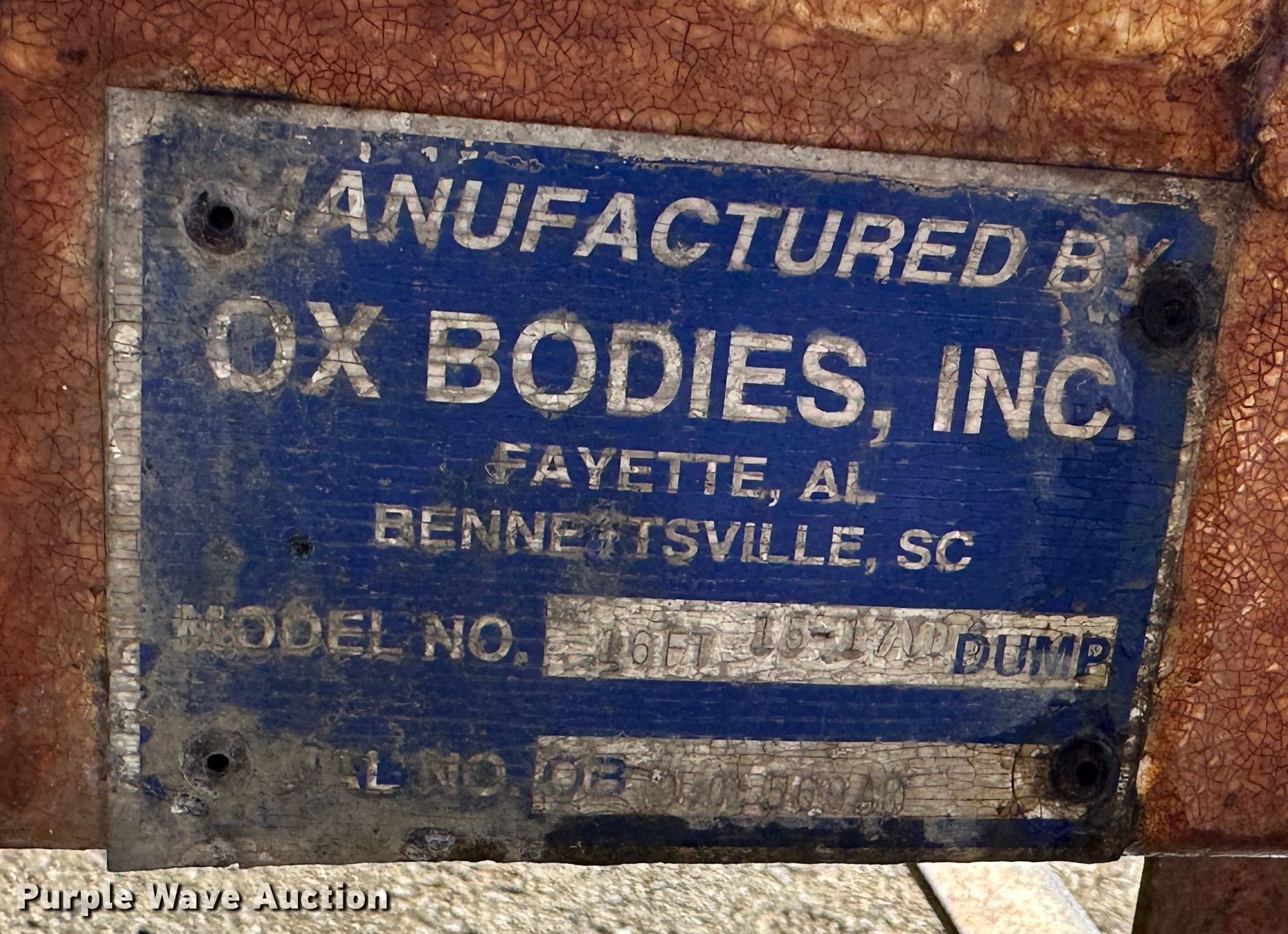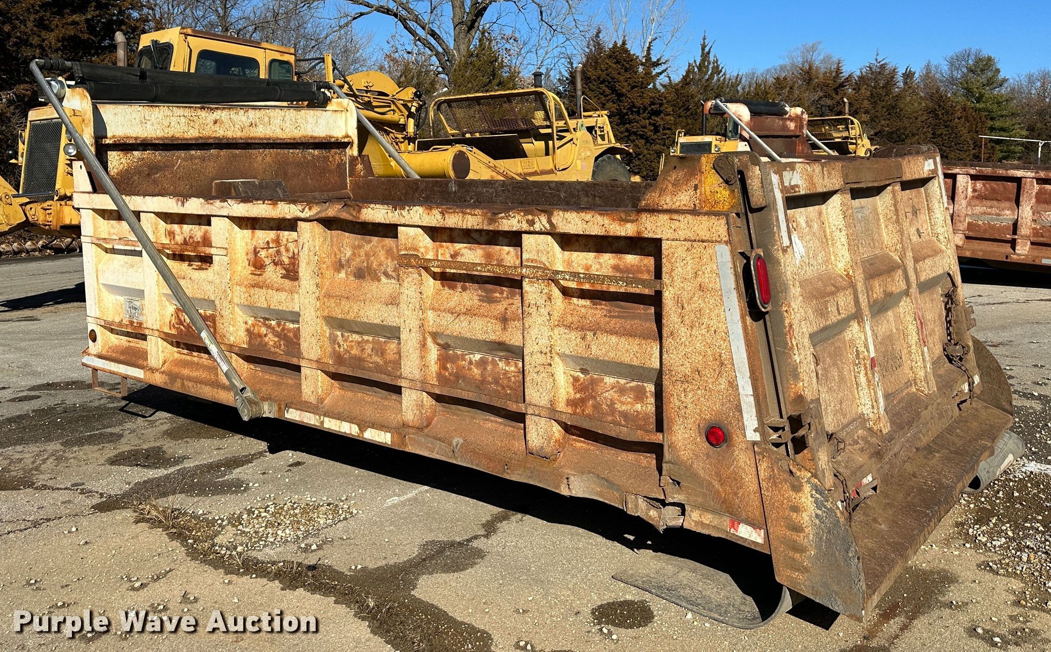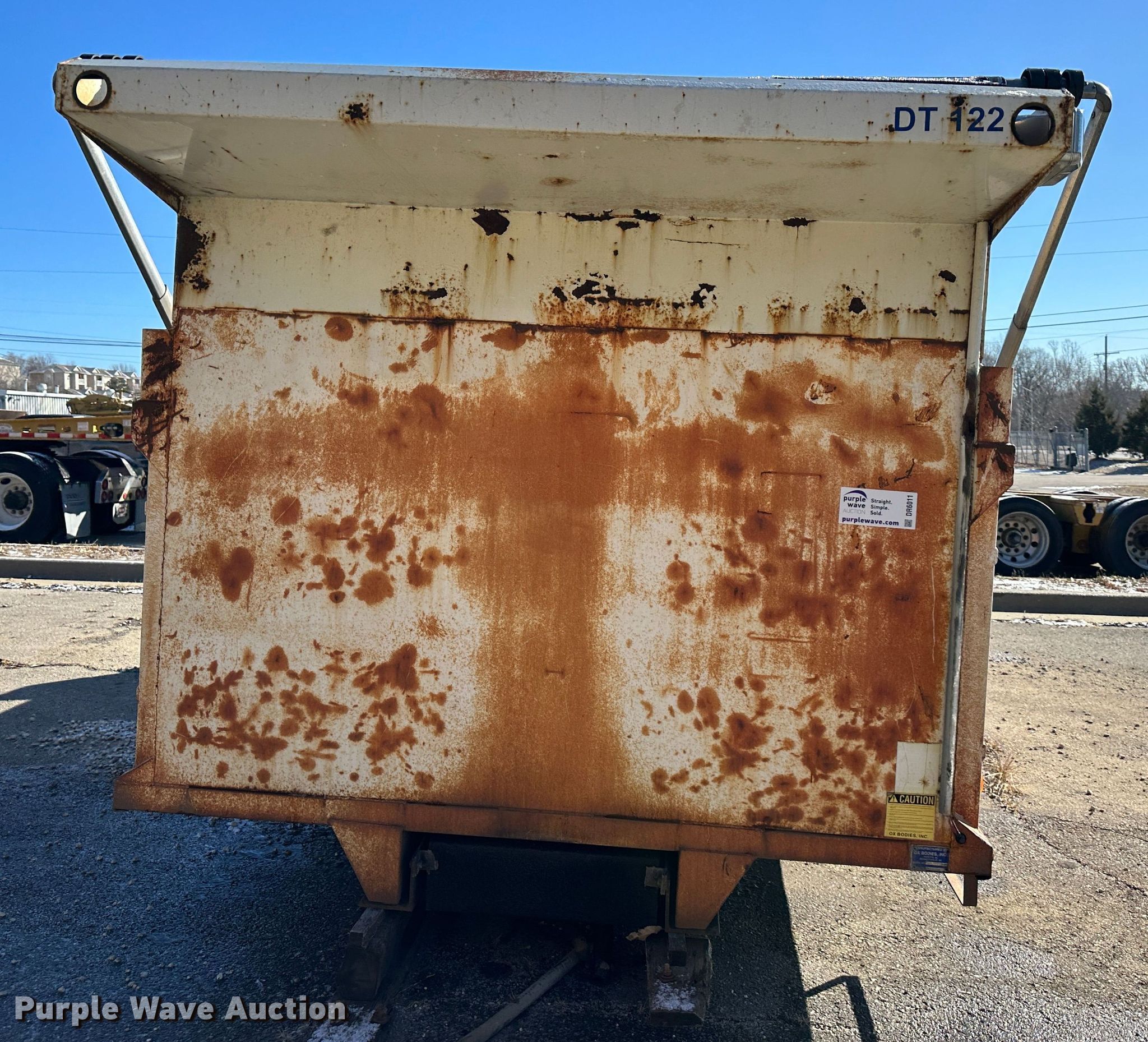 Purple Wave is selling a used Truck Part and Attach. in Kansas. This item is a Ox Bodies dump bed with the following: Capacity: 17 cu.yd., Overall: 17' 7" L x 8' W, Body: 16' L x 8' W, Side height: 46", Bed type: Steel, Roll tarp, End gate: Air operated
