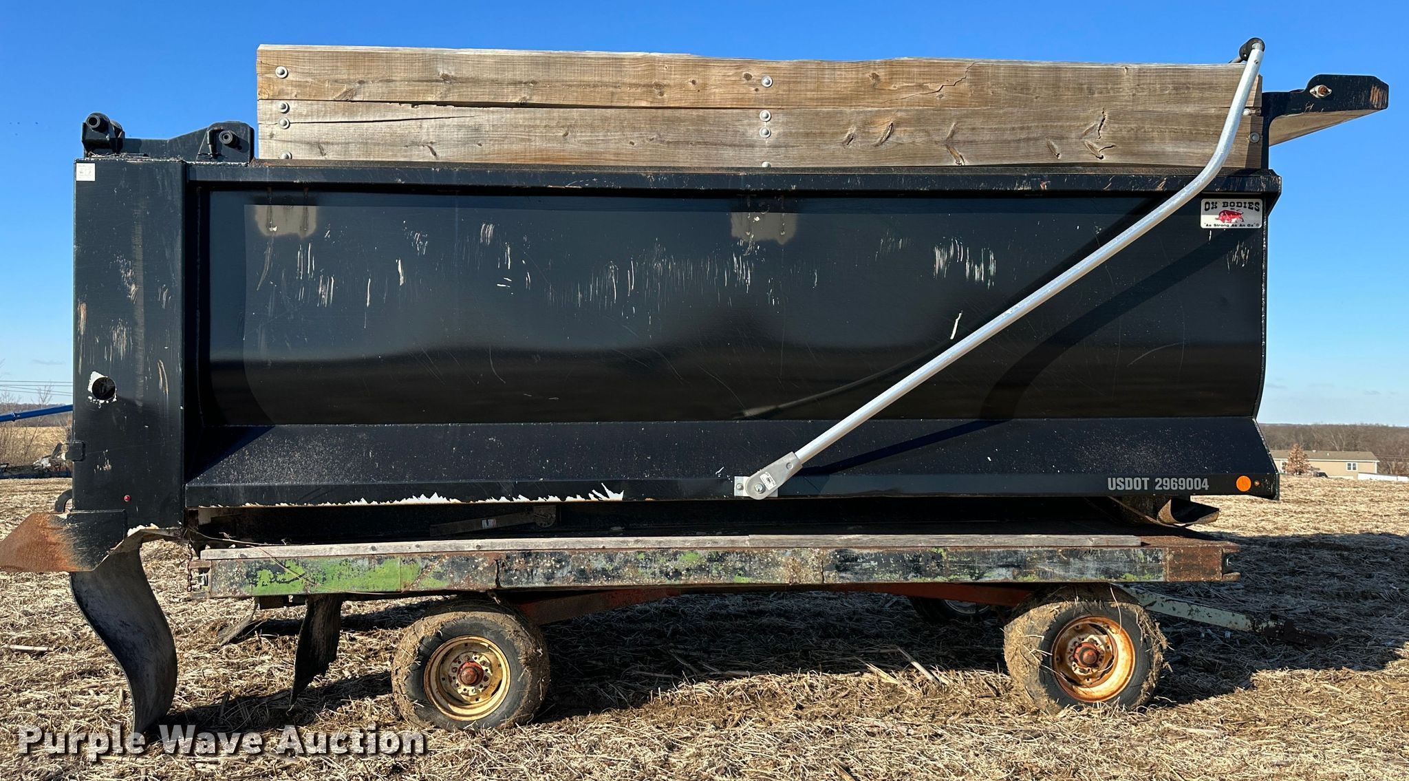 Ox Bodies dump bed. Serial: S18200421001405TXD, 18' L x 96" W, Side height: 60", Side board height: 20", End gate: Air operated, Trailer not included. JJ Hauling. 7151 Missouri 31. Easton, MO 64443