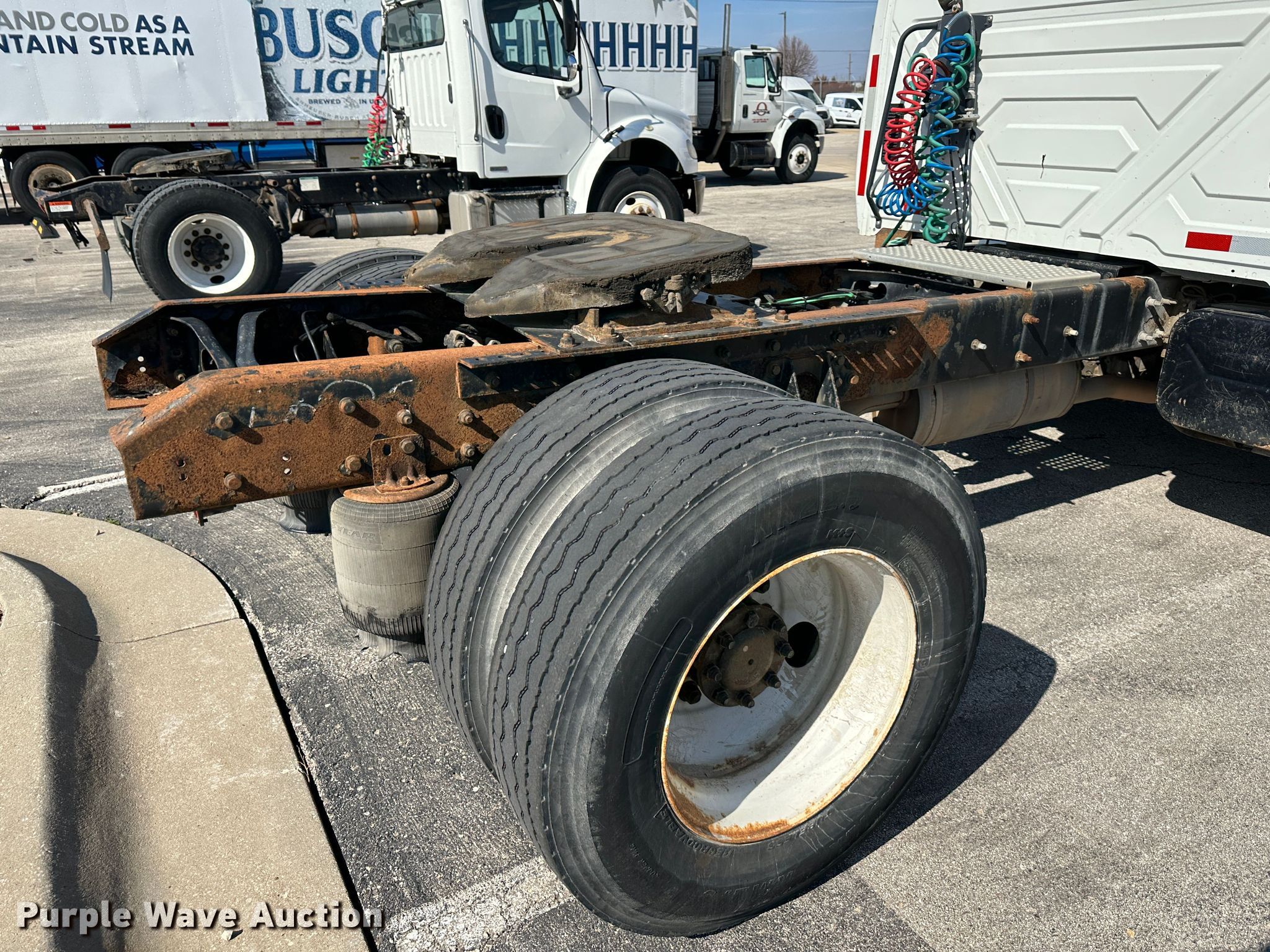 2003 International 4400 semi truck. Miles: 455,492 on odometer, Hours: 16,012 on meter, VIN: 1HSMKAAN93H602694. Engine International DT466, Displacement: 7.6L, Cylinders: 6, Fuel type: Diesel. Transmission Allison, Automatic. Chassis Axles: Single, Suspension: Air, Brakes: Air, Truck chassis: 126", GVWR: 30,000 lbs FAWR: 10,000 lbs, IAWR: 20,000 lbs. Interior AC, Heat, Heated mirrors, Cruise control. Features Deck plate: Steel, Fifth wheel type: Air operated, Sliding, Fuel tank: Single. Tires Size: 11R22.5. Kansas title. Title distribution may be delayed up to 14 days from verification of funds. O'Malley Beverage of KS. 2050 Packer Court. Lawrence, KS 66044