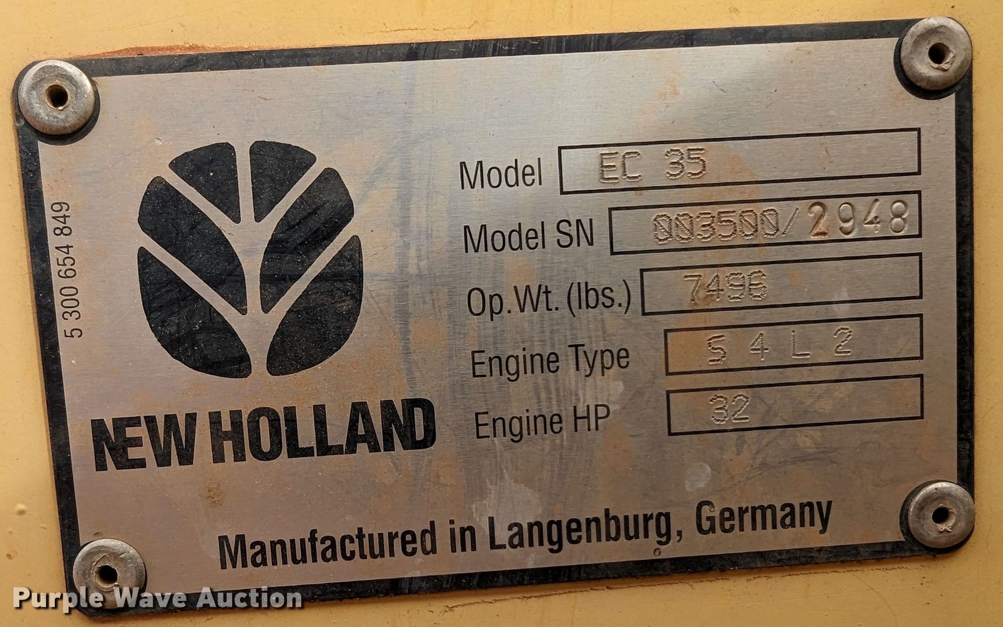 Purple Wave is selling a used Mini Excavator in Oklahoma. This item is a 2001 New Holland EC35 mini excavator with the following: Hours: 1,125 on meter, Serial: 2948
