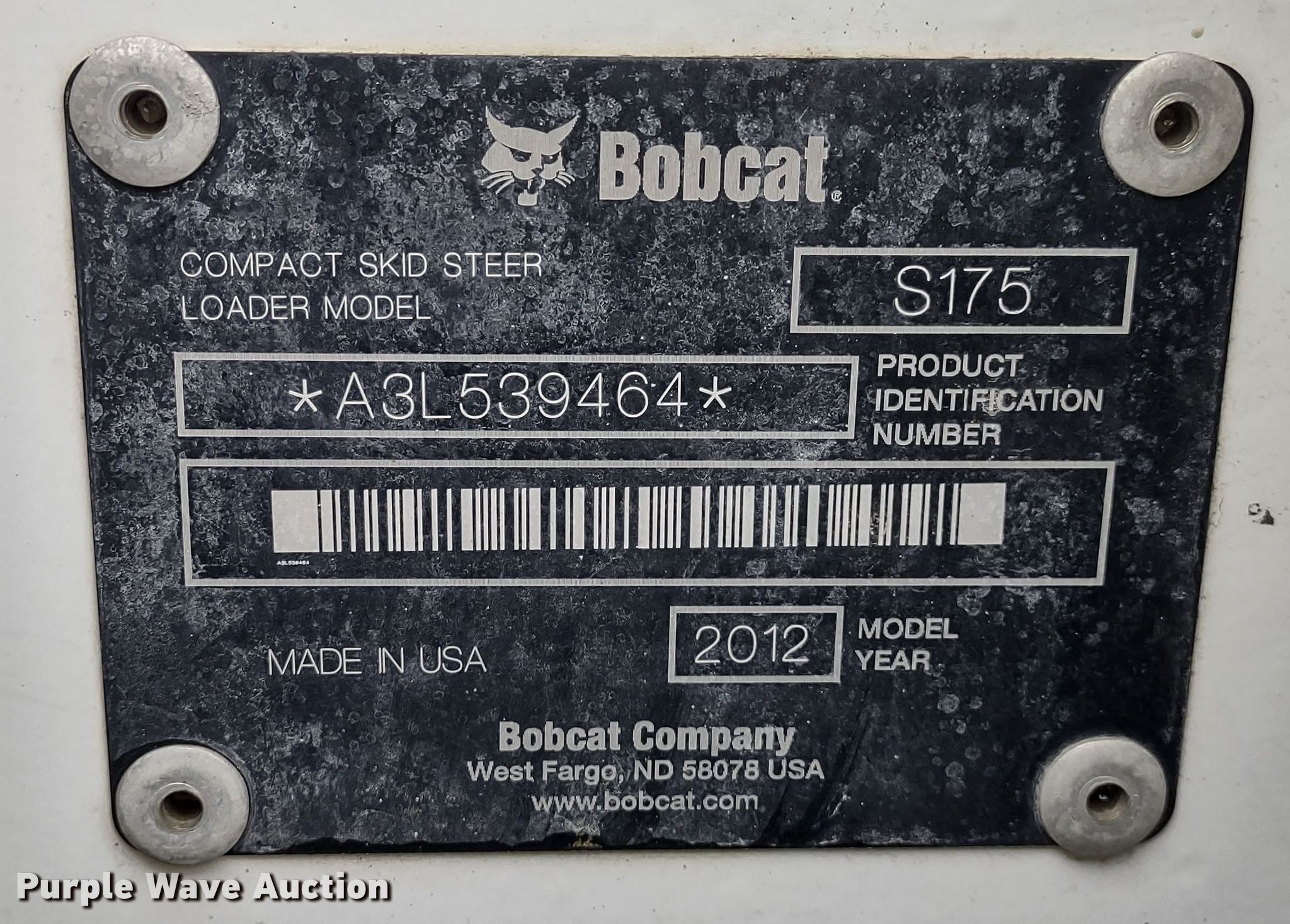 Purple Wave is selling a used Skid Steer Loader in Kansas. This item is a 2012 Bobcat S175 skid steer loader with the following: Hours: 2,127 on meter, Serial: A3L539464