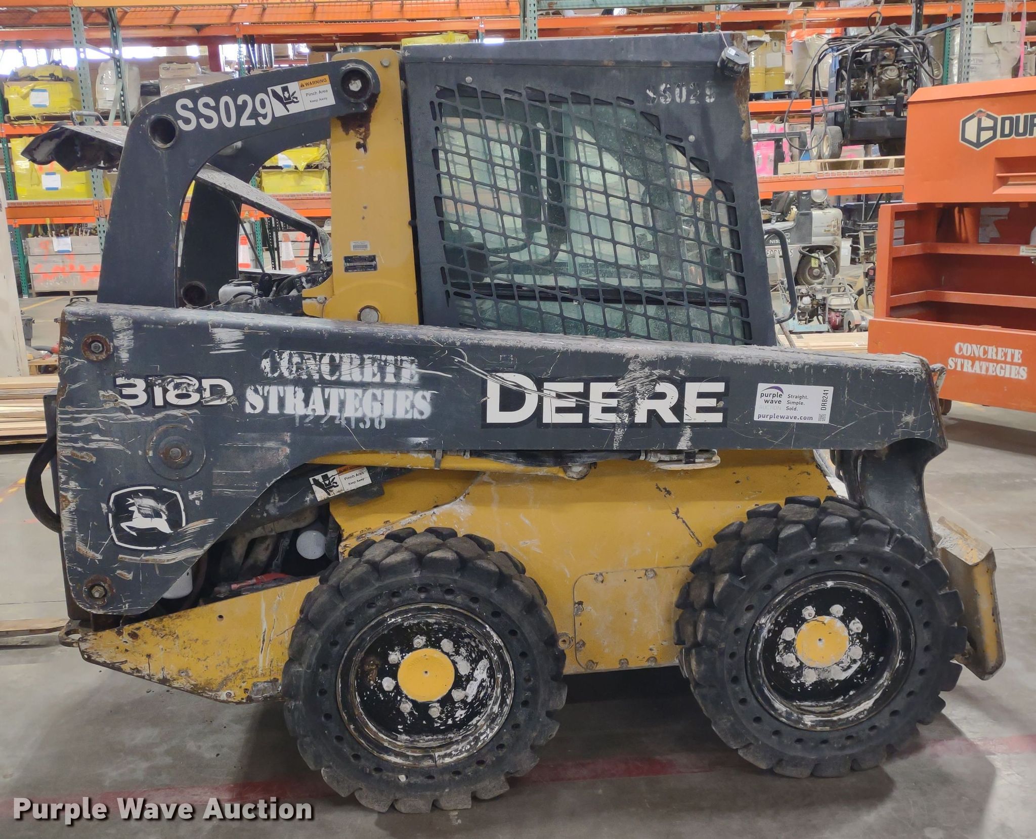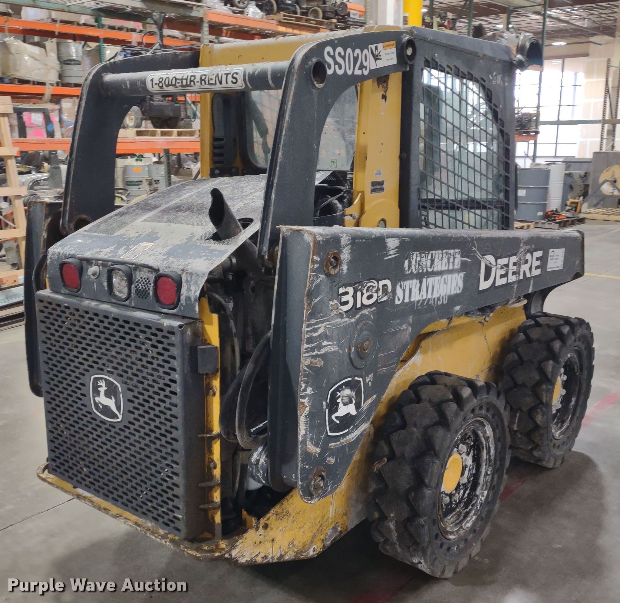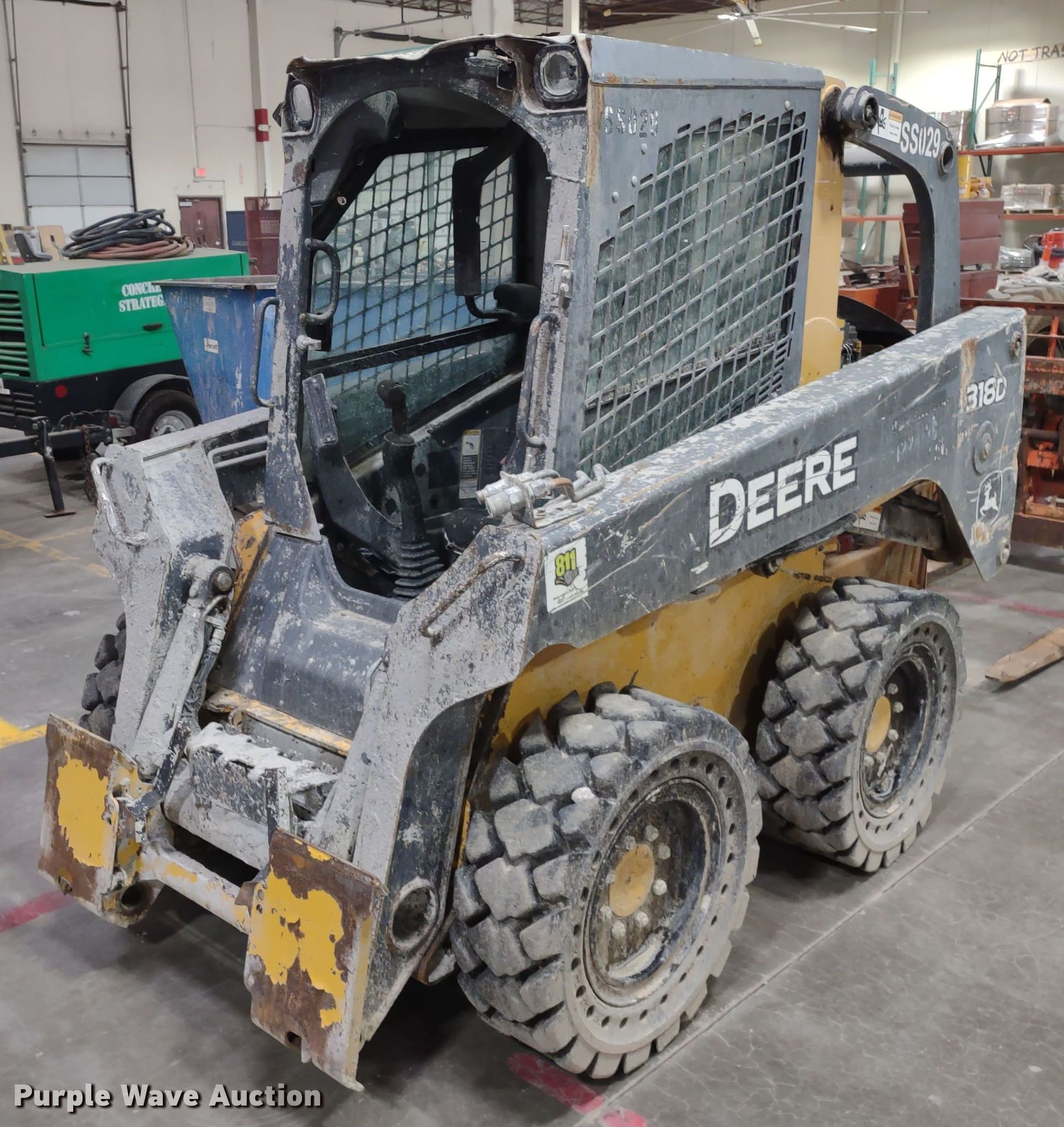 2011 John Deere 318D skid steer loader. Hours: 2,986 on meter, Serial: 1T0318DAVBG205181. Engine Cylinders: 4, Fuel type: Diesel, HP: 63. Transmission Hydrostatic. Operators station Enclosed cab, AC, Heat, Bucket control: Foot. Features Auxiliary hydraulics, Quick coupler: Manual. Tires Size: 30x10-16, Solid. Notes Door missing, Dead battery. Concrete Strategies, Inc.. Lenexa, KS 66227