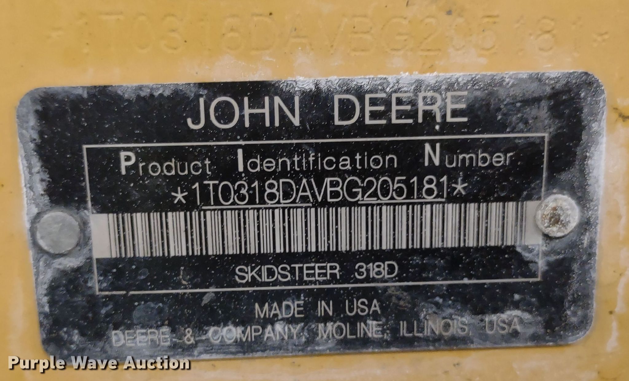 Purple Wave is selling a used Skid Steer Loader in Kansas. This item is a 2011 John Deere 318D skid steer loader with the following: Hours: 2,986 on meter, Serial: 1T0318DAVBG205181