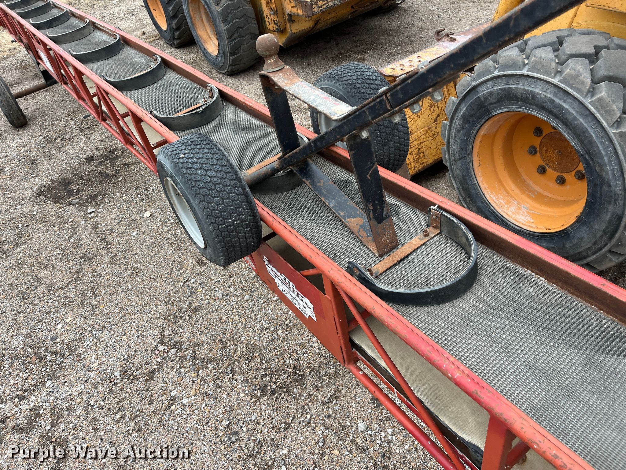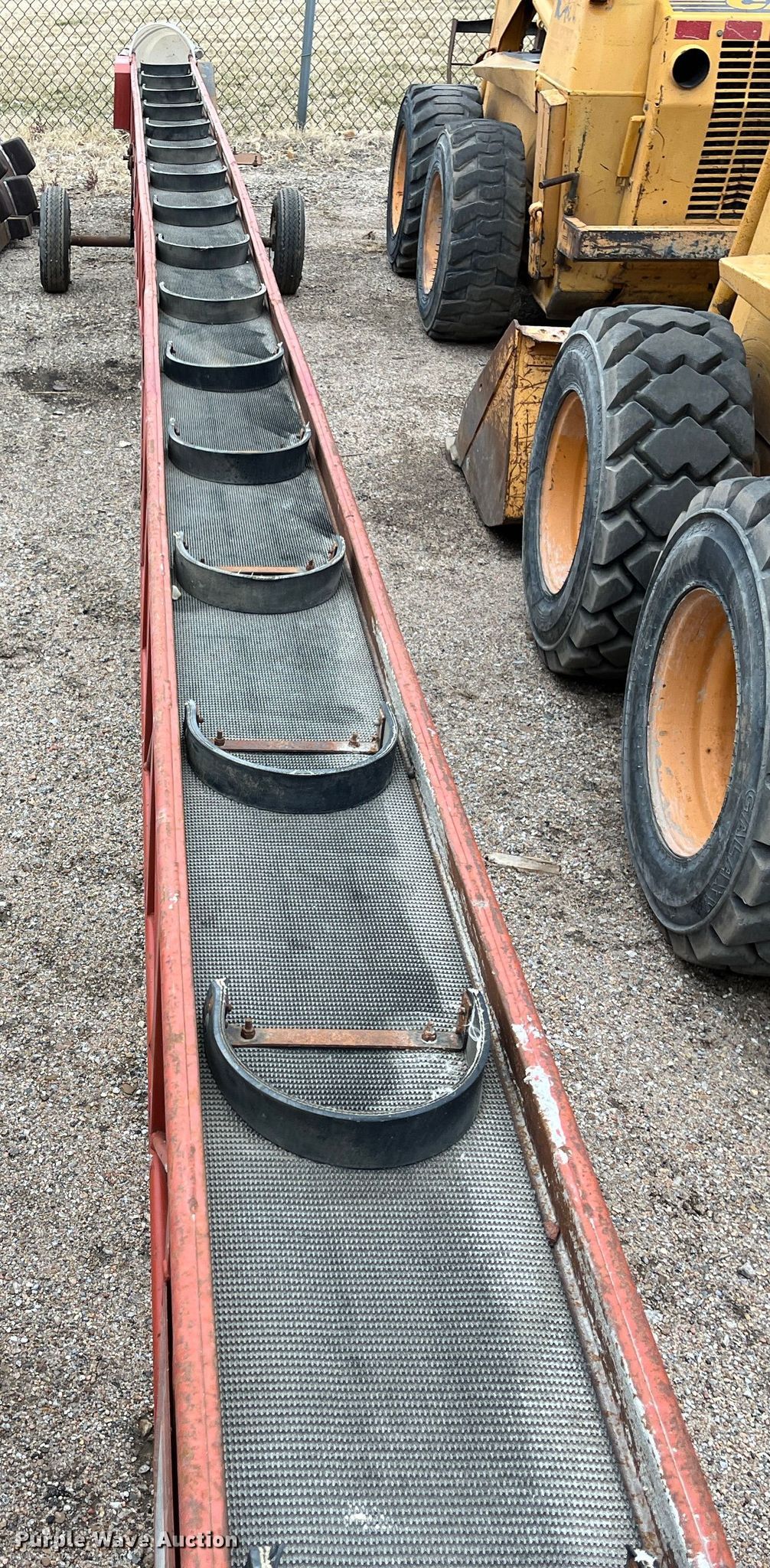 Purple Wave is selling a used Conveyor in Kansas. This item is a Cleasby C-3-31 conveyor with the following: 30' L, 10" W belt, 30" X 21" hopper, 4.80-8 tires, Serial: RL10082572