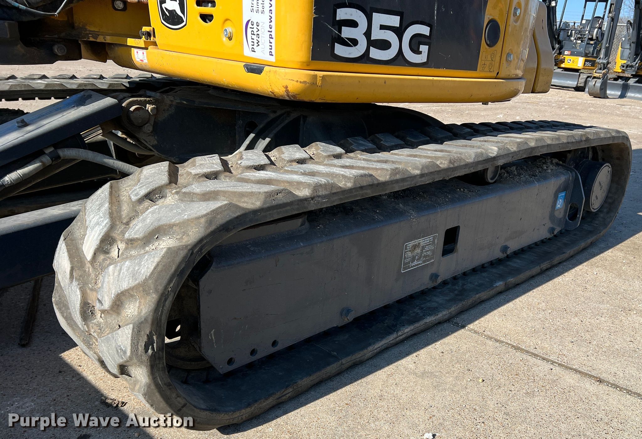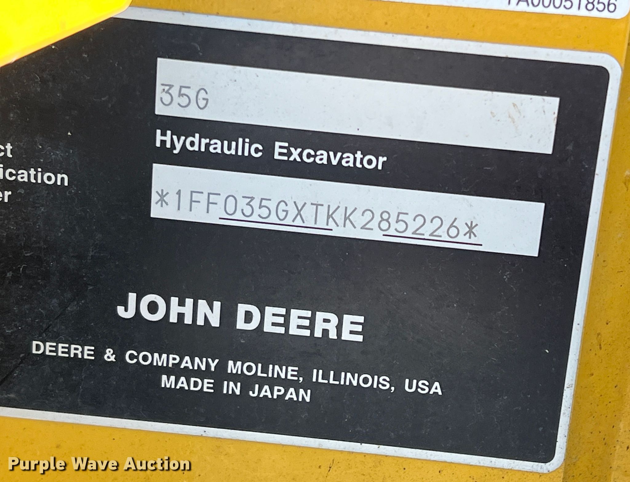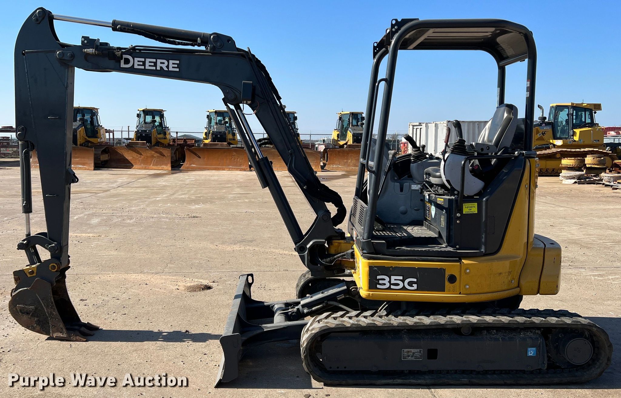Purple Wave is selling a used Mini Excavator in Texas. This item is a 2019 John Deere 35G mini excavator with the following: Hours: 1,021 on meter, Serial: 1FF035GXTKK285226