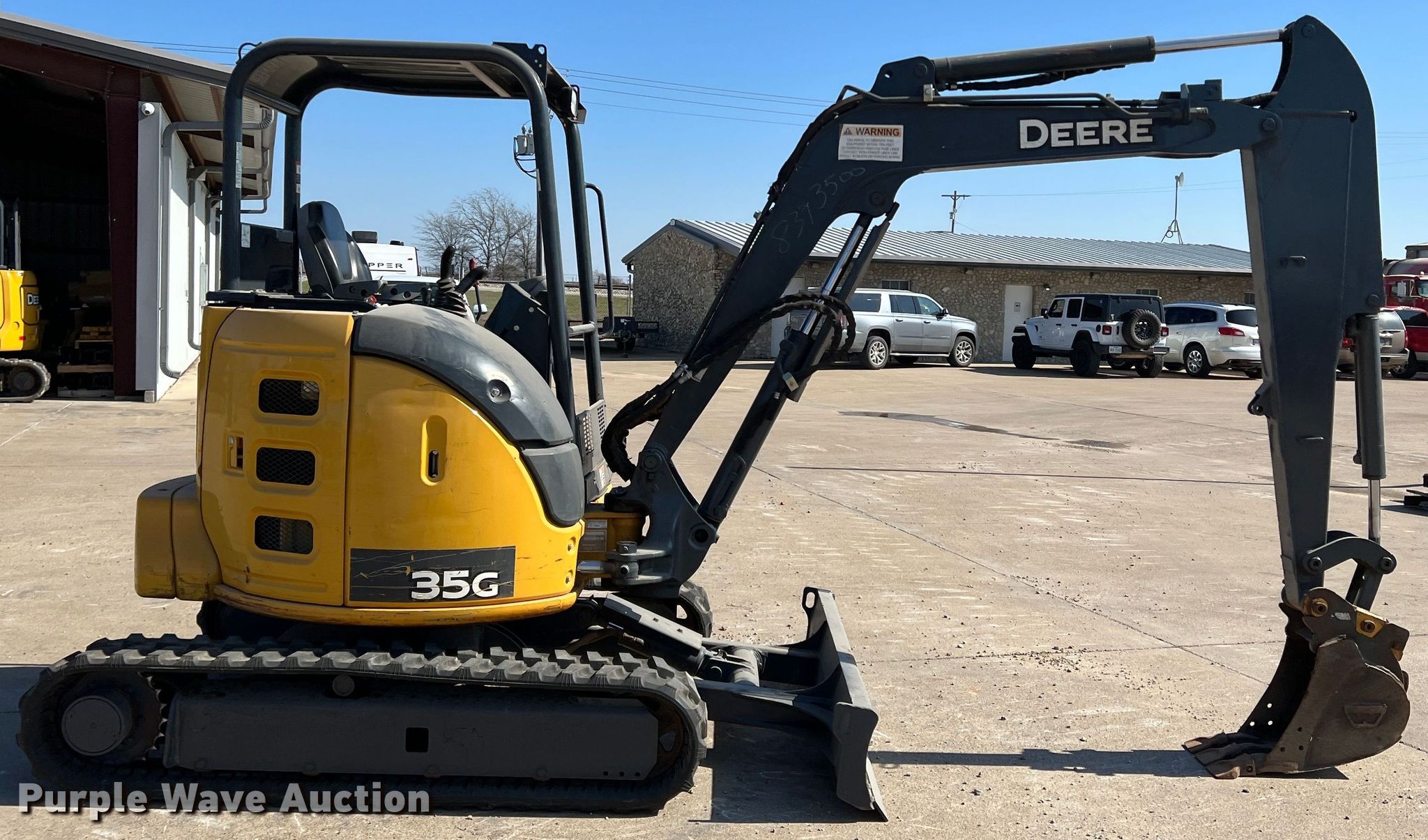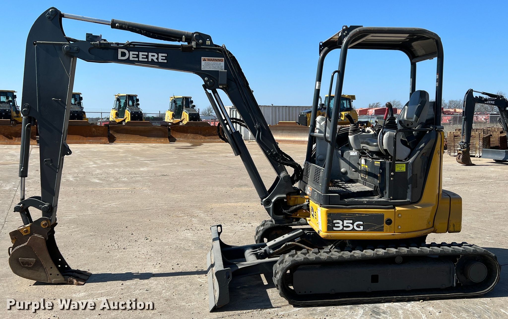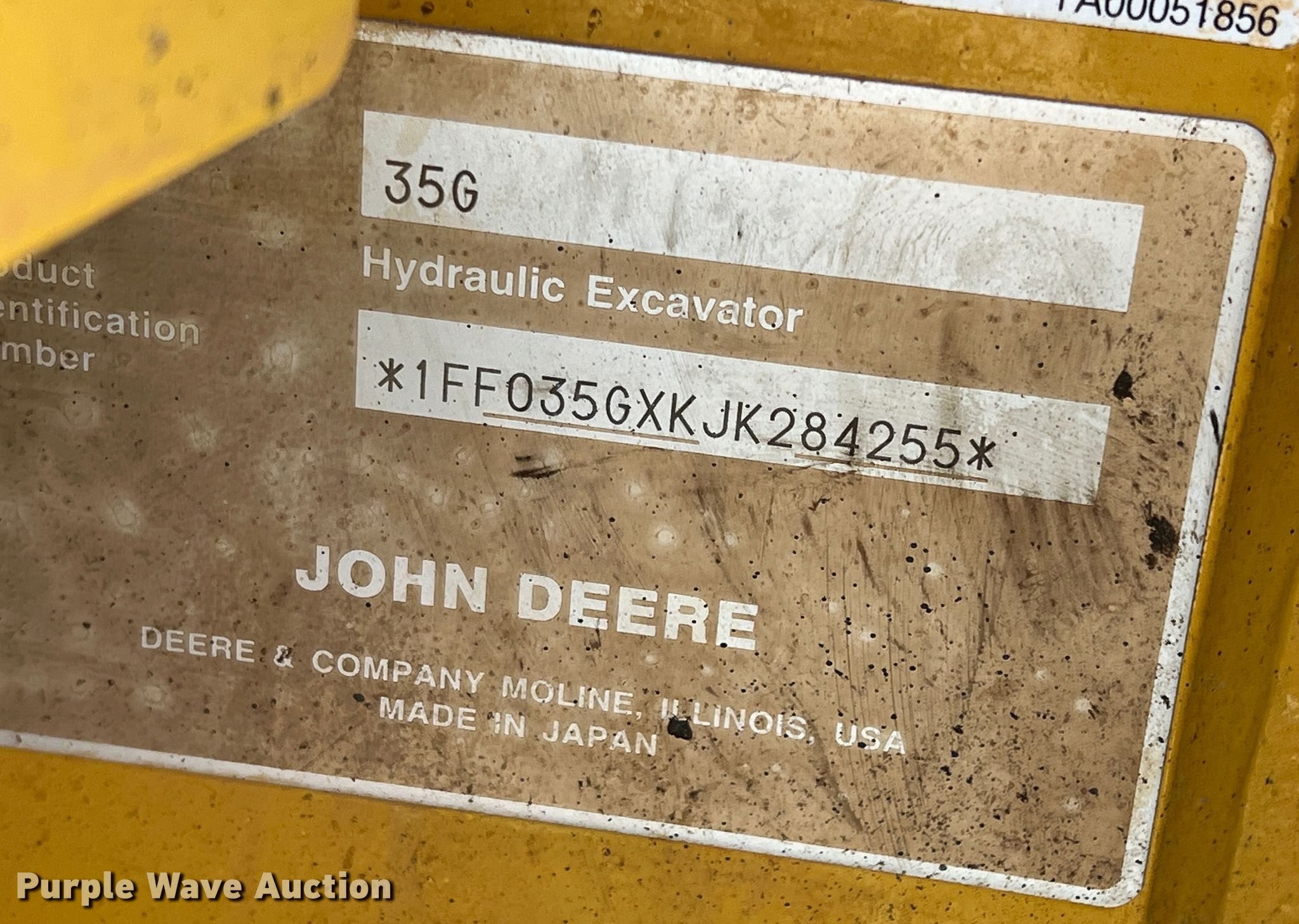 Purple Wave is selling a used Mini Excavator in Texas. This item is a 2019 John Deere 35G mini excavator with the following: Hours: 2,189 on meter, Serial: 1FF035GXKJK284255