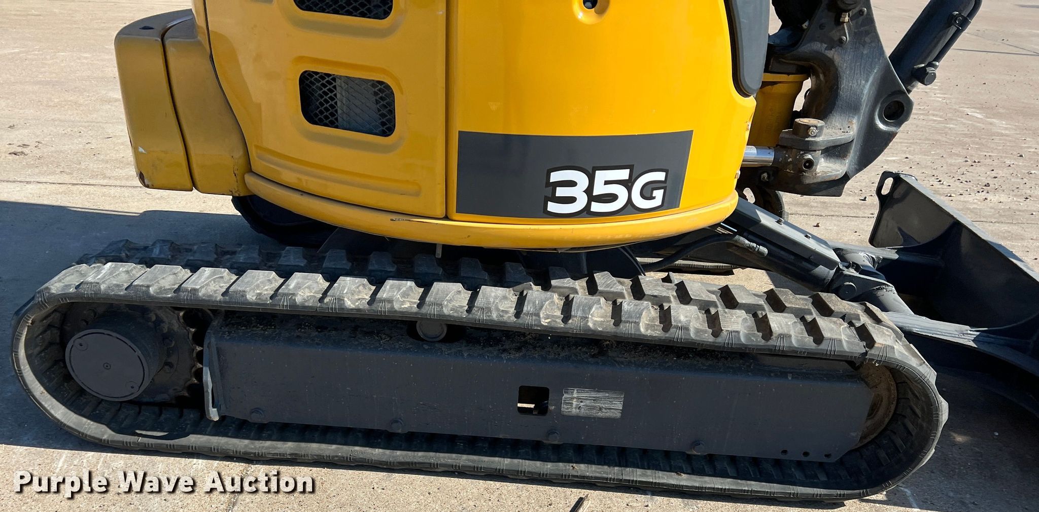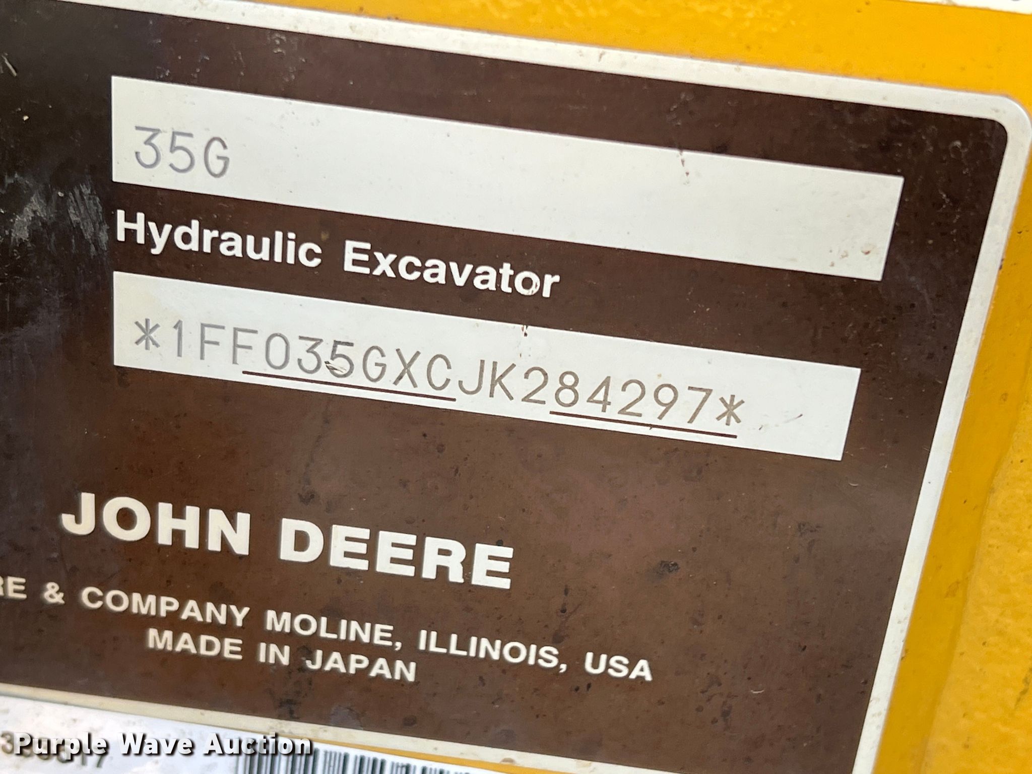 Purple Wave is selling a used Mini Excavator in Texas. This item is a 2019 John Deere 35G mini excavator with the following: Hours: 1,263 on meter, Serial: 1FF035GXCJK284297