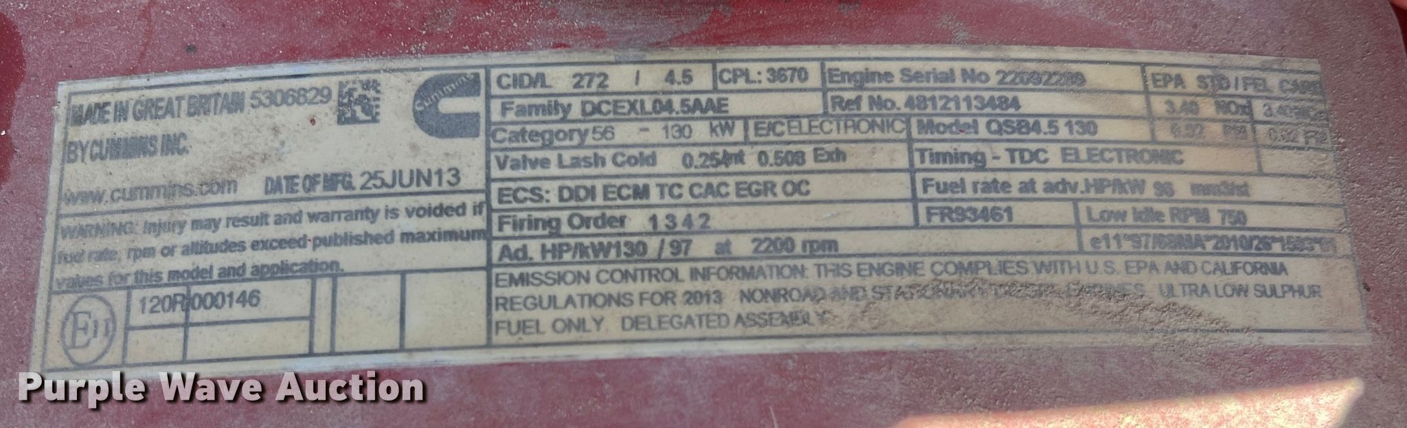 Dynapac CA2500PD single drum vibratory roller. Hours: 3,188 on meter, Serial: 10000138C0A012376. Engine Cummins QSB4.5 130, Serial: 22090089, Displacement: 4.5L, Cylinders: 4. Transmission Hydrostatic, Two speed travel. Features Drum: Padfoot, Vibratory system: Double, Front drum Width: 86", Diameter: 67", Drum scrapers: Front. Tires Size: 23.1-26. Howard Equipment Company. 1310 N Cresson Hwy. Cresson, TX 76035