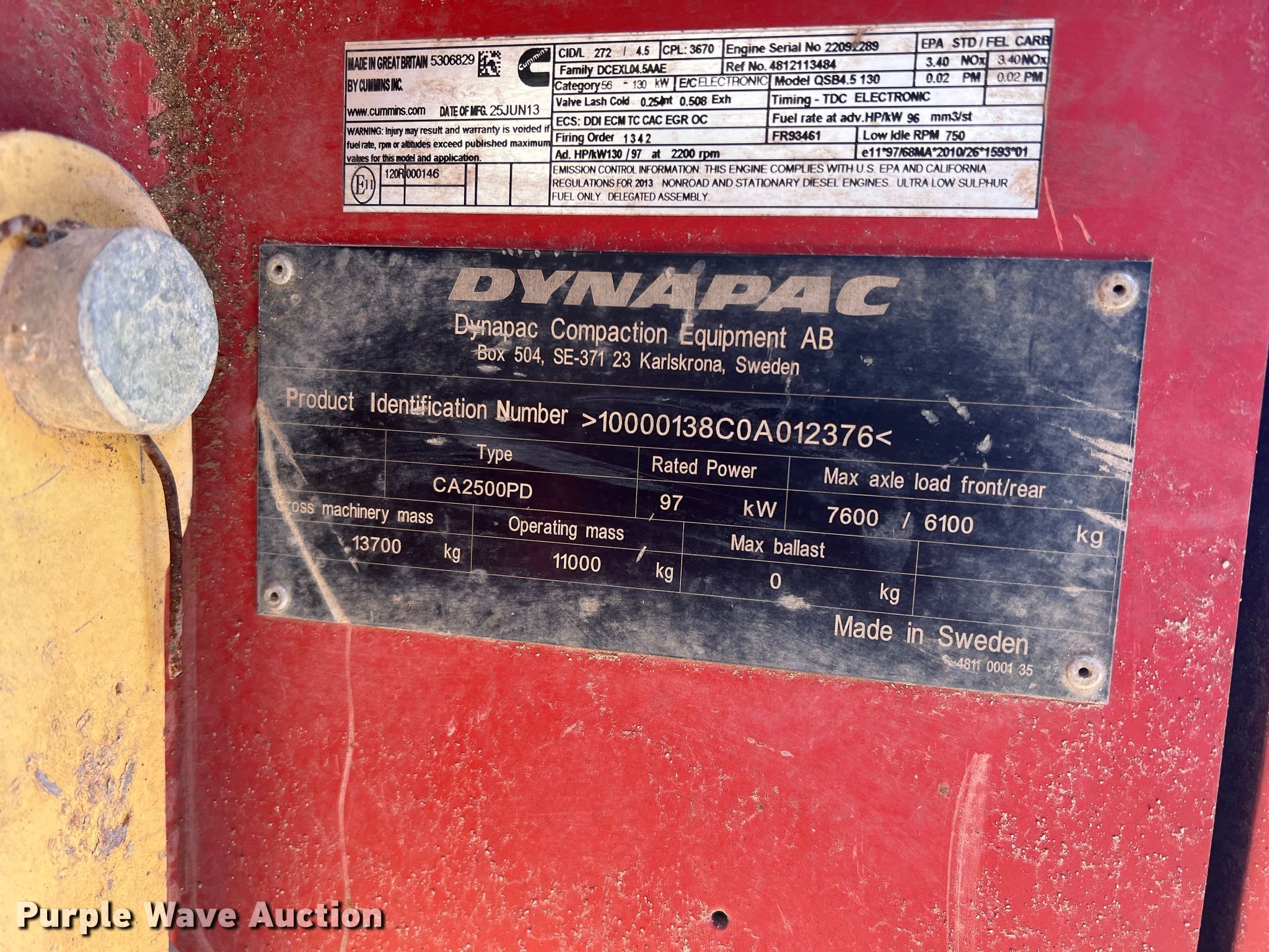 Purple Wave is selling a used Single Drum Roller Compactor in Texas. This item is a Dynapac CA2500PD single drum vibratory roller with the following: Hours: 3,188 on meter, Serial: 10000138C0A012376