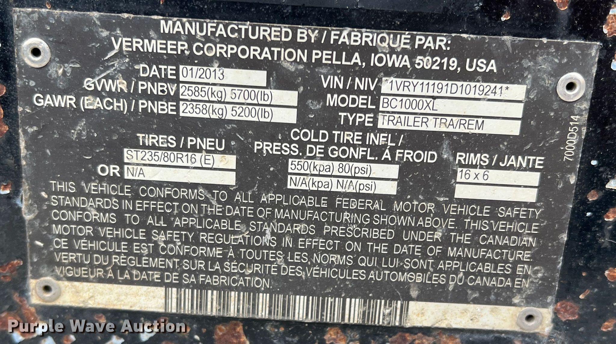 2013 Vermeer BC1000XL wood chipper. Hours: 3,761 on meter, VIN: 1VRY11191D1019241. Engine Cummins , Displacement: 3.3L, Cylinders: 4, Fuel type: Diesel, HP: 85. Features Capacity: 12", Throat opening: 17" x 17". Tires Size: 225/75R15. Trailer Vermeer , 15' L x 60" W, Brakes: Electric, Axles: Single, Tire size: 225/75R15. Transfer of ownership documentation will be a bill of sale. Hardin Tree Inc.. 1700 South Stewart Street. Azle, TX 76020
