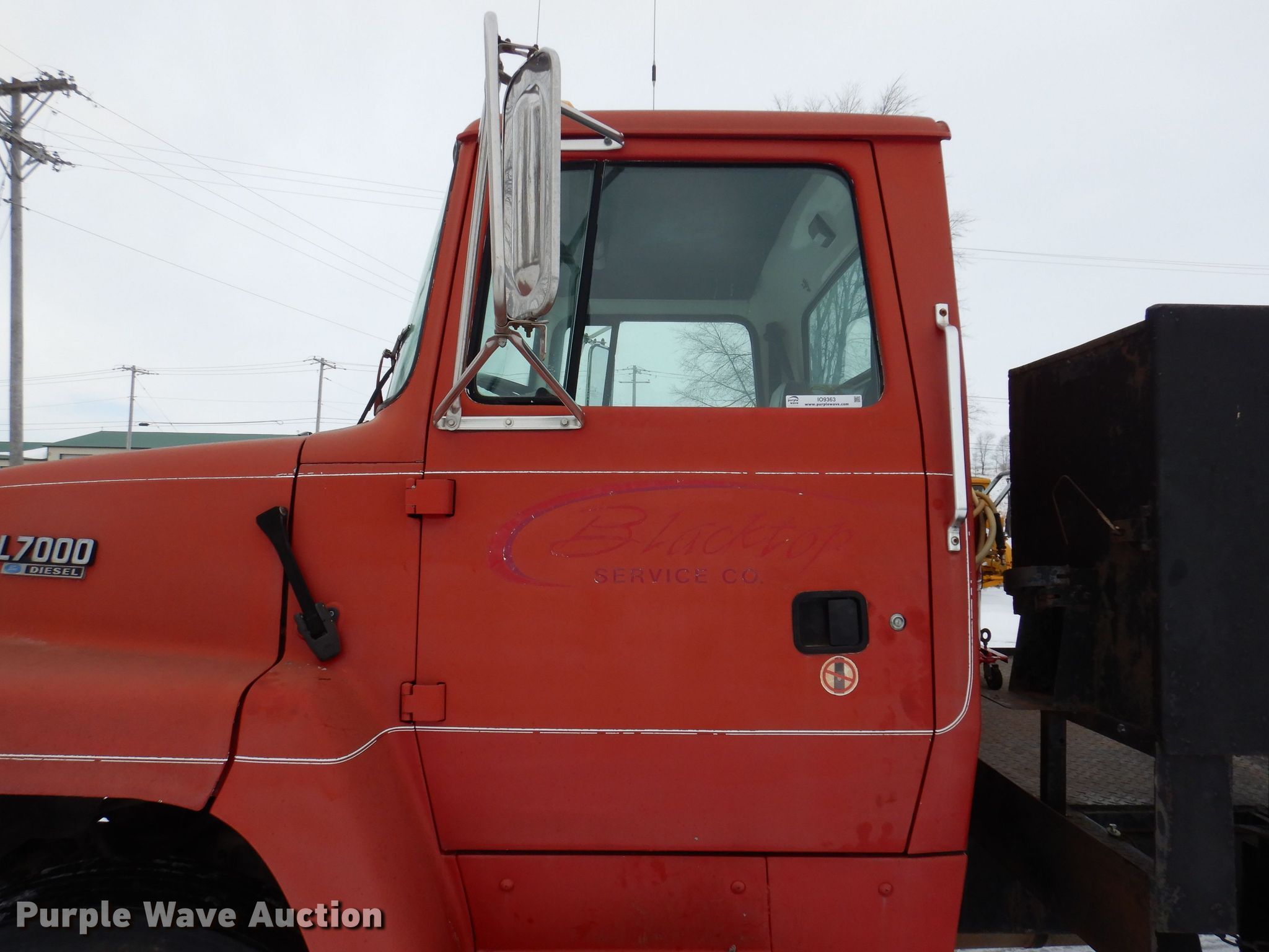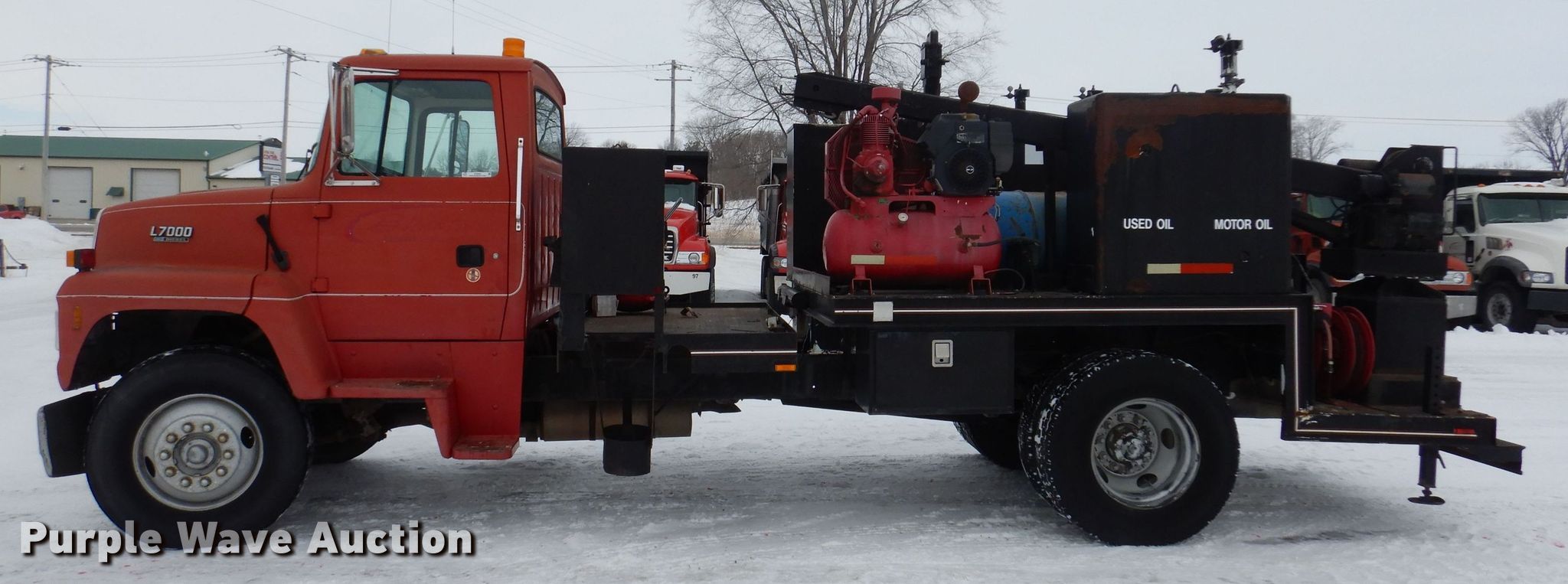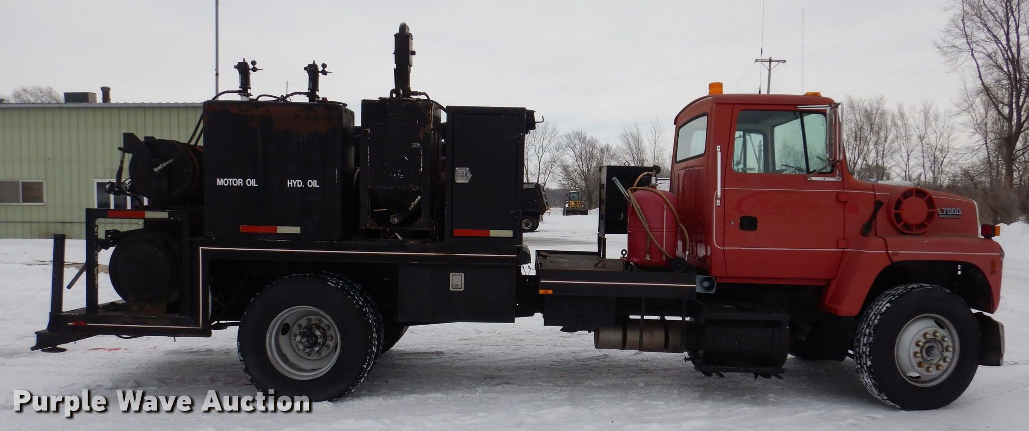 1991 Ford L7000 fuel / lube truck. Miles: 428,078 on odometer, VIN: 1FDPR72P9MVA26365. Engine Serial: VX088100, Displacement: 6.6L, Cylinders: 6, Fuel type: Diesel. Transmission Manual, Speed: 6. Chassis Axles: Single, Suspension: Spring, Brakes: Hydraulic, GVWR: 30,000 lbs, Wheelbase: 246". Interior AC, Heat, Brake controller. Features Bed / tank Southwest Products Corp. 768, Serial: C0242, 12' L x 96" W, Compartments: 4, Hose reels: 4, Nozzles, Oil/lube reservoirs Hydraulic fluid, Motor oil, Used oil, Champion air compressor Kohler Command 11 single cylinder gas engine, Hose reels: 2, Crane, Sand blaster, Torch rack. Tires Size: 11R22.5. Notes Unknown operating condition of air compressor, Dash warning indicator: Brake, Rear end leak, Unknown operating condition of sand blaster. Iowa title. Title distribution may be delayed up to 14 days from verification of funds. Blacktop Service Co.. 1648 Hwy 169. Fort Dodge, IA 50501