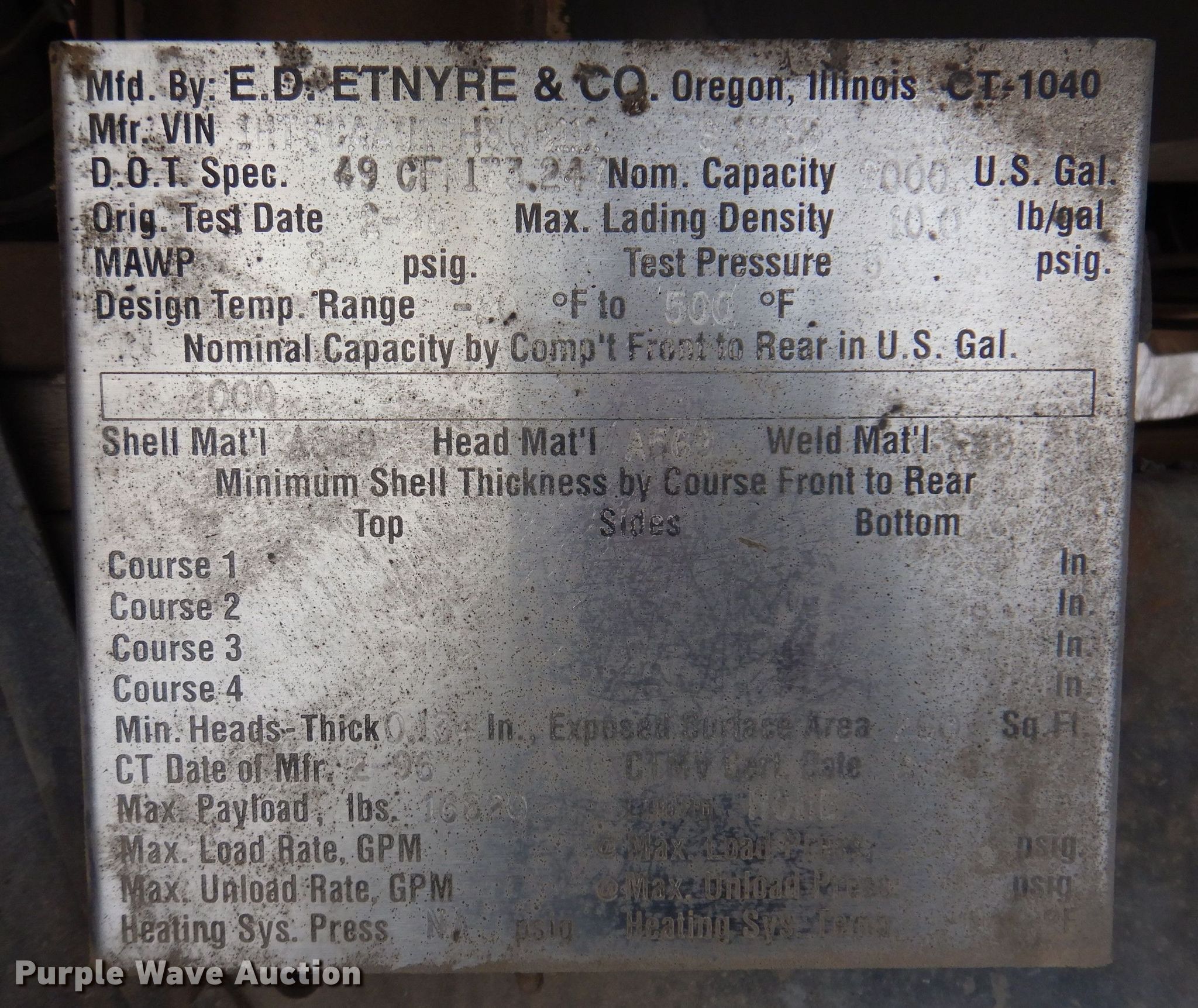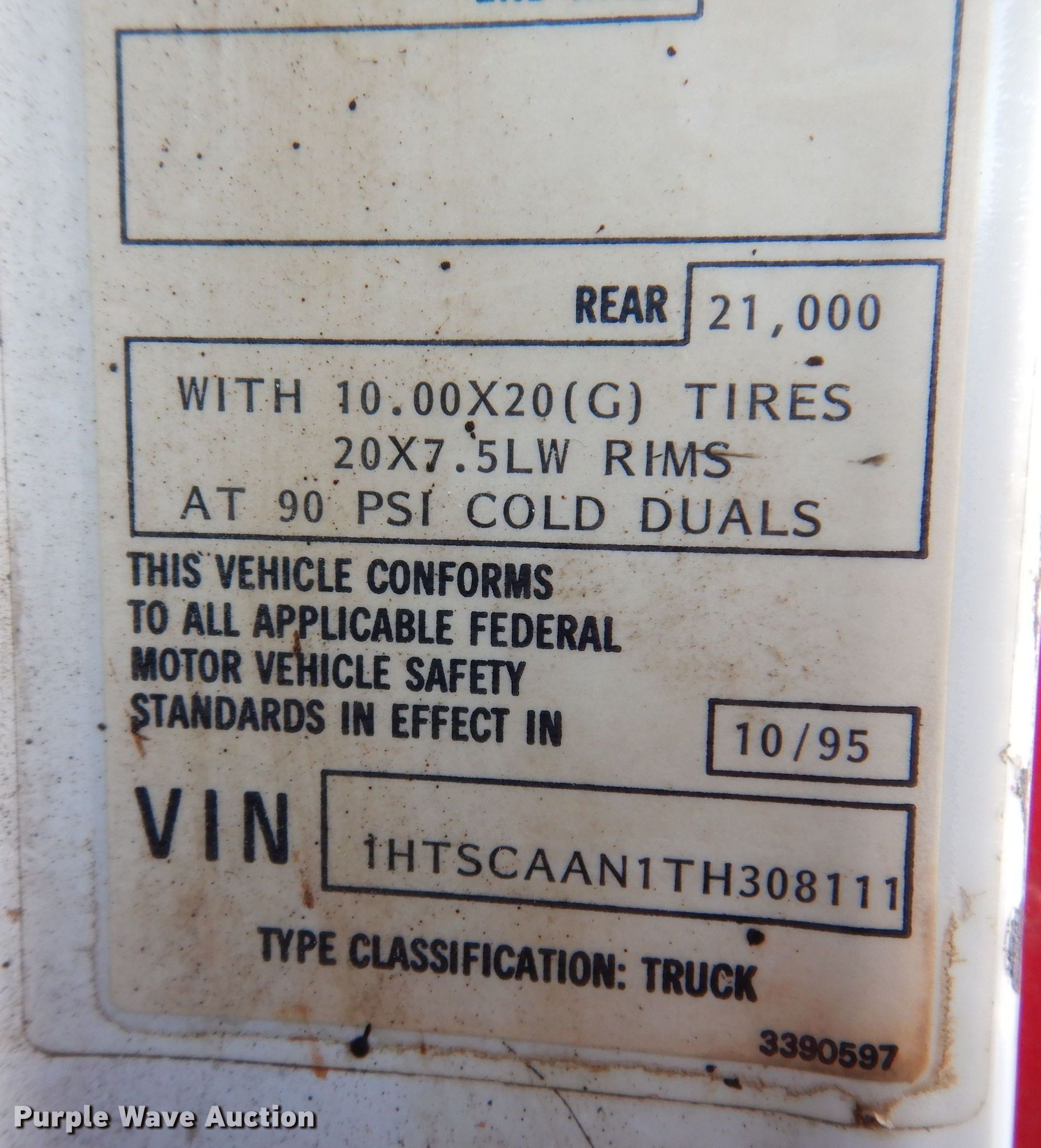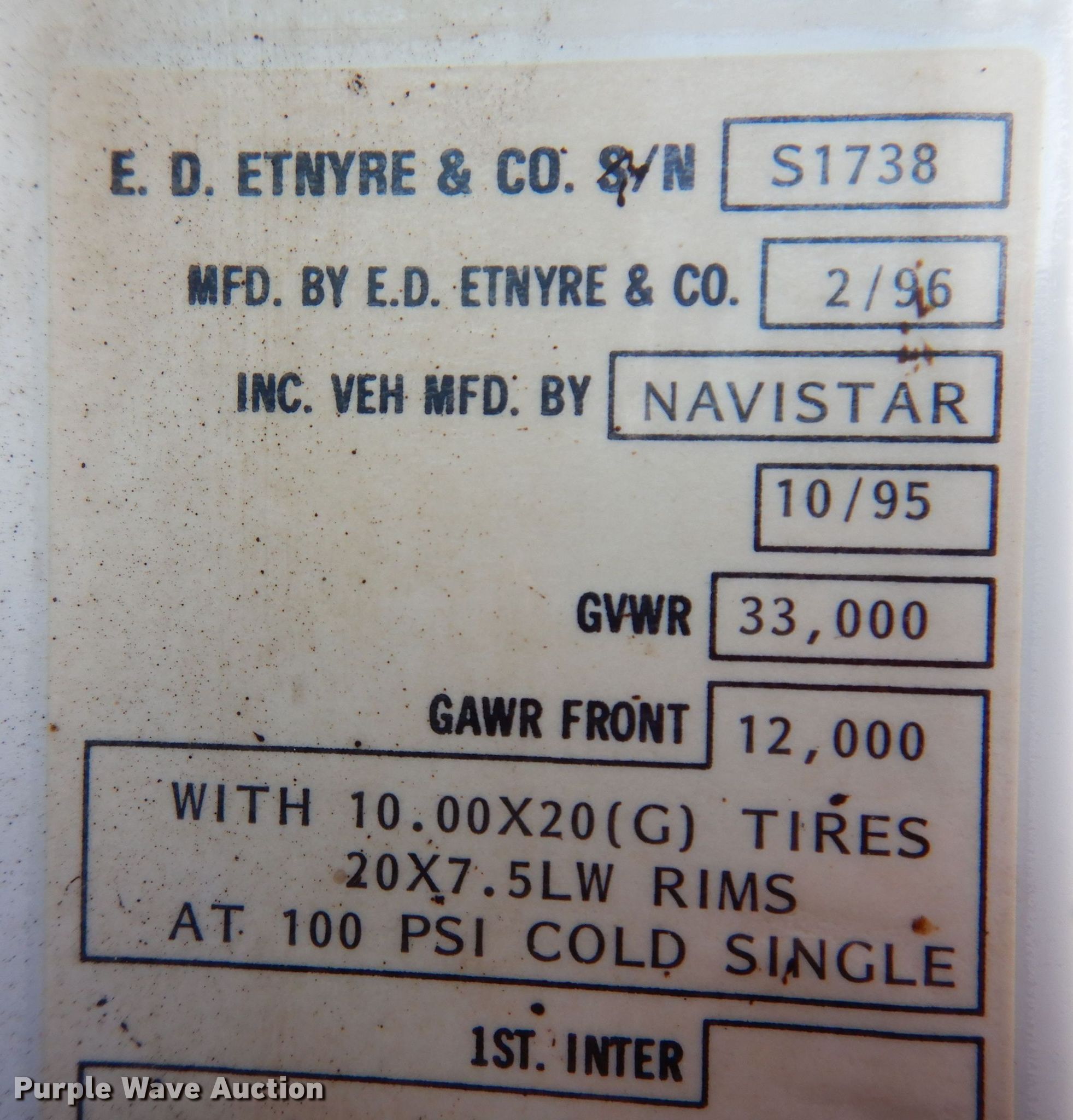 1996 International 4700 oil distributor truck. Miles: 16,367 on odometer, VIN: 1HTSCAAN1TH308111. Engine International DT466, Displacement: 7.6L, Cylinders: 6, Fuel type: Diesel. Transmission Spicer, Manual, Speed: 5, plus 2. Chassis Axles: Single, Suspension: Spring, Brakes: Air, PTO, GVWR: 33,000 lbs, Wheelbase: 188". Interior Heat, Auxiliary controls. Features Bed / tank Etnyre 8-2000, Serial: S-1738, Capacity: 2,000 gallons, 17' L x 96" W, Burner: LPG, Heat rating: 500 degrees, In-cab controls, Spray wand, Spray boom Width: 12', Folding, Nozzles: 36.. Tires Size: 11R22.5. Notes Air leak. Iowa title. Mileage has not been verified. Exempt will be written in the odometer disclosure on the title. Title distribution may be delayed up to 14 days from verification of funds. Blacktop Service Co.. 1648 Hwy 169. Fort Dodge, IA 50501