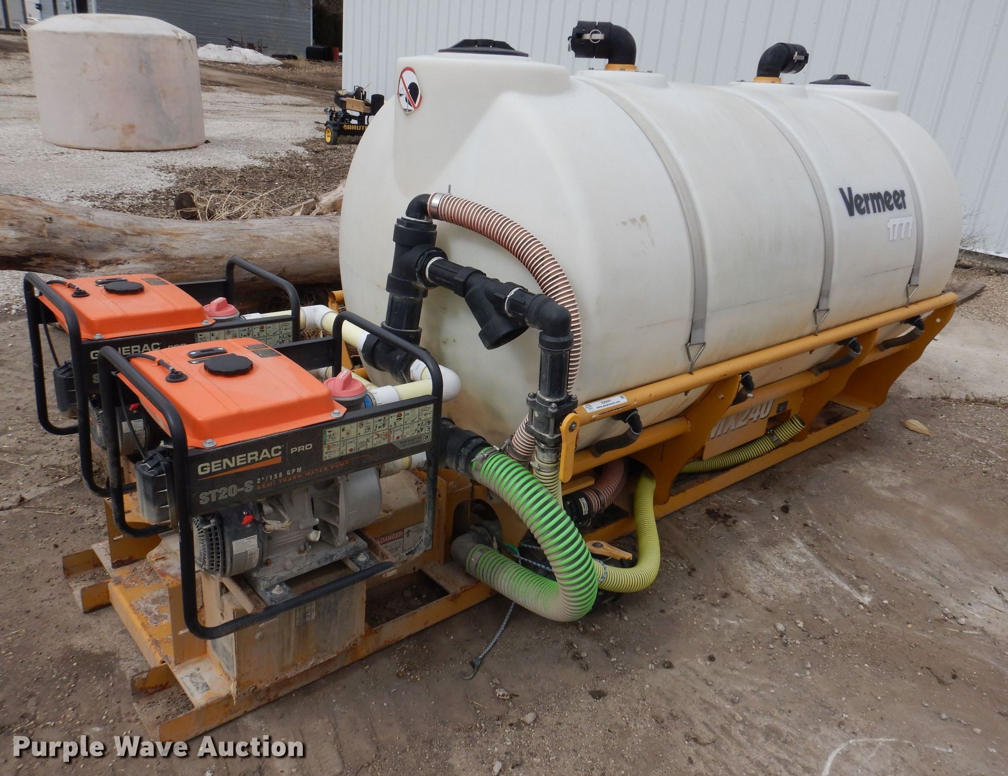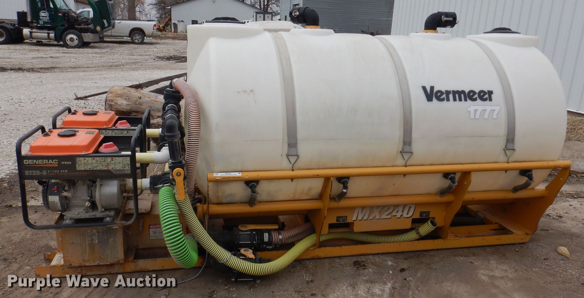 2016 Vermeer MX240 fluid mixer. Serial: 1VR6120P3GF003675. Features (2) pumps Generac Pro ST20-S, Engine Generac G-Force, Cylinders: 1, Displacement: 169 cc, Fuel type: Gas, Outlet: 2", GPM: 158. Martin Hildreth Co. Rockwell City, IA 50579