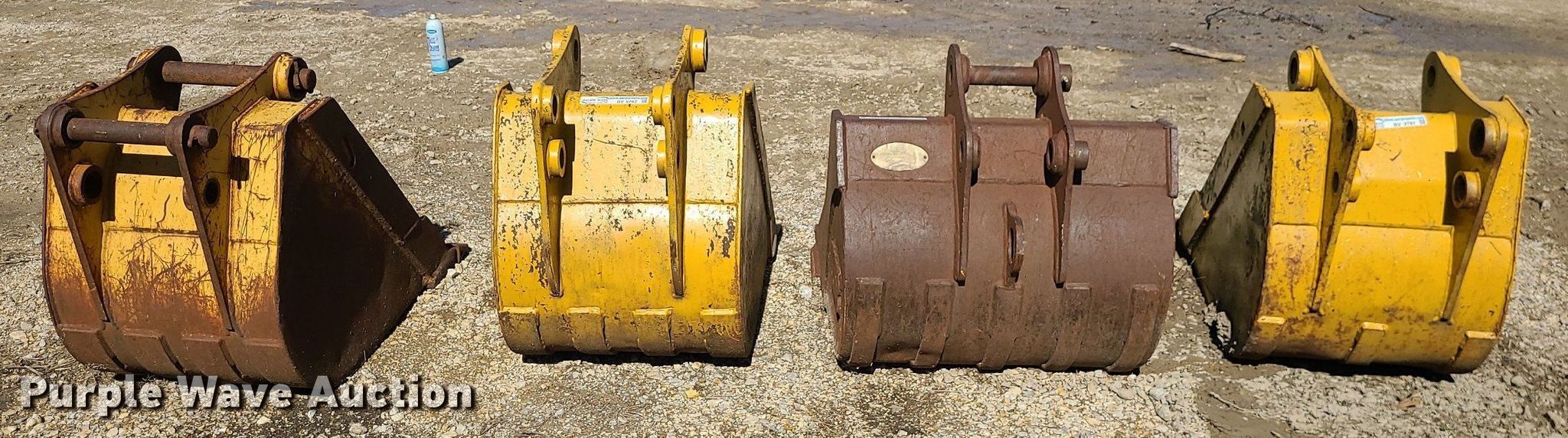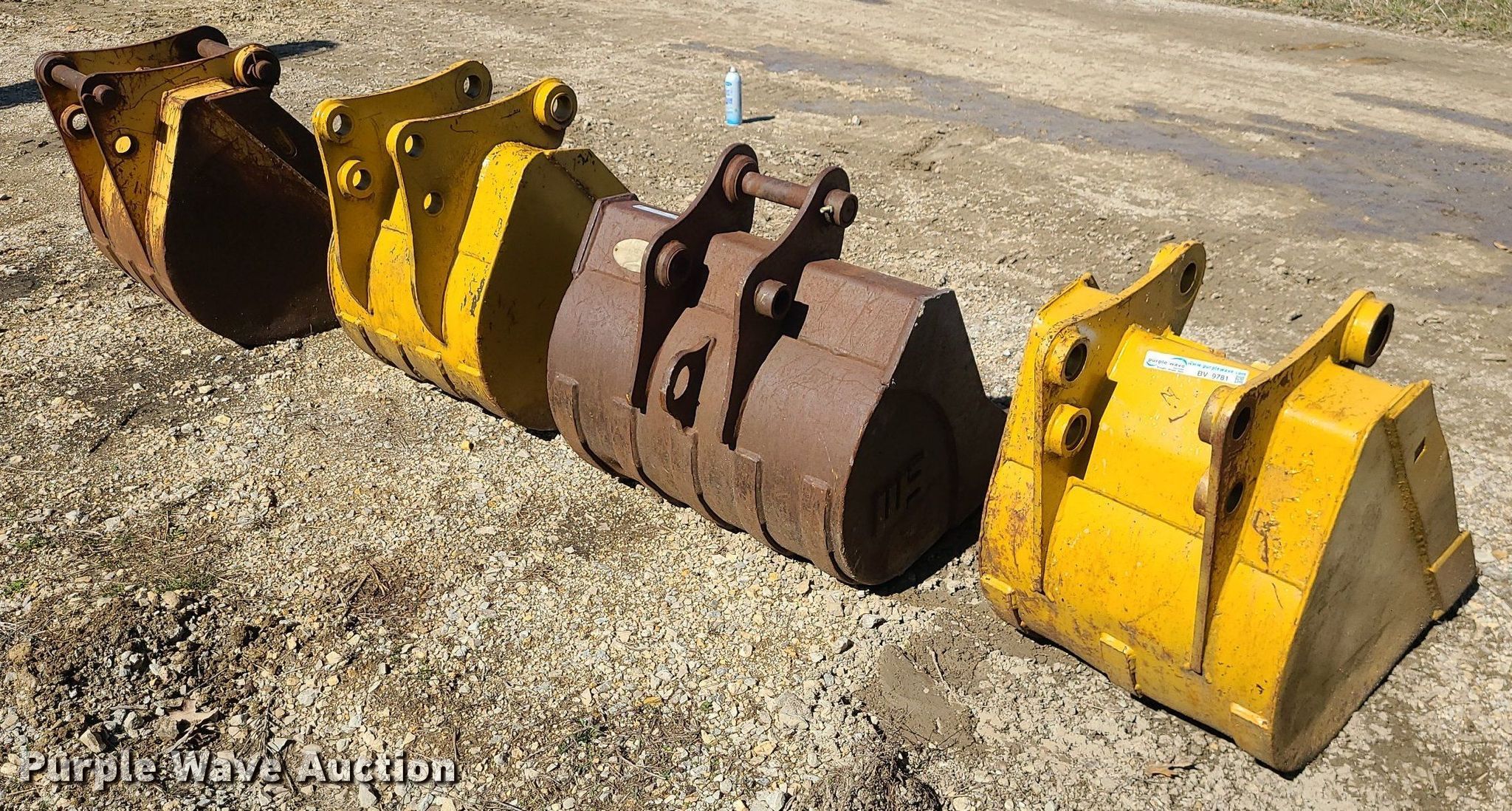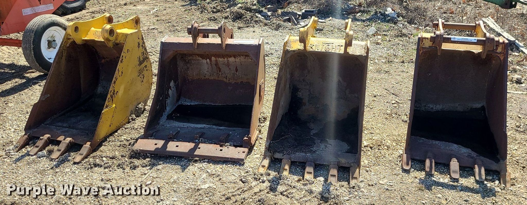 Purple Wave is selling a used Backhoe Attach. in Kansas. This item is a (4) backhoe buckets with the following: (3) 24" W, 30" W, Fits Caterpillar 416 backhoe