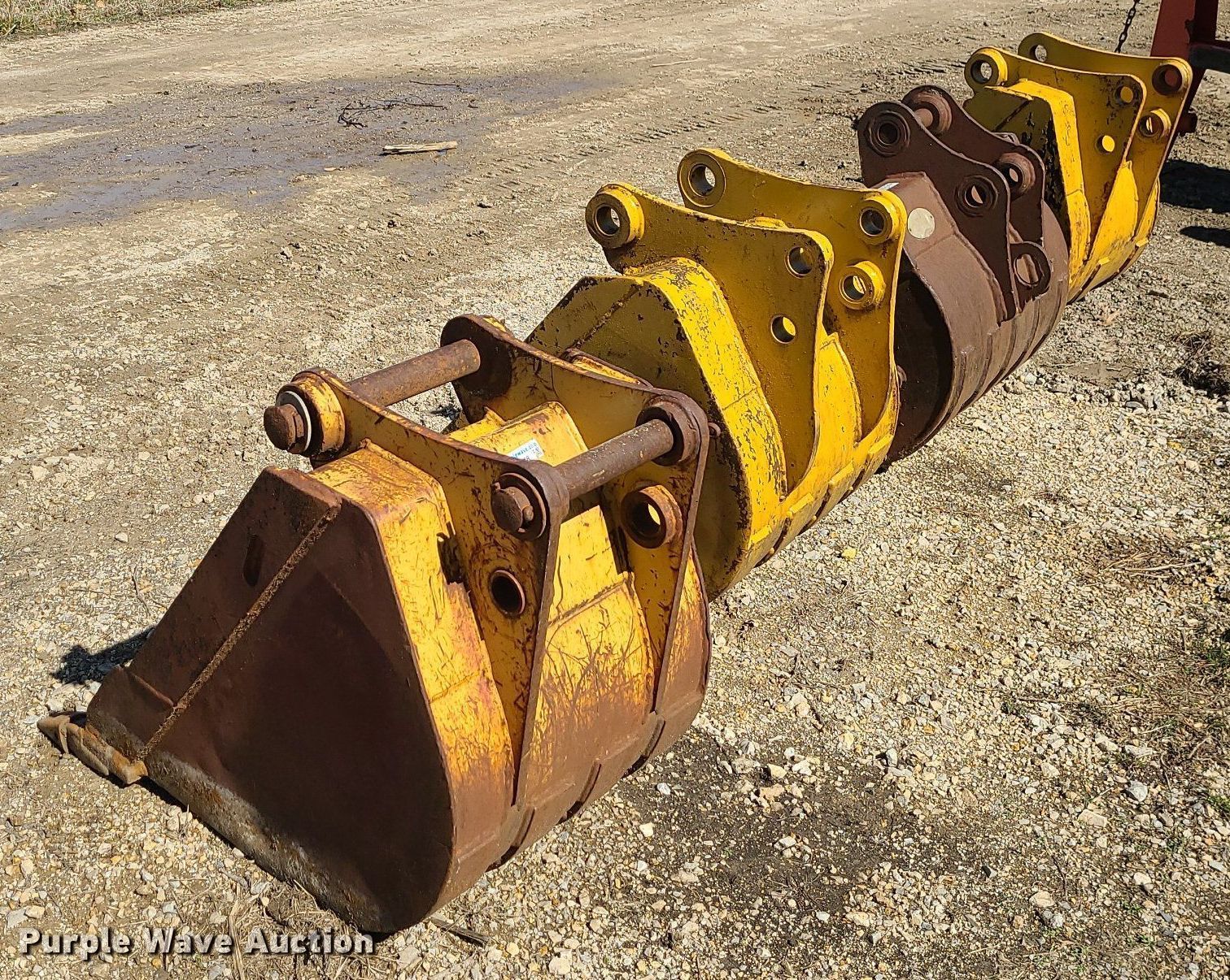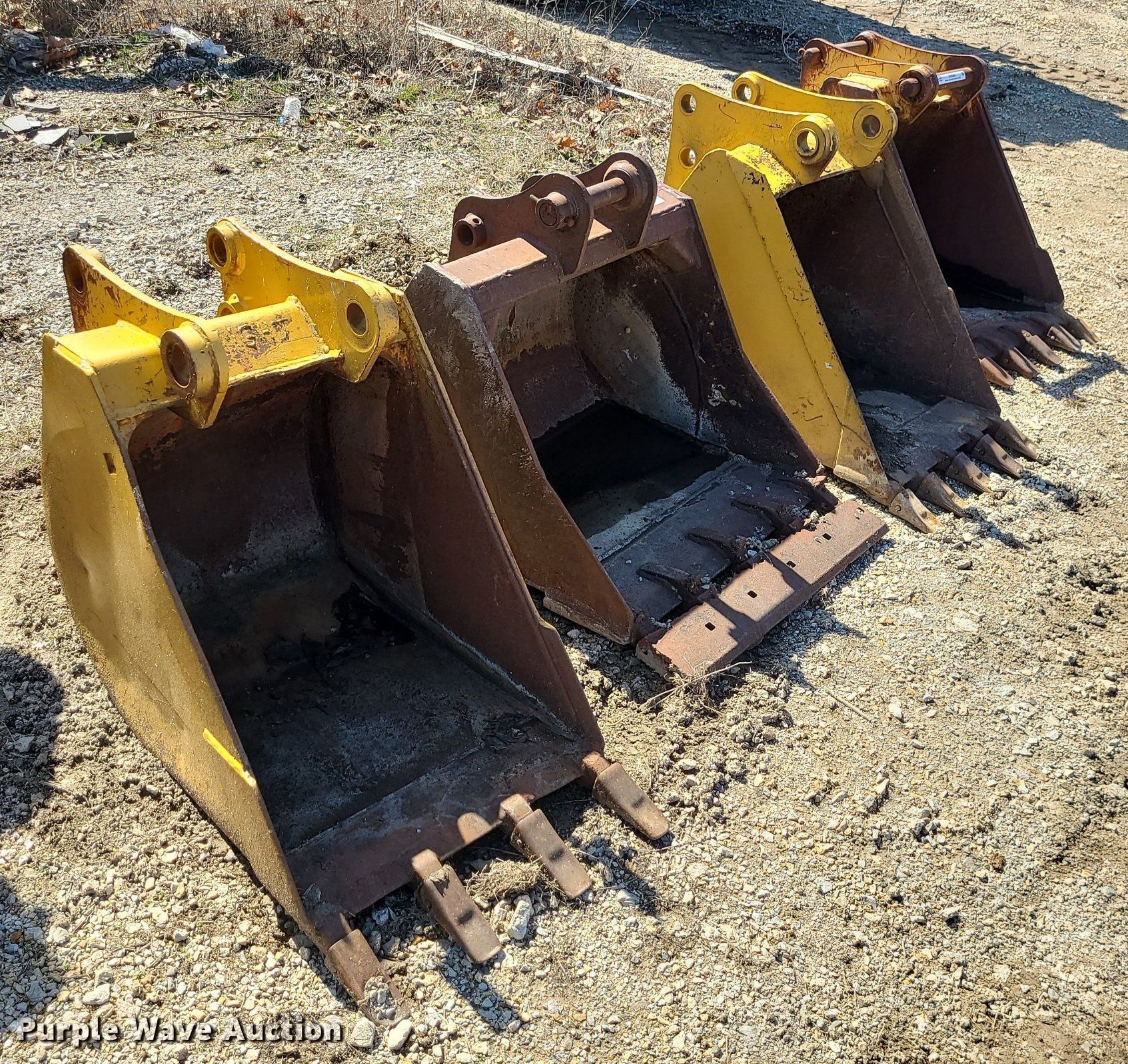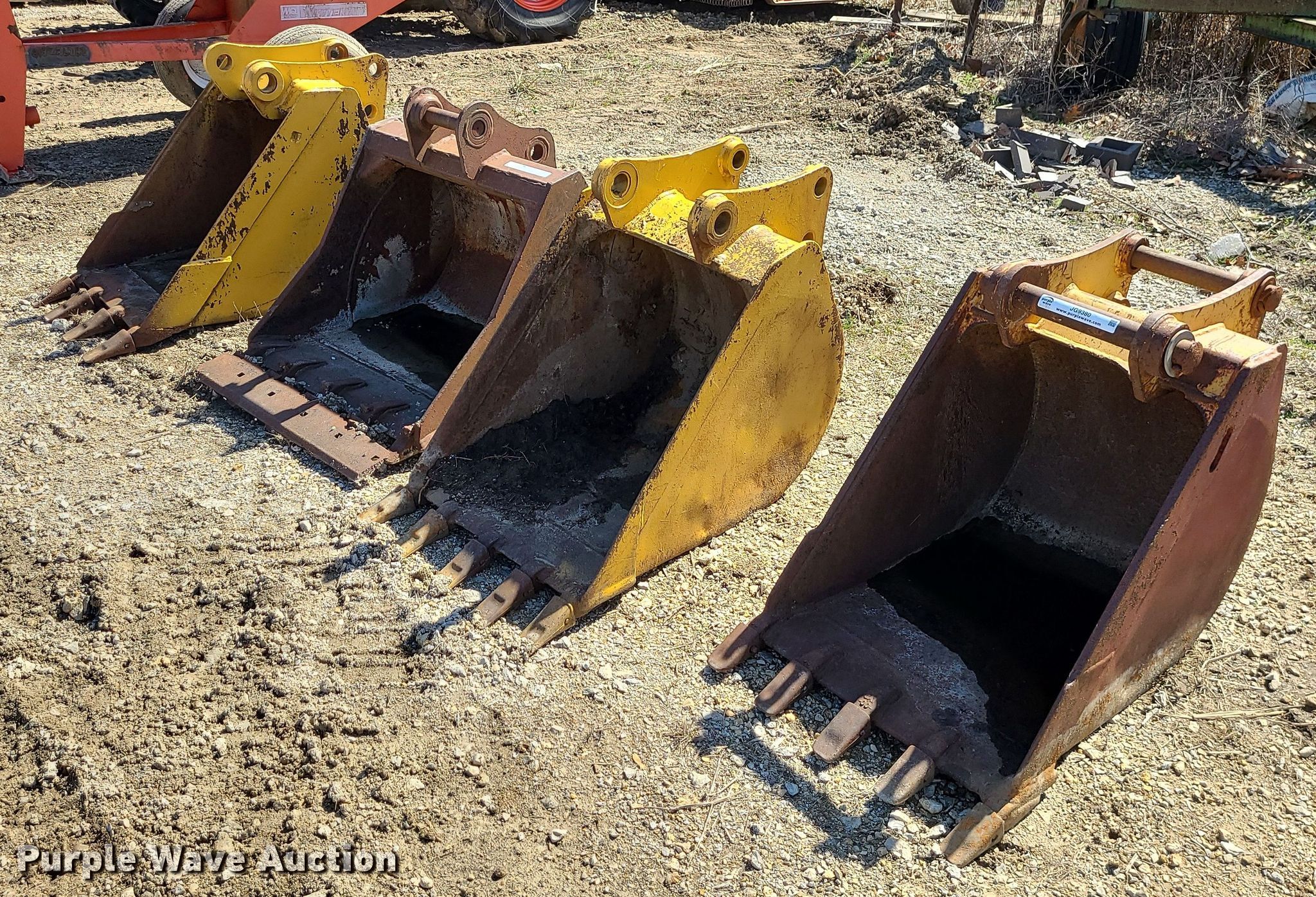 Purple Wave is selling a used Backhoe Attach. in Kansas. This item is a (4) backhoe buckets with the following: (3) 24" W, 30" W, Fits Caterpillar 416 backhoe