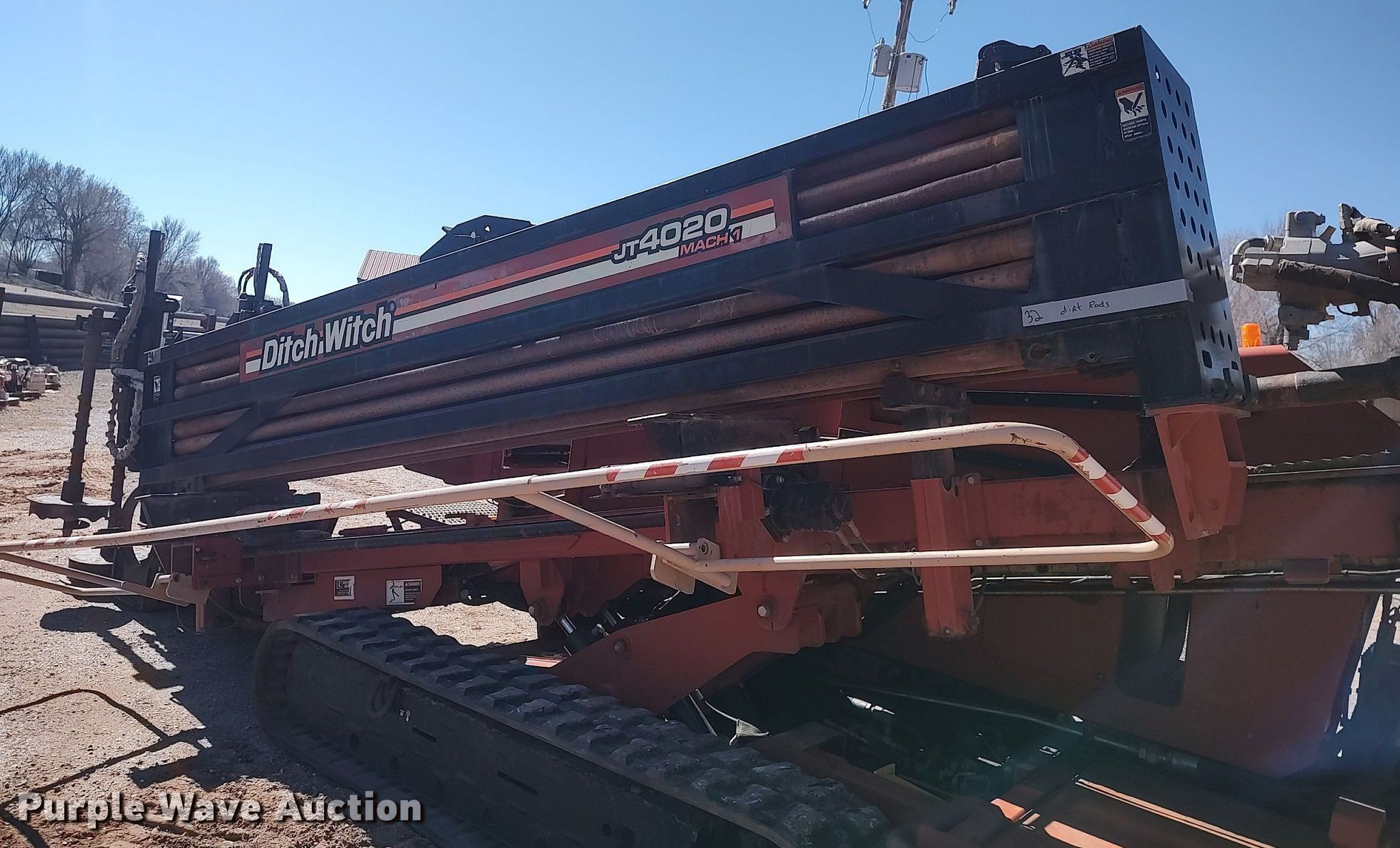 2007 Ditch Witch JT4020 Mach 1 directional boring unit. Hours: 572 on meter, Serial: CMWA40T3J70000019. Engine Cummins, Serial: 31000553, Cylinders: 6, Fuel type: Diesel. Operators station OROPS. Features Water pump Bean, Drill stems On drill: 32, Drill stem length: 15' Diameter: 3", Auto rod loader, Rear hydraulic stabilizers. Tracks Width: 16", Rubber. Notes Hour meter replaced at 1,195 hours. JMC Services. Cleo Springs, OK 73729