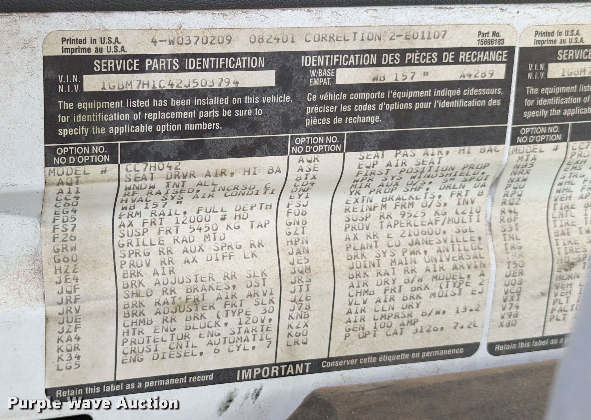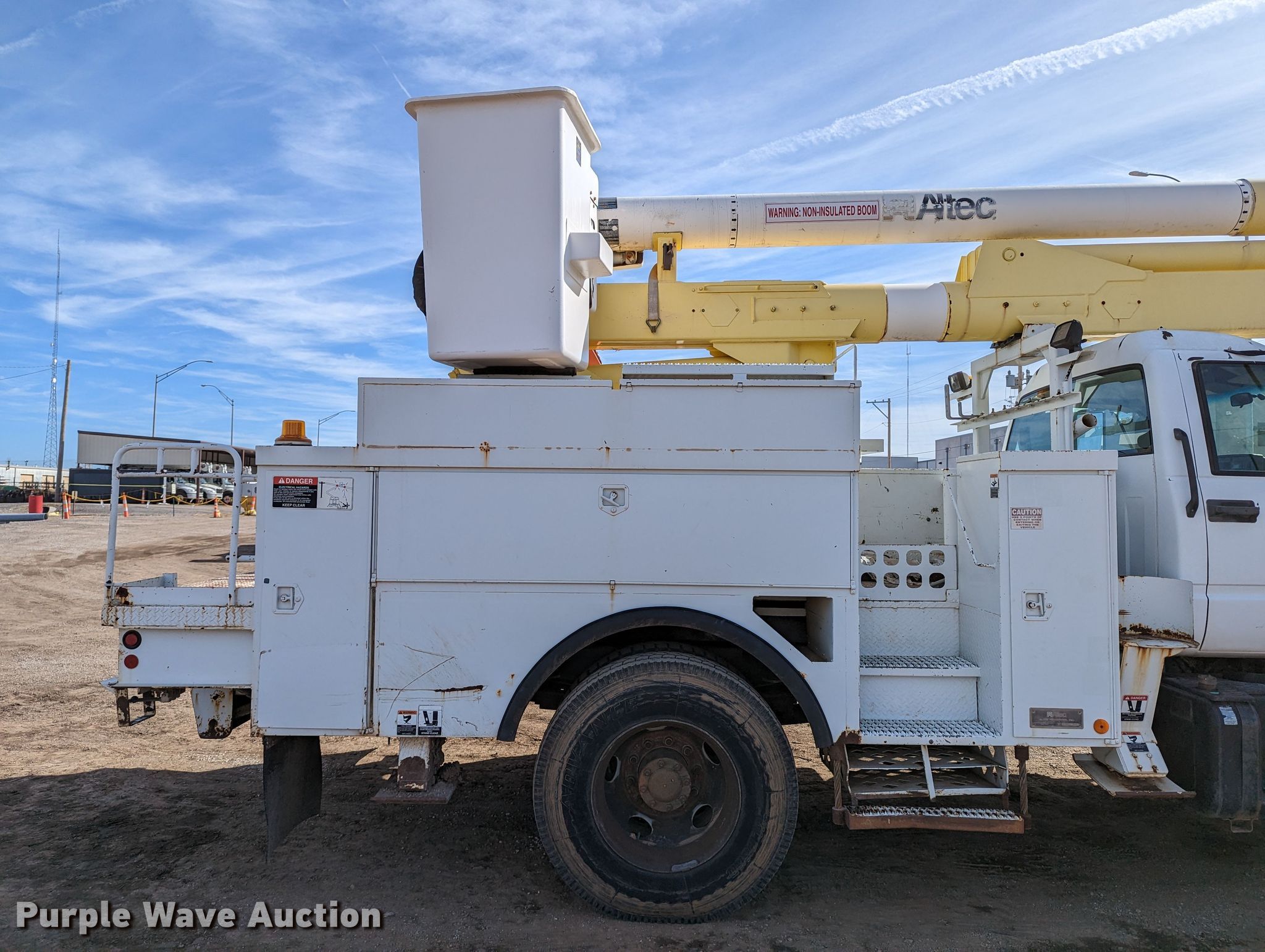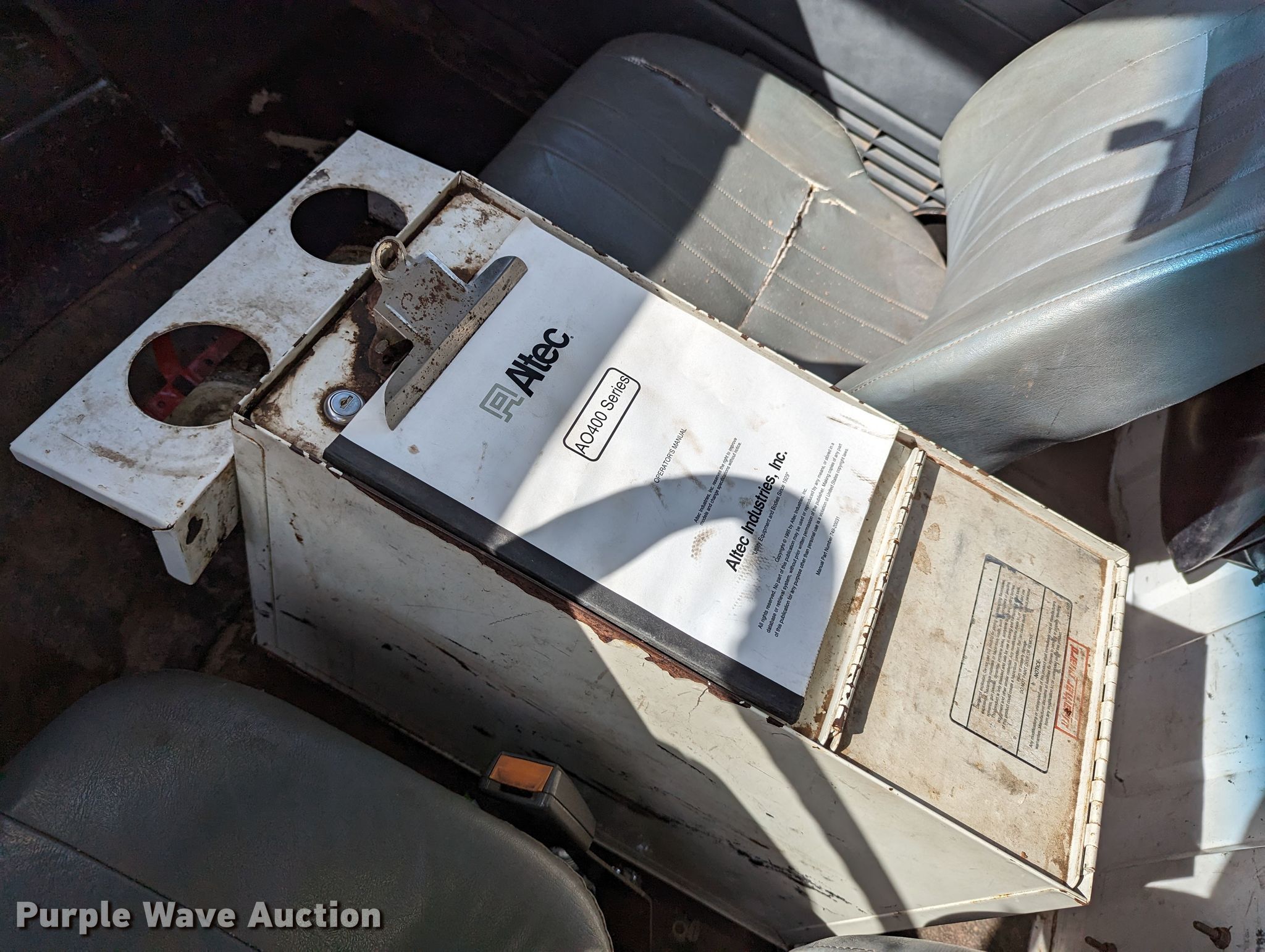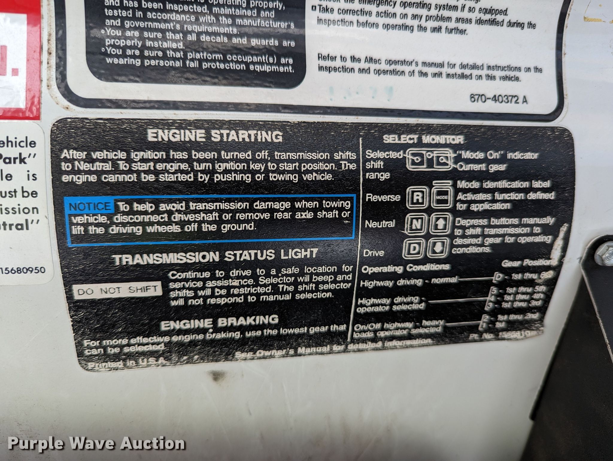 2002 Chevrolet C7500 bucket truck. Miles: 130,746 on odometer, Hours: 9,800 on meter, VIN: 1GBM7H1C42J503794, Unit #: 104015. Engine Caterpillar 3126, Serial: CKM28504, Displacement: 7.2L, Cylinders: 6, Fuel type: Diesel. Transmission Allison, Automatic. Chassis Axles: Single, Suspension: Spring, Brakes: Air, PTO, GVWR: 33,000 lbs, Wheelbase: 156". Interior AC, Heat, Cruise control, Auxiliary controls. Features Bed Altec, Serial: 37-75008, 13' L x 96" W, Boom Altec A0442, Serial: 1001BD0498, Maximum lift capacity: 400 lbs, Maximum lift height: 42', Boom type: Articulating, Man basket, Boom controls Ground, Platform/ basket, Material handler, Certification valid through: 12/2023. Tires Size: 11R22.5. Oklahoma title. Title distribution may be delayed up to 14 days from verification of funds. TLS Group, Inc.. 13305 N Santa Fe Ave. Oklahoma City, OK 73114