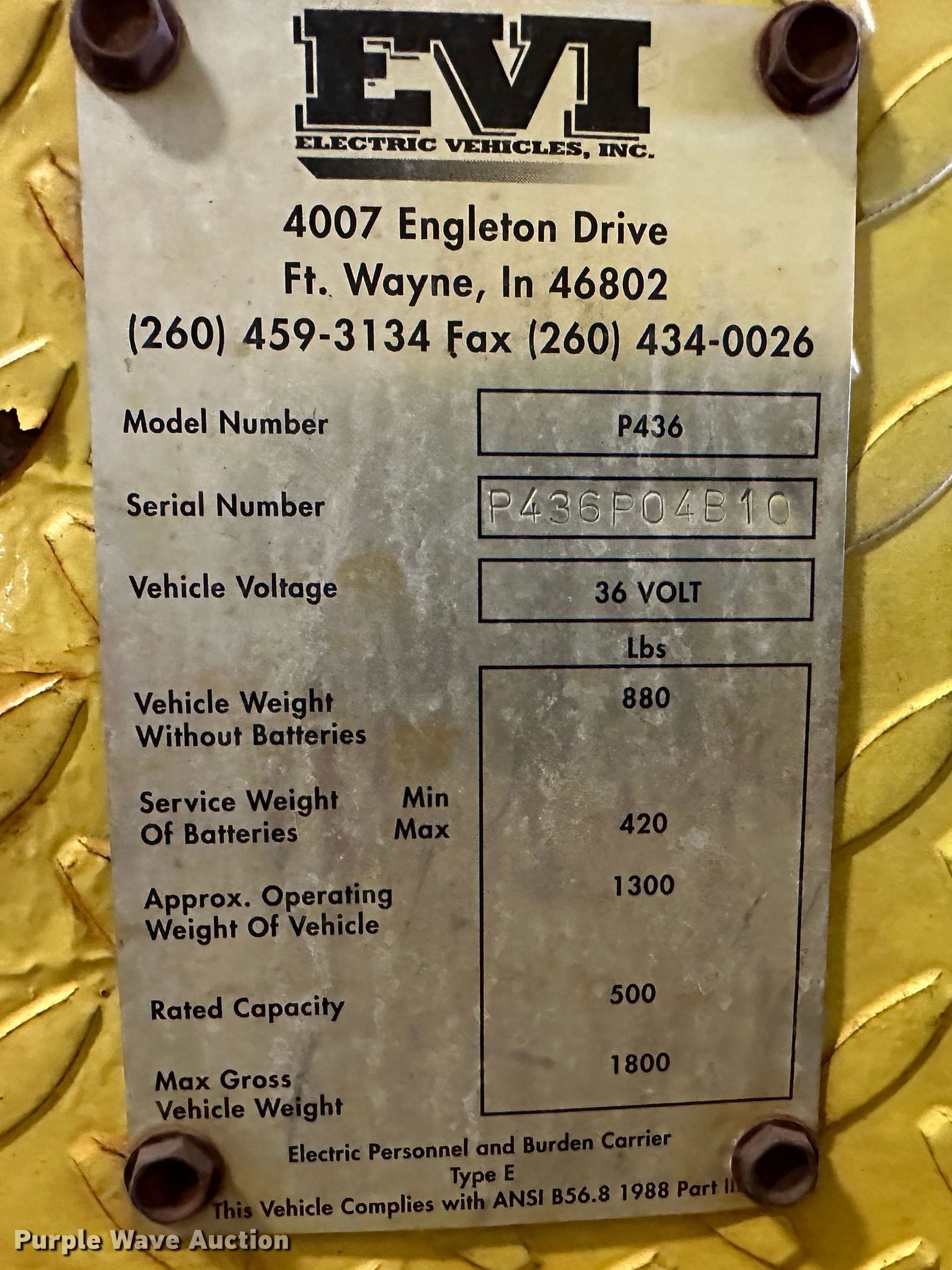 (2) EVI P436 utility carts. Serial: P436P04B10, Serial: P436P04B28. Engine Electric start. Electric Motor Volts: 36. Transmission Automatic. Operators station Canopy, Passengers: 1. Tires Size: 4.80-8. Notes Unknown operating condition. Envirotec Excavating. 11770 S Pierceville Rd. Pierceville, KS 67868