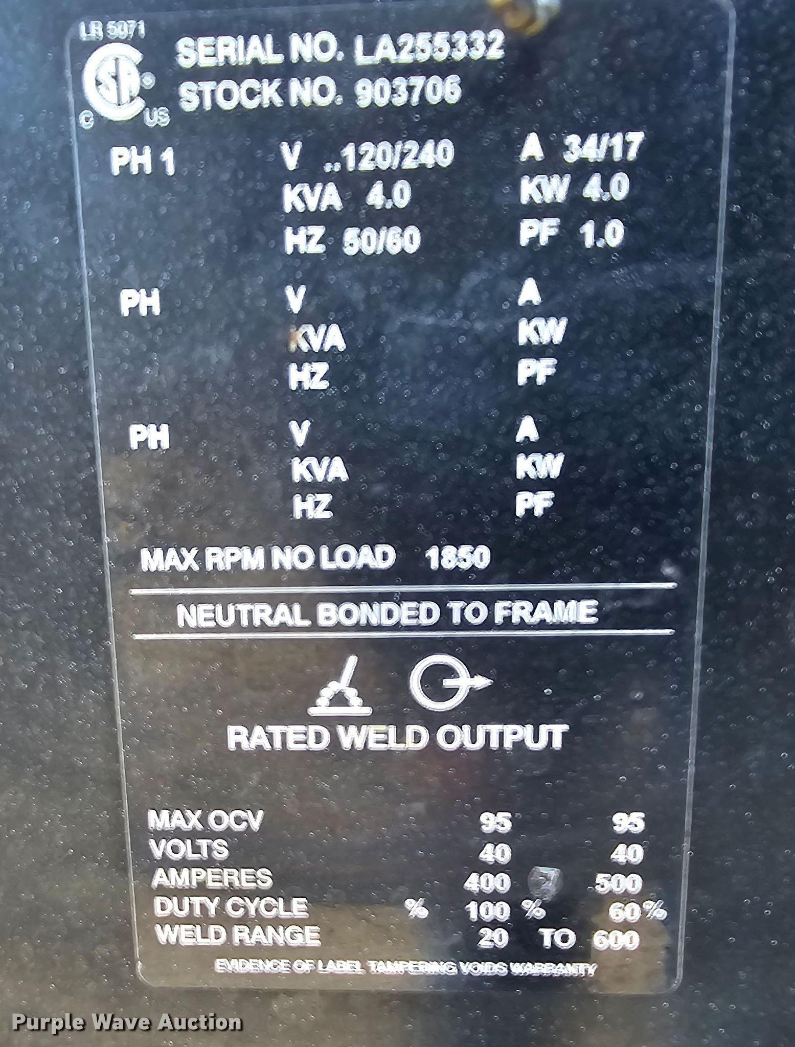 Miller Big Blue 402P welder/generator. Hours: 2,742 on meter, Serial: LA255332. Features Welder Capabilities: CC, CV, DC, Generator kVA: 4, kW: 4, Phase: Single, 240V outlets: 1, 120V outlets: 1. Trailer 10.5' L x 60" W, Suspension: Spring, Axles: Single, Tire size: 205/75R14. Transfer of ownership documentation will be a bill of sale which will be assigned and distributed by the seller. Jordan Machinery /S & N Auto Sales. 25050 US Hwy 275. Waterloo, NE 68069