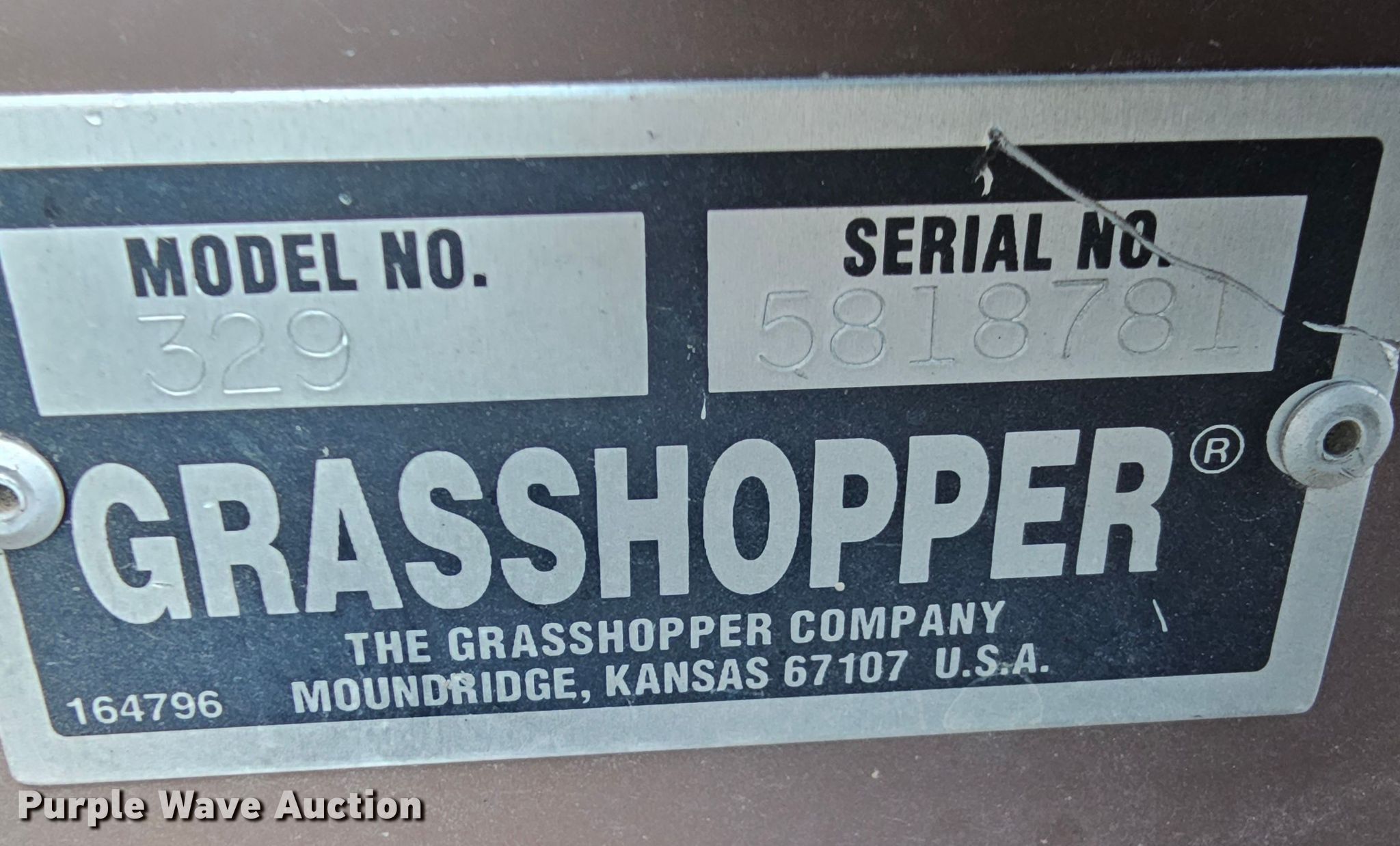 Grasshopper 329 ZTR lawn mower. Hours: 737 on meter, Cutting width: 60", Serial: 5818781. Engine Cylinders: 3, Fuel type: Gas. Transmission Hydrostatic. Tires Front: 13x6.50-6, Rear: 24x12.00-12. Jordan Machinery /S & N Auto Sales. 25050 US Hwy 275. Waterloo, NE 68069