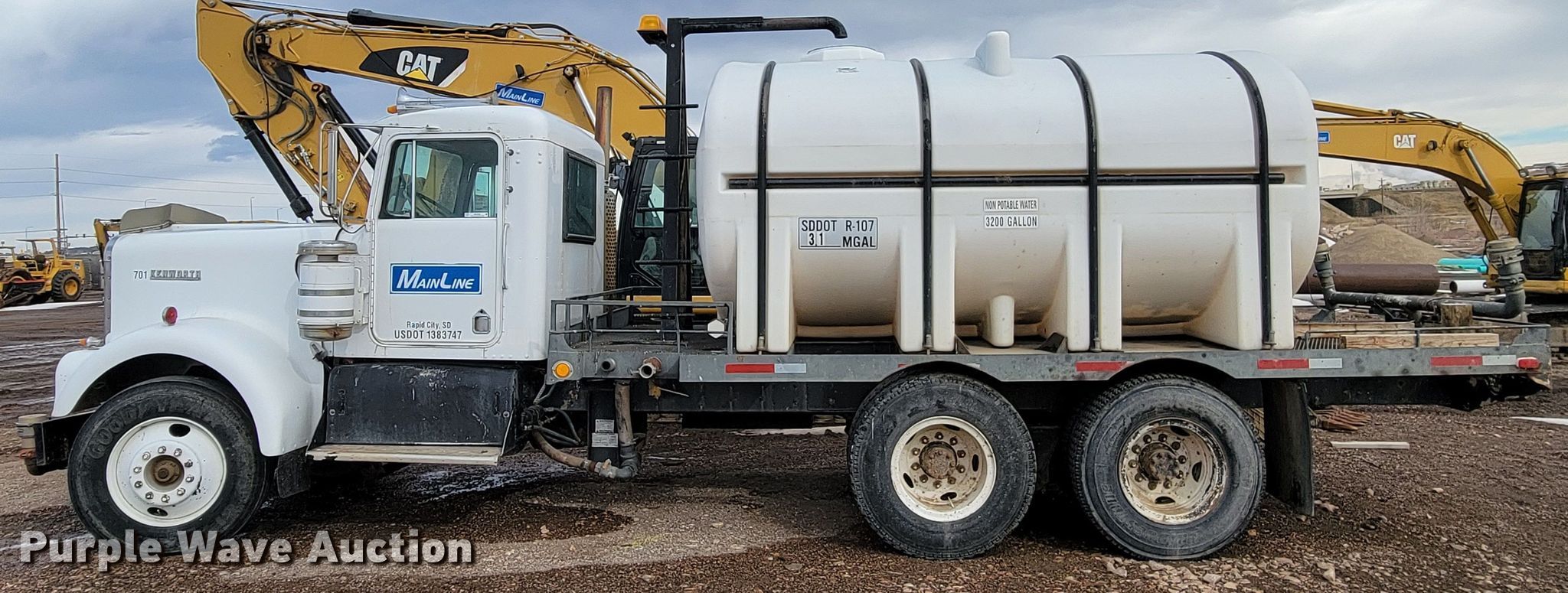 1972 Kenworth W925 tank truck. Miles: 400,743 on odometer, Hours: 37,056 on meter, VIN: 124246, Unit #: 701. Engine Cylinders: 6, Fuel type: Diesel. Transmission Manual. Chassis Axles: Tandem, Differential lock: Inter-axle, Suspension: Spring over walking beam, Brakes: Air, PTO. Interior Heat. Features Bed / tank Capacity: 3,200 gallons, 18' 2" L x 8' W, Spray bar: Front, Rear, Top fill. Tires Front: 11R24.5, Rear: 10.00-R20. South Dakota title. Title distribution may be delayed up to 14 days from verification of funds. Mainline Contracting Inc.. 4900 SD-79. Rapid City, SD 57702